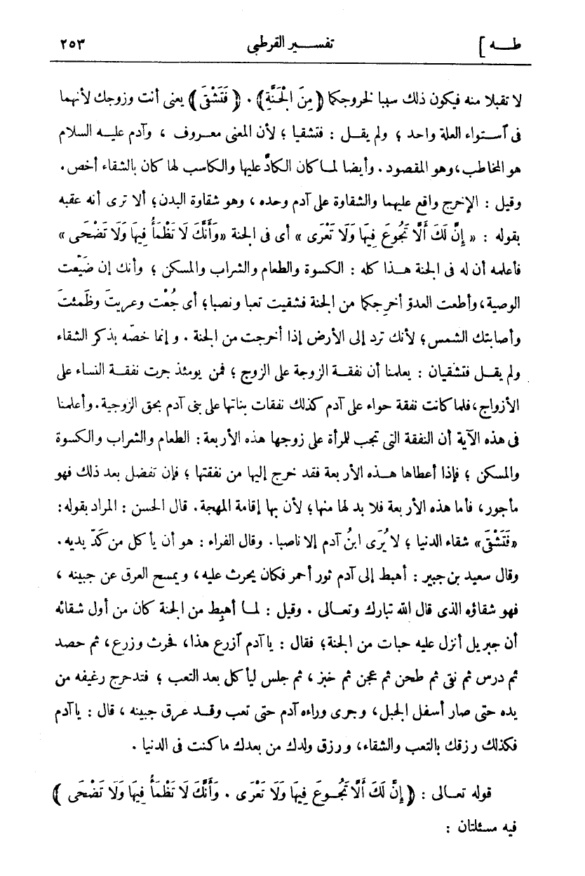 لَا تَقْبَلَا مِنْهُ فَيَكُونَ ذَلِكَ سَبَبًا لِخُرُوجِكُمَا" مِنَ الْجَنَّةِ"" فَتَشْقى ٢٠: ١١٧" يَعْنِي أَنْتَ وَزَوْجُكَ لِأَنَّهُمَا فِي اسْتِوَاءِ الْعِلَّةِ وَاحِدٌ، وَلَمْ يَقُلْ: فَتَشْقَيَا لِأَنَّ الْمَعْنَى مَعْرُوفٌ، وَآدَمُ عَلَيْهِ السَّلَامُ هُوَ الْمُخَاطَبُ، وَهُوَ الْمَقْصُودُ. وَأَيْضًا لَمَّا كَانَ الْكَادَّ عَلَيْهَا وَالْكَاسِبَ لَهَا كَانَ بِالشَّقَاءِ أَخَصُّ. وَقِيلَ: الا خرج وَاقِعٌ عَلَيْهِمَا وَالشَّقَاوَةُ عَلَى آدَمَ وَحْدَهُ، وَهُوَ شَقَاوَةُ الْبَدَنِ، أَلَا تَرَى أَنَّهُ عَقَّبَهُ بِقَوْلِهِ:" إِنَّ لَكَ أَلَّا تَجُوعَ فِيها وَلا تَعْرى ٢٠: ١١٨" أي في الجنة" وَأَنَّكَ لا تَظْمَؤُا فِيها وَلا تَضْحى ٢٠: ١١٩" فَأَعْلَمَهُ أَنَّ لَهُ فِي الْجَنَّةِ هَذَا كُلَّهُ: الْكِسْوَةُ وَالطَّعَامُ وَالشَّرَابُ وَالْمَسْكَنُ، وَأَنَّكَ إِنْ ضَيَّعْتَ الْوَصِيَّةَ، وَأَطَعْتَ الْعَدُوَّ أُخْرِجُكُمَا مِنَ الْجَنَّةِ فَشَقِيتَ تَعَبًا وَنَصَبًا، أَيْ جُعْتَ وَعَرِيتَ وَظَمِئْتَ وَأَصَابَتْكَ الشَّمْسُ، لِأَنَّكَ تُرَدُّ إِلَى الْأَرْضِ إِذَا أُخْرِجْتَ مِنَ الْجَنَّةِ. وَإِنَّمَا خَصَّهُ بِذِكْرِ الشَّقَاءِ وَلَمْ يَقُلْ فَتَشْقَيَانِ: يُعَلِّمُنَا أَنَّ نَفَقَةَ الزَّوْجَةِ عَلَى الزَّوْجِ، فَمِنْ يَوْمِئِذٍ جَرَتْ نَفَقَةُ النِّسَاءِ عَلَى الْأَزْوَاجِ، فَلَمَّا كَانَتْ نَفَقَةُ حَوَّاءَ عَلَى آدَمَ كَذَلِكَ نَفَقَاتُ بَنَاتِهَا عَلَى بَنِي آدَمَ بِحَقِّ الزَّوْجِيَّةِ. وَأَعْلَمَنَا فِي هَذِهِ الْآيَةِ أَنَّ النَّفَقَةَ الَّتِي تَجِبُ لِلْمَرْأَةِ عَلَى زَوْجِهَا هَذِهِ الْأَرْبَعَةُ: الطَّعَامُ وَالشَّرَابُ وَالْكِسْوَةُ وَالْمَسْكَنُ، فَإِذَا أَعْطَاهَا هَذِهِ الْأَرْبَعَةَ فَقَدْ خَرَجَ إِلَيْهَا مِنْ نَفَقَتِهَا، فَإِنْ تَفَضَّلَ بَعْدَ ذَلِكَ فَهُوَ مَأْجُورٌ، فَأَمَّا هَذِهِ الْأَرْبَعَةُ فَلَا بُدَّ لَهَا مِنْهَا، لِأَنَّ بِهَا إِقَامَةَ الْمُهْجَةِ. قَالَ الْحَسَنُ الْمُرَادُ بِقَوْلِهِ:" فَتَشْقى ٢٠: ١١٧" شَقَاءَ الدُّنْيَا، لَا يُرَى ابْنُ آدَمَ إِلَّا نَاصِبًا. وَقَالَ الْفَرَّاءُ: هُوَ أَنْ يَأْكُلَ مِنْ كَدِّ يَدَيْهِ. وَقَالَ سَعِيدُ بْنُ جُبَيْرٍ: أُهْبِطَ إِلَى آدَمَ ثَوْرٌ أَحْمَرُ فَكَانَ يَحْرُثُ عَلَيْهِ، وَيَمْسَحُ الْعَرَقَ عَنْ جَبِينِهِ، فَهُوَ شَقَاؤُهُ الَّذِي قَالَ اللَّهُ تَبَارَكَ وَتَعَالَى. وَقِيلَ: لَمَّا أُهْبِطَ مِنَ الْجَنَّةِ كَانَ مِنْ أَوَّلِ شَقَائِهِ أَنَّ جِبْرِيلَ أَنْزَلَ عَلَيْهِ حَبَّاتٍ مِنَ الْجَنَّةِ، فَقَالَ: يَا آدَمُ ازْرَعْ هَذَا، فَحَرَثَ وَزَرَعَ، ثُمَّ حَصَدَ ثُمَّ دَرَسَ ثُمَّ نَقَّى ثُمَّ طَحَنَ ثُمَّ عَجَنَ ثُمَّ خَبَزَ، ثُمَّ جَلَسَ لِيَأْكُلَ بَعْدَ التَّعَبِ، فَتَدَحْرَجَ رَغِيفُهُ مِنْ يَدِهِ حَتَّى صَارَ أَسْفَلَ الْجَبَلِ، وَجَرَى وَرَاءَهُ آدَمُ حَتَّى تَعِبَ وَقَدْ عَرِقَ جَبِينُهُ، قَالَ: يَا آدَمُ فَكَذَلِكَ رِزْقُكَ بِالتَّعَبِ وَالشَّقَاءِ، وَرِزْقُ وَلَدِكَ مِنْ بَعْدِكَ مَا كُنْتَ فِي الدُّنْيَا. قَوْلُهُ تَعَالَى: (إِنَّ لَكَ أَلَّا تَجُوعَ فِيها وَلا تَعْرى. وَأَنَّكَ لا تَظْمَؤُا فِيها وَلا تَضْحى) ٢٠: ١١٩ - ١١٨ فِيهِ مَسْأَلَتَانِ: