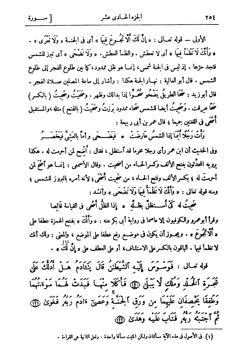 الْأُولَى- قَوْلُهُ تَعَالَى: (إِنَّ لَكَ أَلَّا تَجُوعَ فِيها) ٢٠: ١١٨ أَيْ فِي الْجَنَّةِ (وَلا تَعْرى) ٢٠: ١١٨." وَأَنَّكَ لا تَظْمَؤُا فِيها ٢٠: ١١٩" أَيْ لَا تَعْطَشُ. وَالظَّمَأُ الْعَطَشُ." وَلا تَضْحى ٢٠: ١١٩" أَيْ تَبْرُزُ لِلشَّمْسِ فَتَجِدُ حَرَّهَا. إِذْ لَيْسَ فِي الْجَنَّةِ شَمْسٌ، إِنَّمَا هُوَ ظِلٌّ مَمْدُودٌ، كَمَا بَيْنَ طُلُوعِ الْفَجْرِ إِلَى طُلُوعِ الشَّمْسِ. قَالَ أَبُو الْعَالِيَةِ: نَهَارُ الْجَنَّةِ هَكَذَا: وَأَشَارَ إِلَى سَاعَةِ الْمُصَلِّينَ صَلَاةَ الْفَجْرِ. قَالَ أَبُو زَيْدٍ: ضَحَا الطَّرِيقُ يَضْحُو ضُحُوًّا إِذَا بَدَا لَكَ وَظَهَرَ. وَضَحَيْتُ وَضَحِيتُ" بِالْكَسْرِ" ضَحًا عَرِقْتُ. وَضَحِيتُ أَيْضًا لِلشَّمْسِ ضَحَاءً مَمْدُودٌ بَرَزْتُ وَضَحَيْتُ" بِالْفَتْحِ" مِثْلَهُ، وَالْمُسْتَقْبَلُ أَضْحَى فِي اللُّغَتَيْنِ جَمِيعًا، قَالَ عُمَرَ بْنِ أَبِي رَبِيعَةَ: