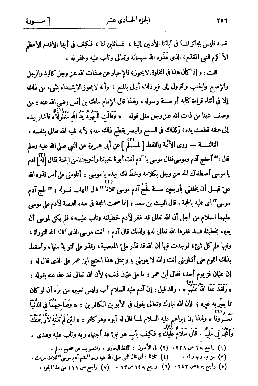 نَفْسِهِ فَلَيْسَ بِجَائِزٍ لَنَا فِي آبَائِنَا الْأَدْنِينَ إِلَيْنَا، الْمُمَاثِلِينَ لَنَا، فَكَيْفَ فِي أَبِينَا الْأَقْدَمِ الْأَعْظَمِ الْأَكْرَمِ النَّبِيِّ الْمُقَدَّمِ، الَّذِي عَذَرَهُ اللَّهُ سُبْحَانَهُ وَتَعَالَى وَتَابَ عَلَيْهِ وَغَفَرَ لَهُ. قُلْتُ: وَإِذَا كَانَ هَذَا فِي الْمَخْلُوقِ لَا يَجُوزُ، فَالْإِخْبَارُ عَنْ صِفَاتِ اللَّهِ عَزَّ وَجَلَّ كَالْيَدِ وَالرِّجْلِ وَالْإِصْبَعِ وَالْجَنْبِ وَالنُّزُولِ إِلَى غَيْرِ ذَلِكَ أَوْلَى بِالْمَنْعِ، وَأَنَّهُ لَا يَجُوزُ الِابْتِدَاءُ بِشَيْءٍ مِنْ ذَلِكَ إِلَّا فِي أَثْنَاءِ قِرَاءَةِ كِتَابِهِ أَوْ سُنَّةِ رَسُولِهِ، وَلِهَذَا قَالَ الْإِمَامُ مَالِكُ بْنُ أَنَسٍ رَضِيَ اللَّهُ عَنْهُ: مَنْ وَصَفَ شَيْئًا مِنْ ذَاتِ اللَّهِ عَزَّ وَجَلَّ مِثْلَ قوله:" وَقالَتِ الْيَهُودُ يَدُ اللَّهِ مَغْلُولَةٌ" «١» [المائدة ٦٤] فَأَشَارَ بِيَدِهِ إِلَى عُنُقِهِ قُطِعَتْ يَدُهُ، وَكَذَلِكَ فِي السَّمْعِ وَالْبَصَرِ يُقْطَعُ ذَلِكَ مِنْهُ، لِأَنَّهُ شَبَّهَ اللَّهَ تَعَالَى بِنَفْسِهِ. الثَّالِثَةُ- رَوَى الْأَئِمَّةُ واللفظ [المسلم «٢»] عَنْ أَبِي هُرَيْرَةَ عَنِ النَّبِيِّ صَلَّى اللَّهُ عَلَيْهِ وَسَلَّمَ قَالَ:" احْتَجَّ آدَمُ وَمُوسَى فَقَالَ مُوسَى يَا آدَمُ أَنْتَ أَبُونَا خَيَّبْتَنَا وَأَخْرَجْتَنَا من الجنة فقال [له «٣»] آدَمُ يَا مُوسَى اصْطَفَاكَ اللَّهُ عَزَّ وَجَلَّ بِكَلَامِهِ وَخَطَّ لَكَ بِيَدِهِ يَا مُوسَى: أَتَلُومُنِي عَلَى أَمْرٍ قَدَّرَهُ اللَّهُ عَلَيَّ قَبْلَ أَنْ يَخْلُقَنِي بِأَرْبَعِينَ سَنَةً فَحَجَّ آدَمُ مُوسَى ثَلَاثًا" «٤» قَالَ الْمُهَلَّبُ قَوْلُهُ:" فَحَجَّ آدَمُ مُوسَى" أَيْ غَلَبَهُ بِالْحُجَّةِ. قَالَ اللَّيْثُ بْنُ سَعْدٍ: إِنَّمَا صَحَّتِ الْحُجَّةُ فِي هَذِهِ الْقِصَّةِ لِآدَمَ عَلَى مُوسَى عَلَيْهِمَا السَّلَامُ مِنْ أَجْلِ أَنَّ اللَّهَ تَعَالَى قَدْ غَفَرَ لِآدَمَ خَطِيئَتَهُ وَتَابَ عَلَيْهِ، فَلَمْ يَكُنْ لِمُوسَى أَنْ يُعَيِّرَهُ بِخَطِيئَةٍ قَدْ غَفَرَهَا اللَّهُ تَعَالَى لَهُ، وَلِذَلِكَ قَالَ آدَمُ: أَنْتَ مُوسَى الَّذِي أَتَاكَ اللَّهُ التَّوْرَاةَ، وَفِيهَا علم كل شي، فَوَجَدْتَ فِيهَا أَنَّ اللَّهَ قَدْ قَدَّرَ عَلَيَّ الْمَعْصِيَةَ، وَقَدَّرَ عَلَيَّ التَّوْبَةَ مِنْهَا، وَأَسْقَطَ بِذَلِكَ اللَّوْمَ عَنِّي أَفَتَلُومُنِي أَنْتَ وَاللَّهُ لَا يَلُومُنِي وَبِمِثْلِ هَذَا احْتَجَّ ابْنُ عُمَرَ عَلَى الَّذِي قَالَ لَهُ: إِنَّ عُثْمَانَ فَرَّ يَوْمَ أُحُدٍ، فَقَالَ ابْنُ عُمَرَ: مَا عَلَى عُثْمَانَ ذَنْبٌ لِأَنَّ اللَّهَ تَعَالَى قَدْ عَفَا عَنْهُ بِقَوْلِهِ:" وَلَقَدْ عَفَا اللَّهُ عَنْهُمْ" «٥» [آل عمران: ١٥٥]. وَقَدْ قِيلَ: إِنَّ آدَمَ عَلَيْهِ السَّلَامُ أَبٌ وَلَيْسَ تَعْيِيرُهُ مِنْ بِرِّهِ أَنْ لَوْ كَانَ مِمَّا يُعَيَّرُ بِهِ غَيْرُهُ، فَإِنَّ اللَّهَ تَبَارَكَ وَتَعَالَى يَقُولُ فِي الْأَبَوَيْنِ الْكَافِرَيْنِ:" وَصاحِبْهُما فِي الدُّنْيا مَعْرُوفاً" «٦» [لقمان: ١٥] وَلِهَذَا إِنَّ إِبْرَاهِيمَ عَلَيْهِ السَّلَامُ لَمَّا قَالَ لَهُ أَبُوهُ وَهُوَ كَافِرٌ:" لَئِنْ لَمْ تَنْتَهِ لَأَرْجُمَنَّكَ وَاهْجُرْنِي مَلِيًّا. قالَ سَلامٌ عَلَيْكَ" «٧» [مريم: ٤٦] فَكَيْفَ بِأَبٍ هُوَ نَبِيٌّ قَدِ اجْتَبَاهُ رَبُّهُ وتاب عليه وهدى.
