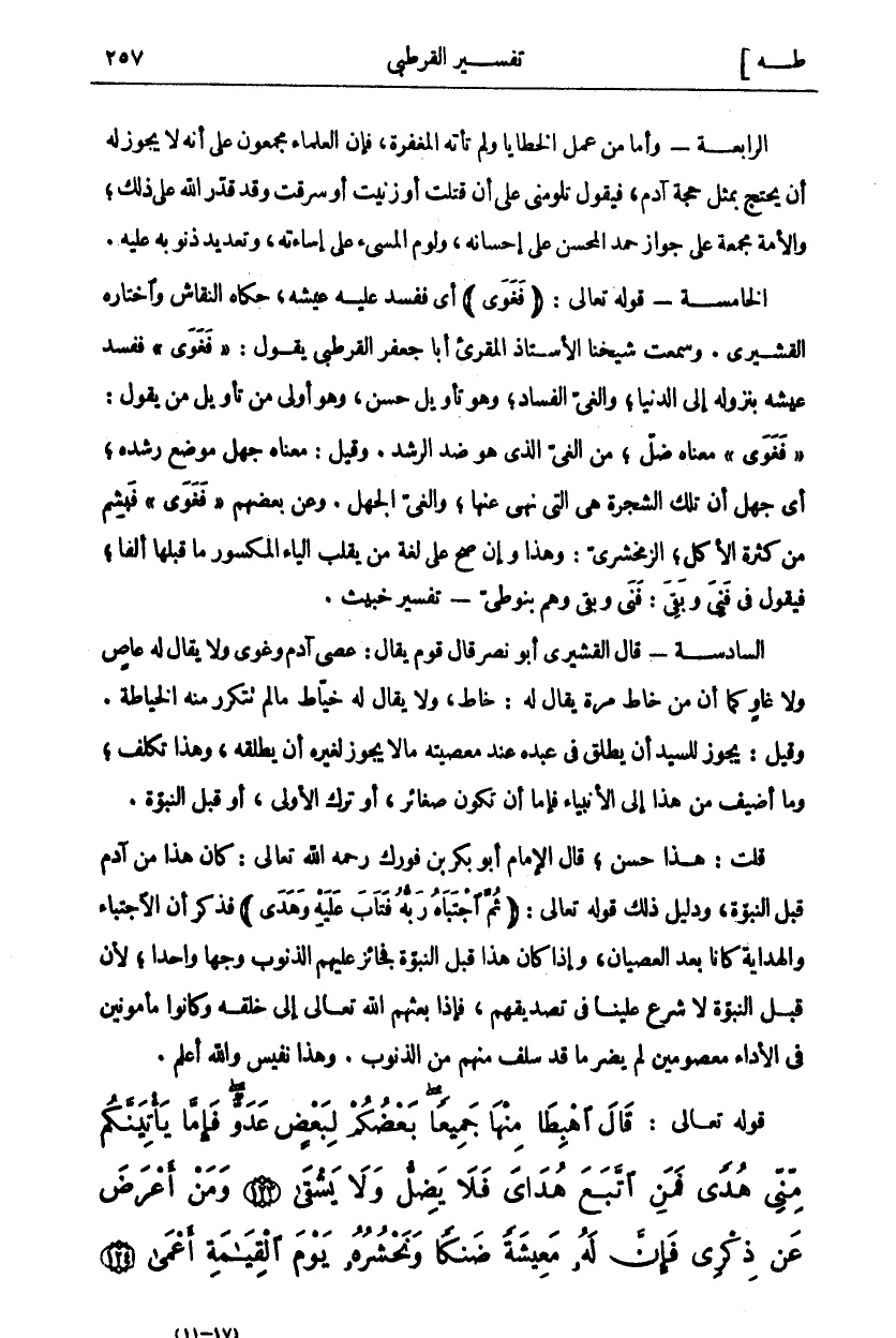 الرَّابِعَةُ- وَأَمَّا مَنْ عَمِلَ الْخَطَايَا وَلَمْ تَأْتِهِ الْمَغْفِرَةُ، فَإِنَّ الْعُلَمَاءَ مُجْمِعُونَ عَلَى أَنَّهُ لَا يَجُوزُ لَهُ أَنْ يَحْتَجَّ بِمِثْلِ حُجَّةِ آدَمَ، فَيَقُولُ تَلُومُنِي عَلَى أَنْ قَتَلْتُ أَوْ زَنَيْتُ أَوْ سَرَقْتُ وَقَدْ قَدَّرَ اللَّهُ عَلَيَّ ذَلِكَ، وَالْأُمَّةُ مُجْمِعَةٌ عَلَى جَوَازِ حَمْدِ الْمُحْسِنِ عَلَى إِحْسَانِهِ، وَلَوْمِ الْمُسِيءِ عَلَى إِسَاءَتِهِ، وَتَعْدِيدِ ذُنُوبِهِ عَلَيْهِ. الْخَامِسَةُ- قَوْلُهُ تَعَالَى:" فَغَوى ٢٠: ١٢١" أَيْ فَفَسَدَ عَلَيْهِ عَيْشُهُ، حَكَاهُ النَّقَّاشُ وَاخْتَارَهُ الْقُشَيْرِيُّ. وَسَمِعْتُ شَيْخَنَا الْأُسْتَاذَ الْمُقْرِئَ أَبَا جَعْفَرٍ الْقُرْطُبِيَّ يَقُولُ:" فَغَوى ٢٠: ١٢١" فَفَسَدَ عَيْشُهُ بِنُزُولِهِ إِلَى الدُّنْيَا، وَالْغَيُّ الْفَسَادُ، وَهُوَ تَأْوِيلٌ حَسَنٌ وَهُوَ أَوْلَى مِنْ تَأْوِيلِ مَنْ يَقُولُ:" فَغَوى ٢٠: ١٢١" مَعْنَاهُ ضَلَّ، مِنَ الْغَيِّ الَّذِي هُوَ ضِدُّ الرُّشْدِ. وَقِيلَ: مَعْنَاهُ جَهِلَ مَوْضِعَ رُشْدِهِ، أَيْ جَهِلَ أَنَّ تِلْكَ الشَّجَرَةَ هِيَ الَّتِي نُهِيَ عَنْهَا، وَالْغَيُّ الْجَهْلُ. وَعَنْ بَعْضِهِمْ" فَغَوى ٢٠: ١٢١"" فَبَشِمَ مِنْ كَثْرَةِ الْأَكْلِ، الزَّمَخْشَرِيُّ: وَهَذَا وَإِنْ صَحَّ عَلَى لُغَةِ مَنْ يَقْلِبُ الْيَاءَ الْمَكْسُورَةَ مَا قَبْلَهَا أَلِفًا، فَيَقُولُ فِي فَنِيَ وَبَقِيَ: فَنَى وَبَقَى وَهُمْ بَنُو طي- تَفْسِيرٌ خَبِيثٌ. السَّادِسَةُ- قَالَ الْقُشَيْرِيُّ أَبُو نَصْرٍ قَالَ قَوْمٌ يُقَالُ: عَصَى آدَمُ وَغَوَى وَلَا يُقَالُ لَهُ عَاصٍ وَلَا غَاوٍ كَمَا أَنَّ مَنْ خَاطَ مَرَّةً يُقَالُ لَهُ: خَاطٌ وَلَا يُقَالُ لَهُ خَيَّاطٌ مَا لَمْ يَتَكَرَّرْ مِنْهُ الْخِيَاطَةُ. وَقِيلَ: يَجُوزُ لِلسَّيِّدِ أَنْ يُطْلِقَ فِي عَبْدِهِ عِنْدَ مَعْصِيَتِهِ مَا لَا يَجُوزُ لِغَيْرِهِ أَنْ يُطْلِقَهُ، وَهَذَا تَكَلُّفٌ، وَمَا أُضِيفَ مِنْ هَذَا إِلَى الْأَنْبِيَاءِ فَإِمَّا أَنْ تَكُونَ صَغَائِرَ، أَوْ تَرْكَ الْأَوْلَى، أَوْ قَبْلَ النُّبُوَّةِ. قُلْتُ: هَذَا حَسَنٌ. قَالَ الْإِمَامُ أَبُو بَكْرِ بْنِ فَوْرَكٍ رَحِمَهُ اللَّهُ تَعَالَى: كَانَ هَذَا مِنْ آدَمَ قَبْلَ النُّبُوَّةِ، وَدَلِيلُ ذَلِكَ قَوْلُهُ تَعَالَى:" ثُمَّ اجْتَباهُ رَبُّهُ فَتابَ عَلَيْهِ وَهَدى ٢٠: ١٢٢" فَذَكَرَ أَنَّ الِاجْتِبَاءَ وَالْهِدَايَةَ كَانَا بَعْدَ الْعِصْيَانِ، وَإِذَا كَانَ هَذَا قَبْلَ النُّبُوَّةِ فَجَائِزٌ عَلَيْهِمُ الذُّنُوبَ وَجْهًا وَاحِدًا، لِأَنَّ قَبْلَ النُّبُوَّةِ لَا شَرْعٌ علينا في تَصْدِيقُهُمْ، فَإِذَا بَعَثَهُمُ اللَّهُ تَعَالَى إِلَى خَلْقِهِ وَكَانُوا مَأْمُونِينَ فِي الْأَدَاءِ مَعْصُومِينَ لَمْ يَضُرَّ مَا قَدْ سَلَفَ مِنْهُمْ مِنَ الذُّنُوبِ. وَهَذَا نفيس والله أعلم.