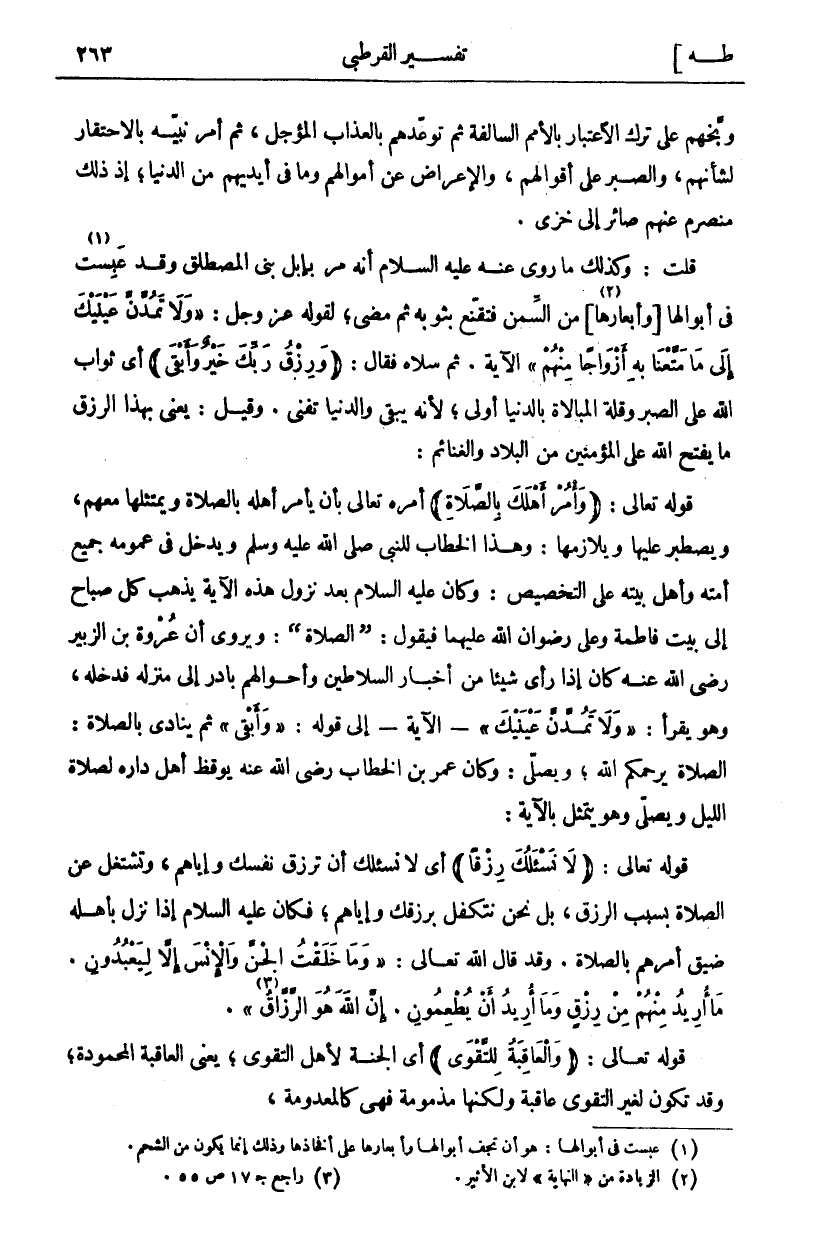 وَبَّخَهُمْ عَلَى تَرْكِ الِاعْتِبَارِ بِالْأُمَمِ السَّالِفَةِ ثُمَّ تَوَعَّدَهُمْ بِالْعَذَابِ الْمُؤَجَّلِ، ثُمَّ أَمَرَ نَبِيَّهُ بِالِاحْتِقَارِ لِشَأْنِهِمْ، وَالصَّبْرِ عَلَى أَقْوَالِهِمْ، وَالْإِعْرَاضِ عَنْ أَمْوَالِهِمْ وَمَا فِي أَيْدِيهِمْ مِنَ الدُّنْيَا، إِذْ ذَلِكَ مُنْصَرِمٌ عَنْهُمْ صَائِرٌ إِلَى خِزْيٍ. قُلْتُ: وَكَذَلِكَ مَا رُوِيَ عَنْهُ عَلَيْهِ السَّلَامُ أَنَّهُ مَرَّ بِإِبِلِ بَنِي الْمُصْطَلِقِ وَقَدْ عَبِسَتْ «١» فِي أَبْوَالِهَا [وأبعارها «٢»] مِنَ السِّمَنِ فَتَقَنَّعَ بِثَوْبِهِ ثُمَّ مَضَى، لِقَوْلِهِ عَزَّ وَجَلَّ:" وَلا تَمُدَّنَّ عَيْنَيْكَ إِلى مَا مَتَّعْنا بِهِ أَزْواجاً مِنْهُمْ ٢٠: ١٣١" الْآيَةَ. ثُمَّ سَلَّاهُ فَقَالَ:" وَرِزْقُ رَبِّكَ خَيْرٌ وَأَبْقى ٢٠: ١٣١" أَيْ ثَوَابُ اللَّهِ عَلَى الصَّبْرِ وَقِلَّةِ الْمُبَالَاةِ بِالدُّنْيَا أَوْلَى، لِأَنَّهُ يَبْقَى وَالدُّنْيَا تَفْنَى. وَقِيلَ: يَعْنِي بِهَذَا الرِّزْقِ مَا يَفْتَحُ اللَّهُ عَلَى الْمُؤْمِنِينَ مِنَ الْبِلَادِ وَالْغَنَائِمِ. قَوْلُهُ تَعَالَى: (وَأْمُرْ أَهْلَكَ بِالصَّلاةِ) ٢٠: ١٣٢ أَمَرَهُ تَعَالَى بِأَنْ يَأْمُرَ أَهْلَهُ بِالصَّلَاةِ وَيَمْتَثِلَهَا معهم، ويصطبر عليها ويلازمها: وهذا الخطاب لِلنَّبِيِّ صَلَّى اللَّهُ عَلَيْهِ وَسَلَّمَ وَيَدْخُلُ فِي عُمُومِهِ جَمِيعُ أُمَّتِهِ، وَأَهْلُ بَيْتِهِ عَلَى التَّخْصِيصِ. وَكَانَ عَلَيْهِ السَّلَامُ بَعْدَ نُزُولِ هَذِهِ الْآيَةِ يَذْهَبُ كُلَّ صَبَاحٍ إِلَى بَيْتِ فَاطِمَةَ وَعَلِيٍّ رِضْوَانُ اللَّهِ عَلَيْهِمَا فَيَقُولُ" الصَّلَاةَ". وَيُرْوَى أَنَّ عُرْوَةَ بْنَ الزُّبَيْرِ رَضِيَ اللَّهُ عَنْهُ كَانَ إِذَا رَأَى شَيْئًا مِنْ أَخْبَارِ السَّلَاطِينِ وَأَحْوَالِهِمْ بَادَرَ إِلَى مَنْزِلِهِ فَدَخَلَهُ، وَهُوَ يَقْرَأُ" وَلا تَمُدَّنَّ عَيْنَيْكَ ٢٠: ١٣١" الْآيَةَ إِلَى قَوْلِهِ:" وَأَبْقى ٢٠: ٧١" ثُمَّ يُنَادِي بِالصَّلَاةِ: الصَّلَاةَ يَرْحَمُكُمُ اللَّهُ، وَيُصَلِّي: وَكَانَ عُمَرُ بْنُ الْخَطَّابِ رَضِيَ اللَّهُ عَنْهُ يُوقِظُ أَهْلَ دَارِهِ لِصَلَاةِ اللَّيْلِ وَيُصَلِّي وَهُوَ يَتَمَثَّلُ بالآية. قوله تعالى: (لا نَسْئَلُكَ رِزْقاً) ٢٠: ١٣٢ أي لا نسئلك أَنْ تَرْزُقَ نَفْسَكَ وَإِيَّاهُمْ، وَتَشْتَغِلَ عَنِ الصَّلَاةِ بِسَبَبِ الرِّزْقِ، بَلْ نَحْنُ نَتَكَفَّلُ بِرِزْقِكَ وَإِيَّاهُمْ، فَكَانَ عَلَيْهِ السَّلَامُ إِذَا نَزَلَ بِأَهْلِهِ ضِيقٌ أَمَرَهُمْ بِالصَّلَاةِ. وَقَدْ قَالَ اللَّهُ تَعَالَى" وَما خَلَقْتُ الْجِنَّ وَالْإِنْسَ إِلَّا لِيَعْبُدُونِ. مَا أُرِيدُ مِنْهُمْ مِنْ رِزْقٍ وَما أُرِيدُ أَنْ يُطْعِمُونِ. إِنَّ اللَّهَ هُوَ الرَّزَّاقُ" «٣» [الذاريات ٥٦]. قَوْلُهُ تَعَالَى: (وَالْعاقِبَةُ لِلتَّقْوى) ٢٠: ١٣٢ أَيِ الْجَنَّةُ لِأَهْلِ التَّقْوَى، يَعْنِي الْعَاقِبَةُ الْمَحْمُودَةُ وَقَدْ تَكُونُ لِغَيْرِ التقوى عاقبة ولكنها مذمومة فهي كالمعدومة،
