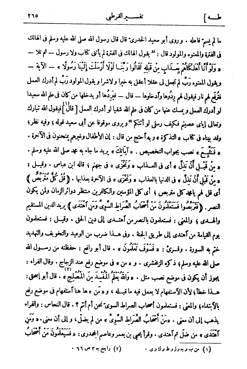 مَا لَمْ يُسَمَّ فَاعِلُهُ. وَرَوَى أَبُو سَعِيدٍ الْخُدْرِيُّ قَالَ قَالَ رَسُولُ اللَّهِ صَلَّى اللَّهُ عَلَيْهِ وَسَلَّمَ فِي الْهَالِكِ فِي الْفَتْرَةِ وَالْمَعْتُوهِ وَالْمَوْلُودِ قَالَ: (يَقُولُ الْهَالِكُ فِي الْفَتْرَةِ لَمْ يَأْتِنِي كِتَابٌ وَلَا رَسُولٌ- ثُمَّ تَلَا-" وَلَوْ أَنَّا أَهْلَكْناهُمْ بِعَذابٍ مِنْ قَبْلِهِ لَقالُوا رَبَّنا لَوْلا أَرْسَلْتَ إِلَيْنا رَسُولًا ٢٠: ١٣٤"- الْآيَةَ- وَيَقُولُ الْمَعْتُوهُ رَبِّ لَمْ تَجْعَلْ لِي عَقْلًا أَعْقِلُ بِهِ خَيْرًا وَلَا شَرًّا وَيَقُولُ الْمَوْلُودُ رَبِّ لَمْ أُدْرِكِ الْعَمَلَ فَتُرْفَعُ لَهُمْ نَارٌ فَيَقُولُ لَهُمْ رِدُوهَا وَادْخُلُوهَا- قَالَ- فَيَرِدُهَا أَوْ يَدْخُلُهَا مَنْ كَانَ فِي عِلْمِ اللَّهِ سَعِيدًا لَوْ أَدْرَكَ الْعَمَلَ وَيُمْسِكُ عَنْهَا مَنْ كَانَ فِي عِلْمِ اللَّهِ شقيا لو أدرك العمل [قال «١»] فيقول الله تبارك وتعالى إياك عَصَيْتُمْ فَكَيْفَ رُسُلِي لَوْ أَتَتْكُمْ (. وَيُرْوَى مَوْقُوفًا عن أبي سعيد قوله وفية نَظَرٌ وَقَدْ بَيَّنَّاهُ فِي كِتَابِ" التَّذْكِرَةِ" وَبِهِ احْتَجَّ مَنْ قَالَ: إِنَّ الْأَطْفَالَ وَغَيْرَهُمْ يُمْتَحَنُونَ فِي الْآخِرَةِ." فَنَتَّبِعَ" ٢٠: ١٣٤ نُصِبَ بِجَوَابِ التَّخْصِيصِ." آياتِكَ" يُرِيدُ مَا جَاءَ بِهِ مُحَمَّدٌ صَلَّى اللَّهُ عَلَيْهِ وَسَلَّمَ." مِنْ قَبْلِ أَنْ نَذِلَّ ٢٠: ١٣٤" أَيْ فِي الْعَذَابِ" وَنَخْزى ٢٠: ١٣٤" فِي جَهَنَّمَ، قَالَهُ ابْنُ عَبَّاسٍ. وَقِيلَ:" مِنْ قَبْلِ أَنْ نَذِلَّ ٢٠: ١٣٤" فِي الدُّنْيَا بِالْعَذَابِ" وَنَخْزى ٢٠: ١٣٤" فِي الْآخِرَةِ بِعَذَابِهَا. (قُلْ كُلٌّ مُتَرَبِّصٌ) ٢٠: ١٣٥ أَيْ قُلْ لَهُمْ يَا مُحَمَّدُ كُلٌّ مُتَرَبِّصٌ، أَيْ كُلُّ الْمُؤْمِنِينَ وَالْكَافِرِينَ مُنْتَظِرٌ دَوَائِرَ الزَّمَانِ ولمن يكون النصر. (فَتَرَبَّصُوا فَسَتَعْلَمُونَ مَنْ أَصْحابُ الصِّراطِ السَّوِيِّ وَمَنِ اهْتَدى) ٢٠: ١٣٥ يُرِيدُ الدِّينَ الْمُسْتَقِيمَ وَالْهُدَى وَالْمَعْنَى: فَسَتَعْلَمُونَ بِالنَّصْرِ مَنِ اهْتَدَى إِلَى دِينِ الْحَقِّ. وَقِيلَ: فَسَتَعْلَمُونَ يَوْمَ الْقِيَامَةِ مَنِ اهْتَدَى إِلَى طَرِيقِ الْجَنَّةِ. وَفِي هَذَا ضَرْبٌ مِنَ الْوَعِيدِ وَالتَّخْوِيفِ والتهديد ختم به السورة. وقرى" فَسَوْفَ تَعْلَمُونَ". قَالَ أَبُو رَافِعٍ: حَفِظْتُهُ مِنْ رَسُولِ اللَّهِ صَلَّى اللَّهُ عَلَيْهِ وَسَلَّمَ، ذَكَرَهُ الزَّمَخْشَرِيُّ. وَ" مَنْ" فِي مَوْضِعِ رَفْعٍ عِنْدَ الزَّجَّاجِ. وَقَالَ الْفَرَّاءُ: يَجُوزُ أَنْ يَكُونَ فِي مَوْضِعِ نَصْبٍ مِثْلَ." وَاللَّهُ يَعْلَمُ الْمُفْسِدَ مِنَ الْمُصْلِحِ" «٢». قَالَ أَبُو إِسْحَاقَ: هَذَا خَطَأٌ، لِأَنَّ الِاسْتِفْهَامَ لَا يَعْمَلُ فِيهِ مَا قَبْلَهُ، وَ" من" ها هنا اسْتِفْهَامٌ فِي مَوْضِعِ رَفْعٍ بِالِابْتِدَاءِ، وَالْمَعْنَى: فَسَتَعْلَمُونَ أَصْحَابَ الصِّرَاطِ السَّوِيِّ نَحْنُ أَمْ أَنْتُمْ؟. قَالَ النَّحَّاسُ: وَالْفَرَّاءُ يَذْهَبُ إِلَى أَنَّ مَعْنَى." مَنْ أَصْحابُ الصِّراطِ السَّوِيِّ ٢٠: ١٣٥" مَنْ لَمْ يَضِلَّ وَإِلَى أَنَّ مَعْنَى." وَمَنِ اهْتَدى ٢٠: ١٣٥