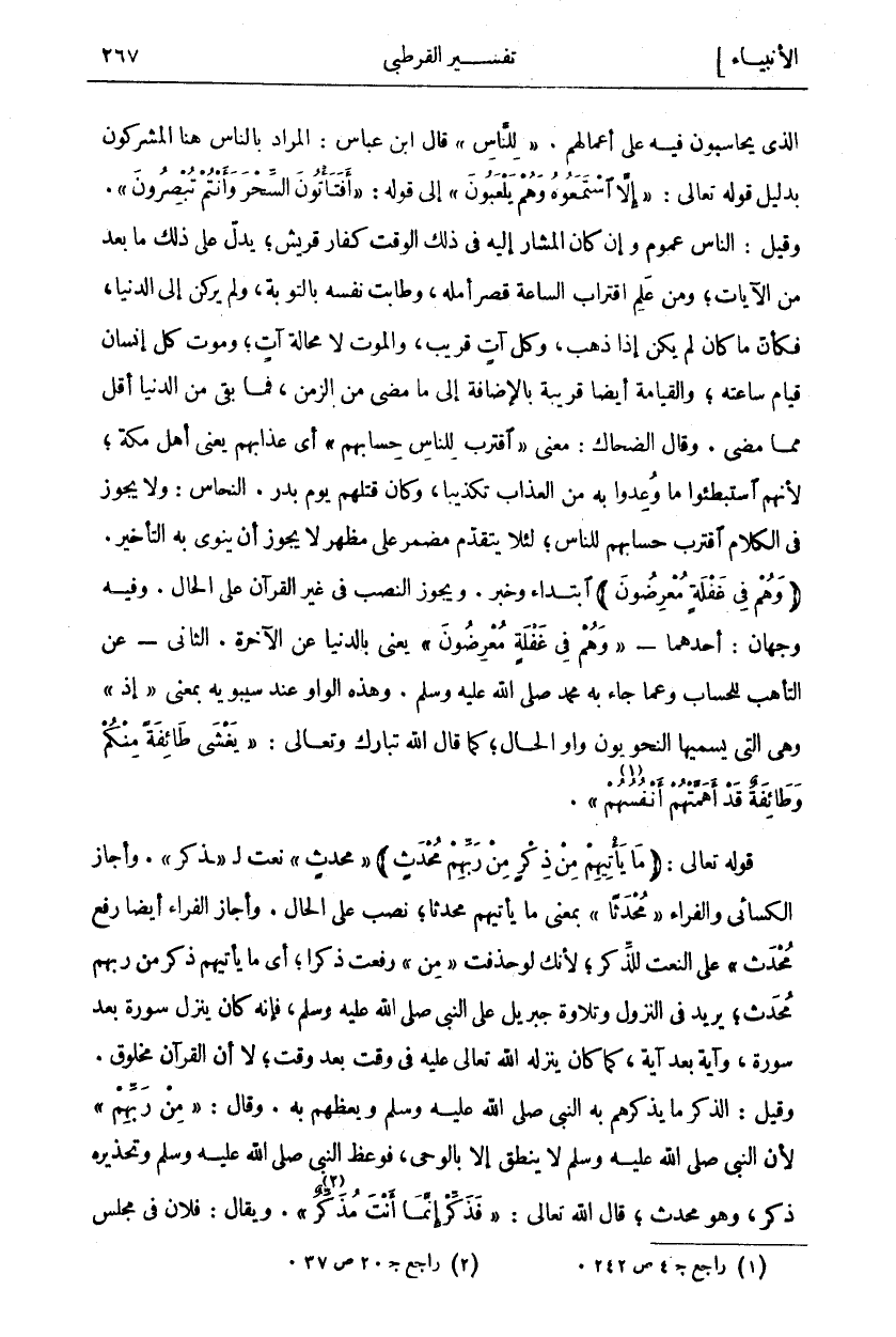 الَّذِي يُحَاسَبُونَ فِيهِ عَلَى أَعْمَالِهِمْ." لِلنَّاسِ" قَالَ ابْنُ عَبَّاسٍ: الْمُرَادُ بِالنَّاسِ هُنَا الْمُشْرِكُونَ بِدَلِيلِ قَوْلِهِ تَعَالَى:" إِلَّا اسْتَمَعُوهُ وَهُمْ يَلْعَبُونَ" إِلَى قَوْلِهِ:" أَفَتَأْتُونَ السِّحْرَ وَأَنْتُمْ تُبْصِرُونَ". وَقِيلَ: النَّاسُ عُمُومٌ وَإِنْ كَانَ الْمُشَارُ إِلَيْهِ فِي ذَلِكَ الْوَقْتِ كُفَّارَ قُرَيْشٍ، يَدُلُّ عَلَى ذَلِكَ مَا بَعْدُ مِنَ الْآيَاتِ، وَمَنْ عَلِمَ اقْتِرَابَ السَّاعَةِ قَصُرَ أَمَلُهُ، وَطَابَتْ نَفْسُهُ بِالتَّوْبَةِ، وَلَمْ يَرْكَنْ إِلَى الدُّنْيَا، فَكَأَنَّ مَا كَانَ لَمْ يَكُنْ إِذَا ذَهَبَ، وَكُلُّ آتٍ قَرِيبٌ، وَالْمَوْتُ لَا مَحَالَةَ آتٍ، وَمَوْتُ كُلِّ إِنْسَانٍ قِيَامُ سَاعَتِهِ، وَالْقِيَامَةُ أَيْضًا قَرِيبَةٌ بِالْإِضَافَةِ إِلَى مَا مَضَى مِنَ الزَّمَانِ، فَمَا بَقِيَ مِنَ الدُّنْيَا أَقَلُّ مِمَّا مَضَى. وَقَالَ الضَّحَّاكُ: مَعْنَى" اقْتَرَبَ لِلنَّاسِ حِسابُهُمْ" أَيْ عَذَابُهُمْ يَعْنِي أَهْلَ مَكَّةَ، لِأَنَّهُمُ اسْتَبْطَئُوا مَا وُعِدُوا بِهِ مِنَ الْعَذَابِ تَكْذِيبًا، وَكَانَ قَتْلُهُمْ يَوْمَ بَدْرٍ. النَّحَّاسُ وَلَا يَجُوزُ فِي الْكَلَامِ اقْتَرَبَ حِسَابُهُمْ لِلنَّاسِ، لِئَلَّا يَتَقَدَّمُ مُضْمَرٌ عَلَى مُظْهَرٍ لَا يَجُوزُ أَنْ يَنْوِيَ بِهِ التَّأْخِيرَ. (وَهُمْ فِي غَفْلَةٍ مُعْرِضُونَ) ابْتِدَاءٌ وَخَبَرٌ. وَيَجُوزُ النَّصْبُ فِي غَيْرِ الْقُرْآنِ عَلَى الْحَالِ. وَفِيهِ وَجْهَانِ: أَحَدُهُمَا:" وَهُمْ فِي غَفْلَةٍ مُعْرِضُونَ" يَعْنِي بِالدُّنْيَا عَنِ الْآخِرَةِ. الثَّانِي- عَنِ التَّأَهُّبِ لِلْحِسَابِ وَعَمَّا جَاءَ بِهِ مُحَمَّدٌ صَلَّى اللَّهُ عَلَيْهِ وَسَلَّمَ. وَهَذِهِ الْوَاوُ عِنْدَ سِيبَوَيْهِ بِمَعْنَى" إِذْ" وَهِيَ الَّتِي يُسَمِّيهَا النَّحْوِيُّونَ وَاوَ الْحَالِ، كَمَا قَالَ اللَّهُ تَبَارَكَ وَتَعَالَى:" يَغْشى طائِفَةً مِنْكُمْ وَطائِفَةٌ قَدْ أَهَمَّتْهُمْ أَنْفُسُهُمْ" «١» [آل عمران: ١٥٤]. قَوْلِهِ تَعَالَى: (مَا يَأْتِيهِمْ مِنْ ذِكْرٍ مِنْ رَبِّهِمْ مُحْدَثٍ) " مُحْدَثٍ" نَعْتٌ لِ"- ذِكْرٍ". وَأَجَازَ الْكِسَائِيُّ وَالْفَرَّاءُ" مُحْدَثًا" بِمَعْنَى مَا يَأْتِيهِمْ مُحْدَثًا، نُصِبَ عَلَى الْحَالِ. وَأَجَازَ الْفَرَّاءُ أَيْضًا رَفْعَ" مُحْدَثٍ" عَلَى النَّعْتِ لِلذِّكْرِ، لِأَنَّكَ لَوْ حَذَفْتَ" مِنْ" رَفَعْتَ ذِكْرًا، أَيْ مَا يَأْتِيهِمْ ذِكْرٌ مِنْ رَبِّهِمْ مُحْدَثٌ، يُرِيدُ فِي النُّزُولِ وَتِلَاوَةِ جِبْرِيلَ عَلَى النَّبِيِّ صَلَّى اللَّهُ عَلَيْهِ وَسَلَّمَ، فَإِنَّهُ كَانَ يَنْزِلُ سُورَةً بَعْدَ سُورَةٍ، وَآيَةً بَعْدَ آيَةٍ، كَمَا كَانَ يُنَزِّلُهُ اللَّهُ تَعَالَى عَلَيْهِ فِي وَقْتٍ بَعْدَ وَقْتٍ، لَا أَنَّ الْقُرْآنَ مَخْلُوقٌ. وَقِيلَ: الذِّكْرُ مَا يُذَكِّرُهُمْ بِهِ النَّبِيُّ صَلَّى اللَّهُ عَلَيْهِ وَسَلَّمَ وَيَعِظُهُمْ بِهِ. وَقَالَ:" مِنْ رَبِّهِمْ" لِأَنَّ النَّبِيَّ صَلَّى اللَّهُ عَلَيْهِ وَسَلَّمَ لَا يَنْطِقُ إِلَّا بِالْوَحْيِ، فَوَعْظُ النَّبِيِّ صَلَّى اللَّهُ عَلَيْهِ وَسَلَّمَ وَتَحْذِيرُهُ ذِكْرٌ، وَهُوَ مُحْدَثٌ، قَالَ اللَّهُ تَعَالَى:" فَذَكِّرْ إِنَّما أَنْتَ مُذَكِّرٌ" «٢» [الغاشية: ٢١]. ويقال: فلان في مجلس