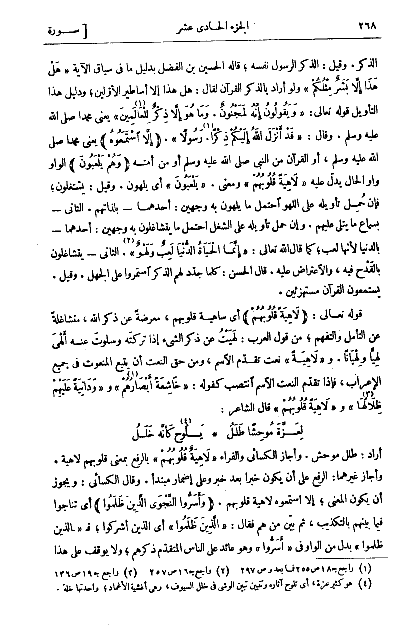 أَرَادَ: طَلَلٌ مُوحِشٌ. وَأَجَازَ الْكِسَائِيُّ وَالْفَرَّاءُ" لاهِيَةً قُلُوبُهُمْ" بِالرَّفْعِ بِمَعْنَى قُلُوبُهُمْ لَاهِيَةٌ. وَأَجَازَ غَيْرُهُمَا: الرَّفْعَ عَلَى أَنْ يَكُونَ خَبَرًا بَعْدَ خَبَرٍ وَعَلَى إِضْمَارِ مُبْتَدَأٍ. وَقَالَ الْكِسَائِيُّ: وَيَجُوزُ أَنْ يَكُونَ الْمَعْنَى، إِلَّا اسْتَمَعُوهُ لَاهِيَةً قُلُوبُهُمْ. (وَأَسَرُّوا النَّجْوَى الَّذِينَ ظَلَمُوا) أَيْ تَنَاجَوْا فِيمَا بَيْنَهُمْ بِالتَّكْذِيبِ، ثُمَّ بَيَّنَ مَنْ هُمْ فَقَالَ:" الَّذِينَ ظَلَمُوا" أَيِ الَّذِينَ أَشْرَكُوا، فَ"- الَّذِينَ ظَلَمُوا" بَدَلٌ مِنَ الْوَاوِ فِي" أَسَرُّوا" وَهُوَ عَائِدٌ عَلَى النَّاسِ الْمُتَقَدِّمِ ذِكْرُهُمْ، وَلَا يُوقَفُ عَلَى هَذَا