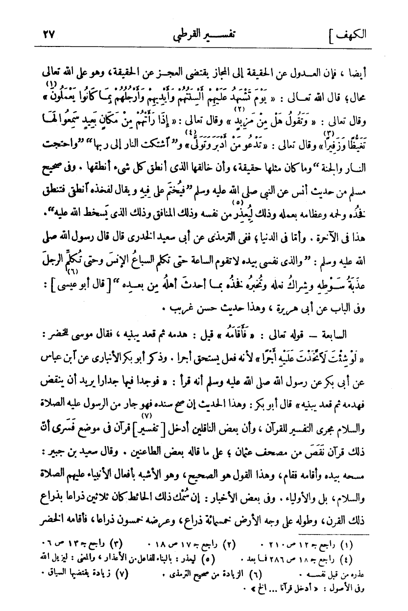 أَيْضًا، فَإِنَّ الْعُدُولَ عَنِ الْحَقِيقَةِ إِلَى الْمَجَازِ يَقْتَضِي الْعَجْزَ عَنِ الْحَقِيقَةِ، وَهُوَ عَلَى اللَّهِ تَعَالَى مُحَالٌ، قَالَ اللَّهُ تَعَالَى:" يَوْمَ تَشْهَدُ عَلَيْهِمْ أَلْسِنَتُهُمْ وَأَيْدِيهِمْ وَأَرْجُلُهُمْ بِما كانُوا يَعْمَلُونَ" «١» [النور: ٢٤] وقال تعالى:" وَتَقُولُ هَلْ مِنْ مَزِيدٍ ٥٠: ٣٠" «٢» [ق: ٣٠] وَقَالَ تَعَالَى:" إِذا رَأَتْهُمْ مِنْ مَكانٍ بَعِيدٍ سَمِعُوا لَها تَغَيُّظاً وَزَفِيراً" «٣» [الفرقان: ١٢] وقال تعالى:" تَدْعُوا مَنْ أَدْبَرَ وَتَوَلَّى ٧٠: ١٧" «٤» [المعارج: ١٧] وَ (اشْتَكَتِ النَّارُ إِلَى رَبِّهَا) (وَاحْتَجَّتِ النَّارُ وَالْجَنَّةُ) وَمَا كَانَ مِثْلُهَا حَقِيقَةً، وَأَنَّ خَالِقَهَا الذي أنطق كل شي أَنْطَقَهَا. وَفِي صَحِيحِ مُسْلِمٍ مِنْ حَدِيثِ أَنَسٍ عَنِ النَّبِيِّ صَلَّى اللَّهُ عَلَيْهِ وَسَلَّمَ (فَيُخْتَمُ عَلَى فِيهِ وَيُقَالُ لِفَخِذِهِ انْطِقِي فَتَنْطِقُ فَخِذُهُ وَلَحْمُهُ وَعِظَامُهُ بِعَمَلِهِ وَذَلِكَ لِيُعْذَرَ «٥» مِنْ نَفْسِهِ وَذَلِكَ الْمُنَافِقُ وَذَلِكَ الَّذِي يَسْخَطُ اللَّهُ عَلَيْهِ). هَذَا فِي الْآخِرَةِ. وَأَمَّا فِي الدُّنْيَا، فَفِي الترمذي عَنْ أَبِي سَعِيدٍ الْخُدْرِيِّ قَالَ قَالَ رَسُولُ اللَّهِ صَلَّى اللَّهُ عَلَيْهِ وَسَلَّمَ: (وَالَّذِي نَفْسِي بِيَدِهِ لَا تَقُومُ السَّاعَةُ حَتَّى تُكَلِّمَ السباع الانس وَحَتَّى تُكَلِّمَ الرَّجُلَ عَذَبَةُ سَوْطِهِ وَشِرَاكُ نَعْلِهِ وَتُخْبِرُهُ فَخِذُهُ بِمَا أَحْدَثَ أَهْلُهُ مِنْ بَعْدِهِ) [قَالَ أَبُو عِيسَى «٦»]: وَفِي الْبَابِ عَنْ أَبِي هُرَيْرَةَ، وَهَذَا حَدِيثٌ حسن غريب. السابعة- قَوْلُهُ تَعَالَى: (فَأَقامَهُ) قِيلَ: هَدَمَهُ ثُمَّ قَعَدَ يبنيه. فَقَالَ مُوسَى لِلْخَضِرِ:" لَوْ شِئْتَ لَاتَّخَذْتَ عَلَيْهِ أَجْراً" لِأَنَّهُ فِعْلٌ يَسْتَحِقُّ أَجْرًا. وَذَكَرَ أَبُو بَكْرٍ الْأَنْبَارِيُّ عَنِ ابْنِ عَبَّاسٍ عَنْ أَبِي بَكْرٍ عَنْ رَسُولِ اللَّهِ صَلَّى اللَّهُ عَلَيْهِ وَسَلَّمَ أَنَّهُ قَرَأَ:" فَوَجَدَا فِيهَا جِدَارًا يُرِيدُ أَنْ يَنْقَضَّ فَهَدَمَهُ ثُمَّ قَعَدَ يَبْنِيهِ" قَالَ أَبُو بَكْرٍ: وَهَذَا الْحَدِيثُ إِنْ صَحَّ سَنَدُهُ فَهُوَ جَارٍ مِنَ الرَّسُولِ عَلَيْهِ الصَّلَاةُ وَالسَّلَامُ مَجْرَى التَّفْسِيرِ لِلْقُرْآنِ، وَأَنَّ بَعْضَ النَّاقِلِينَ أَدْخَلَ [تَفْسِيرَ «٧»] قُرْآنٍ فِي مَوْضِعٍ فَسَرَى أَنَّ ذَلِكَ قُرْآنٌ نَقَصَ مِنْ مُصْحَفِ عُثْمَانَ، عَلَى مَا قَالَهُ بَعْضُ الطَّاعِنِينَ، وَقَالَ سَعِيدُ بْنُ جُبَيْرٍ: مَسَحَهُ بِيَدِهِ وَأَقَامَهُ فَقَامَ، وَهَذَا الْقَوْلُ هُوَ الصَّحِيحُ، وَهُوَ الْأَشْبَهُ بِأَفْعَالِ الْأَنْبِيَاءِ عَلَيْهِمُ الصَّلَاةُ وَالسَّلَامُ، بَلْ وَالْأَوْلِيَاءِ، وَفِي بَعْضِ الْأَخْبَارِ: إِنَّ سُمْكَ ذَلِكَ الْحَائِطِ كَانَ ثَلَاثِينَ ذِرَاعًا بِذِرَاعِ ذَلِكَ الْقَرْنِ، وَطُولُهُ عَلَى وَجْهِ الْأَرْضِ خَمْسُمِائَةِ ذراع، وعرضه خمسون ذراعا، فأقامه الخضر
