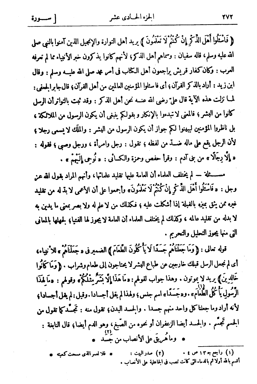 (فَسْئَلُوا أَهْلَ الذِّكْرِ إِنْ كُنْتُمْ لَا تَعْلَمُونَ) يُرِيدُ أَهْلَ التَّوْرَاةِ وَالْإِنْجِيلِ الَّذِينَ آمَنُوا بِالنَّبِيِّ صَلَّى اللَّهُ عَلَيْهِ وَسَلَّمَ، قَالَهُ سُفْيَانُ: وَسَمَّاهُمْ أَهْلَ الذِّكْرِ، لِأَنَّهُمْ كَانُوا يَذْكُرُونَ خَبَرَ الْأَنْبِيَاءِ مِمَّا لَمْ تَعْرِفْهُ الْعَرَبُ: وَكَانَ كُفَّارُ قُرَيْشٍ يُرَاجِعُونَ أَهْلَ الْكِتَابِ فِي أَمْرِ مُحَمَّدٍ صَلَّى اللَّهُ عَلَيْهِ وَسَلَّمَ: وَقَالَ ابْنُ زَيْدٍ: أَرَادَ بِالذِّكْرِ الْقُرْآنَ، أَيْ فَاسْأَلُوا الْمُؤْمِنِينَ الْعَالِمِينَ مِنْ أَهْلِ الْقُرْآنِ، قَالَ جَابِرٌ الْجُعْفِيُّ: لَمَّا نَزَلَتْ هَذِهِ الْآيَةُ قَالَ عَلِيٌّ رَضِيَ اللَّهُ عَنْهُ نَحْنُ أَهْلُ الذِّكْرِ: وَقَدْ ثَبَتَ بِالتَّوَاتُرِ أَنَّ الرُّسُلَ كَانُوا مِنَ الْبَشَرِ، فَالْمَعْنَى لَا تَبْدَءُوا بِالْإِنْكَارِ وَبِقَوْلِكُمْ يَنْبَغِي أَنْ يَكُونَ الرَّسُولُ مِنَ الْمَلَائِكَةِ، بَلْ نَاظِرُوا الْمُؤْمِنِينَ لِيُبَيِّنُوا لَكُمْ جَوَازَ أَنْ يَكُونَ الرَّسُولُ مِنَ الْبَشَرِ: وَالْمَلَكُ لَا يُسَمَّى رجلا، لان الرجل يقع على ماله ضِدٌّ مِنْ لَفْظِهِ تَقُولُ: رَجُلٌ وَامْرَأَةٌ، وَرَجُلٌ وَصَبِيٌّ فَقَوْلُهُ:" إِلَّا رِجالًا ١٠" مِنْ بَنِي آدَمَ: وَقَرَأَ حَفْصٌ وَحَمْزَةُ وَالْكِسَائِيُّ:" نُوحِي إِلَيْهِمْ". مَسْأَلَةٌ- لَمْ يَخْتَلِفِ الْعُلَمَاءُ أَنَّ الْعَامَّةَ عَلَيْهَا تَقْلِيدُ عُلَمَائِهَا، وَأَنَّهُمُ الْمُرَادُ بِقَوْلِ اللَّهِ عَزَّ وَجَلَّ:" فَسْئَلُوا أَهْلَ الذِّكْرِ إِنْ كُنْتُمْ لَا تَعْلَمُونَ" وَأَجْمَعُوا على أن الأعمى لأبد لَهُ مِنْ تَقْلِيدِ غَيْرِهِ مِمَّنْ يَثِقُ بِمَيْزِهِ بِالْقِبْلَةِ إِذَا أَشْكَلَتْ عَلَيْهِ، فَكَذَلِكَ مَنْ لَا عِلْمَ لَهُ وَلَا بَصَرَ بِمَعْنَى مَا يَدِينُ بِهِ لَا بُدَّ لَهُ مِنْ تَقْلِيدِ عَالِمِهِ، وَكَذَلِكَ لَمْ يَخْتَلِفِ الْعُلَمَاءُ أَنَّ الْعَامَّةَ لَا يَجُوزُ لَهَا الْفُتْيَا، لِجَهْلِهَا بِالْمَعَانِي الَّتِي مِنْهَا يَجُوزُ التَّحْلِيلُ وَالتَّحْرِيمُ. قَوْلُهُ تَعَالَى: (وَما جَعَلْناهُمْ جَسَداً لَا يَأْكُلُونَ الطَّعامَ) الضَّمِيرُ فِي" جَعَلْناهُمْ ١٠: ٧٣" لِلْأَنْبِيَاءِ، أَيْ لَمْ نَجْعَلِ الرُّسُلَ قَبْلَكَ خَارِجِينَ عَنْ طِبَاعِ الْبَشَرِ لَا يَحْتَاجُونَ إِلَى طَعَامٍ وَشَرَابٍ.- (وَما كانُوا خالِدِينَ) يُرِيدُ لَا يَمُوتُونَ وَهَذَا جَوَابٌ لِقَوْلِهِمْ:" مَا هَذَا إِلَّا بَشَرٌ مِثْلُكُمْ" [المؤمنون: ٣٣] وقولهم:" مالِ هذَا الرَّسُولِ يَأْكُلُ الطَّعامَ" «١» [الفرقان: ٧]. وَ" جَسَداً" اسْمُ جِنْسٍ، وَلِهَذَا لَمْ يَقُلْ أَجْسَادًا، وَقِيلَ: لَمْ يَقُلْ أَجْسَادًا، لِأَنَّهُ أَرَادَ وَمَا جَعَلْنَا كُلَّ وَاحِدٍ مِنْهُمْ جَسَدًا. وَالْجَسَدُ الْبَدَنُ، تَقُولُ مِنْهُ: تَجَسَّدَ كَمَا تَقُولُ مِنَ الْجِسْمِ تَجَسَّمَ. وَالْجَسَدُ أَيْضًا الزَّعْفَرَانُ أَوْ نَحْوُهُ من الصبغ، وهو الدم أيضا، قال النابغة: