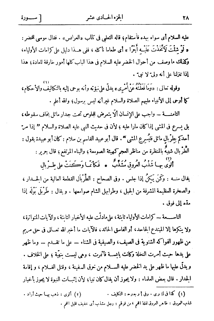 عَلَيْهِ السَّلَامُ أَيْ سَوَّاهُ بِيَدِهِ فَاسْتَقَامَ، قَالَهُ الثَّعْلَبِيُّ فِي كِتَابِ الْعَرَائِسِ: فَقَالَ مُوسَى لِلْخَضِرِ:" لَوْ شِئْتَ لَاتَّخَذْتَ عَلَيْهِ أَجْراً" أَيْ طَعَامًا نأكله، فَفِي هَذَا دَلِيلٌ عَلَى كَرَامَاتِ الْأَوْلِيَاءِ، وَكَذَلِكَ مَا وُصِفَ مِنْ أَحْوَالِ الْخَضِرِ عَلَيْهِ السَّلَامُ فِي هَذَا الْبَابِ كُلُّهَا أُمُورٌ خَارِقَةٌ لِلْعَادَةِ، هَذَا إِذَا تَنَزَّلْنَا عَلَى أَنَّهُ وَلِيٌّ لَا نبي. وقول تعالى:" وَما فَعَلْتُهُ عَنْ أَمْرِي" [الكهف: ٨٢] يَدُلُّ عَلَيَّ نُبُوَّتِهِ وَأَنَّهُ يُوحَى إِلَيْهِ بِالتَّكْلِيفِ «١» وَالْأَحْكَامِ، كَمَا أُوحِيَ لِلْأَنْبِيَاءِ عَلَيْهِمُ الصَّلَاةُ وَالسَّلَامُ غَيْرَ أَنَّهُ لَيْسَ بِرَسُولٍ، وَاللَّهُ أَعْلَمُ. الثَّامِنَةُ- واجب على الإنسان ألا يتعرض للجلوس تحث جِدَارٍ مَائِلٍ يَخَافُ سُقُوطَهُ، بَلْ يُسْرِعُ فِي الْمَشْيِ إِذَا كَانَ مَارًّا عَلَيْهِ، لِأَنَّ فِي حَدِيثِ النَّبِيِّ عَلَيْهِ الصَّلَاةُ وَالسَّلَامُ (إِذَا مَرَّ أَحَدُكُمْ بِطِرْبَالٍ مَائِلٍ فَلْيُسْرِعِ الْمَشْيَ). قَالَ أَبُو عُبَيْدٍ الْقَاسِمُ بْنُ سَلَّامٍ: كَانَ أَبُو عُبَيْدَةَ يَقُولُ: الطِّرْبَالُ شَبِيهٌ بِالْمَنْظَرَةِ مِنْ مَنَاظِرِ الْعَجَمِ كَهَيْئَةِ الصَّوْمَعَةِ، وَالْبِنَاءِ الْمُرْتَفِعِ، قَالَ جَرِيرٌ: