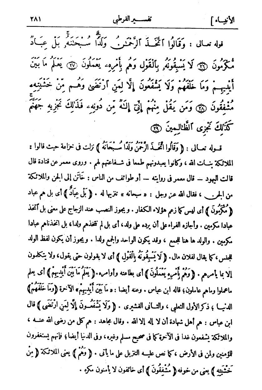 قَوْلُهُ تَعَالَى: (وَقالُوا اتَّخَذَ الرَّحْمنُ وَلَداً سُبْحانَهُ) نَزَلَتْ فِي خُزَاعَةَ حَيْثُ قَالُوا: الْمَلَائِكَةُ بَنَاتُ اللَّهِ، وَكَانُوا يَعْبُدُونَهُمْ طَمَعًا فِي شَفَاعَتِهِمْ لَهُمْ. وَرَوَى مَعْمَرٌ عَنْ قَتَادَةَ قَالَ قَالَتِ الْيَهُودُ- قَالَ مَعْمَرٌ فِي رِوَايَتِهِ- أَوْ طَوَائِفُ مِنَ النَّاسِ: خَاتَنُ إِلَى الْجِنِّ وَالْمَلَائِكَةُ مِنَ الْجِنِّ، فَقَالَ اللَّهُ عَزَّ وَجَلَّ:" سُبْحانَهُ" تَنْزِيهًا لَهُ. (بَلْ عِبادٌ) أَيْ بَلْ هُمْ عِبَادٌ (مُكْرَمُونَ) أَيْ لَيْسَ كَمَا زَعَمَ هَؤُلَاءِ الْكُفَّارُ. وَيَجُوزُ النَّصْبُ عِنْدَ الزَّجَّاجِ عَلَى مَعْنَى بَلِ اتَّخَذَ عِبَادًا مُكْرَمِينَ. وَأَجَازَهُ الْفَرَّاءُ عَلَى أَنْ يَرُدَّهُ عَلَى وَلَدٍ، أَيْ بَلْ لَمْ نَتَّخِذْهُمْ وَلَدًا، بل اتخذناهم عبادا مكرمين. والولد ها هنا لِلْجَمْعِ، وَقَدْ يَكُونُ الْوَاحِدُ وَالْجَمْعُ وَلَدًا. وَيَجُوزُ أَنْ يَكُونَ لَفْظُ الْوَلَدِ لِلْجِنْسِ، كَمَا يُقَالُ لِفُلَانٍ مَالٌ. (لَا يَسْبِقُونَهُ بِالْقَوْلِ) أَيْ لَا يَقُولُونَ حَتَّى يَقُولَ، وَلَا يَتَكَلَّمُونَ إِلَّا بِمَا يَأْمُرُهُمْ. (وَهُمْ بِأَمْرِهِ يَعْمَلُونَ) أَيْ بِطَاعَتِهِ وَأَوَامِرِهِ." يَعْلَمُ ما بَيْنَ أَيْدِيهِمْ" أَيْ يَعْلَمُ مَا عَمِلُوا وَمَا هُمْ عَامِلُونَ، قال ابْنُ عَبَّاسٍ. وَعَنْهُ أَيْضًا:" مَا بَيْنَ أَيْدِيهِمْ" الْآخِرَةُ" وَما خَلْفَهُمْ" الدُّنْيَا، ذَكَرَ الْأَوَّلَ الثَّعْلَبِيُّ، وَالثَّانِيَ الْقُشَيْرِيُّ. (وَلا يَشْفَعُونَ إِلَّا لِمَنِ ارْتَضى) قَالَ ابْنُ عَبَّاسٍ: هُمْ أَهْلُ شَهَادَةِ أَنْ لَا إِلَهَ إِلَّا اللَّهُ. وَقَالَ مُجَاهِدٌ: هُمْ كُلُّ مَنْ رَضِيَ اللَّهُ عَنْهُ، وَالْمَلَائِكَةُ يَشْفَعُونَ غَدًا فِي الْآخِرَةِ كَمَا فِي صَحِيحِ مُسْلِمٍ وَغَيْرِهِ، وَفِي الدُّنْيَا أَيْضًا، فَإِنَّهُمْ يَسْتَغْفِرُونَ لِلْمُؤْمِنِينَ وَلِمَنْ فِي الْأَرْضِ، كَمَا نَصَّ عَلَيْهِ التَّنْزِيلُ عَلَى مَا يَأْتِي. (وَهُمْ) يَعْنِي الْمَلَائِكَةَ (مِنْ خَشْيَتِهِ) يَعْنِي مِنْ خَوْفِهِ (مُشْفِقُونَ) أَيْ خَائِفُونَ لَا يَأْمَنُونَ مَكْرَهُ.