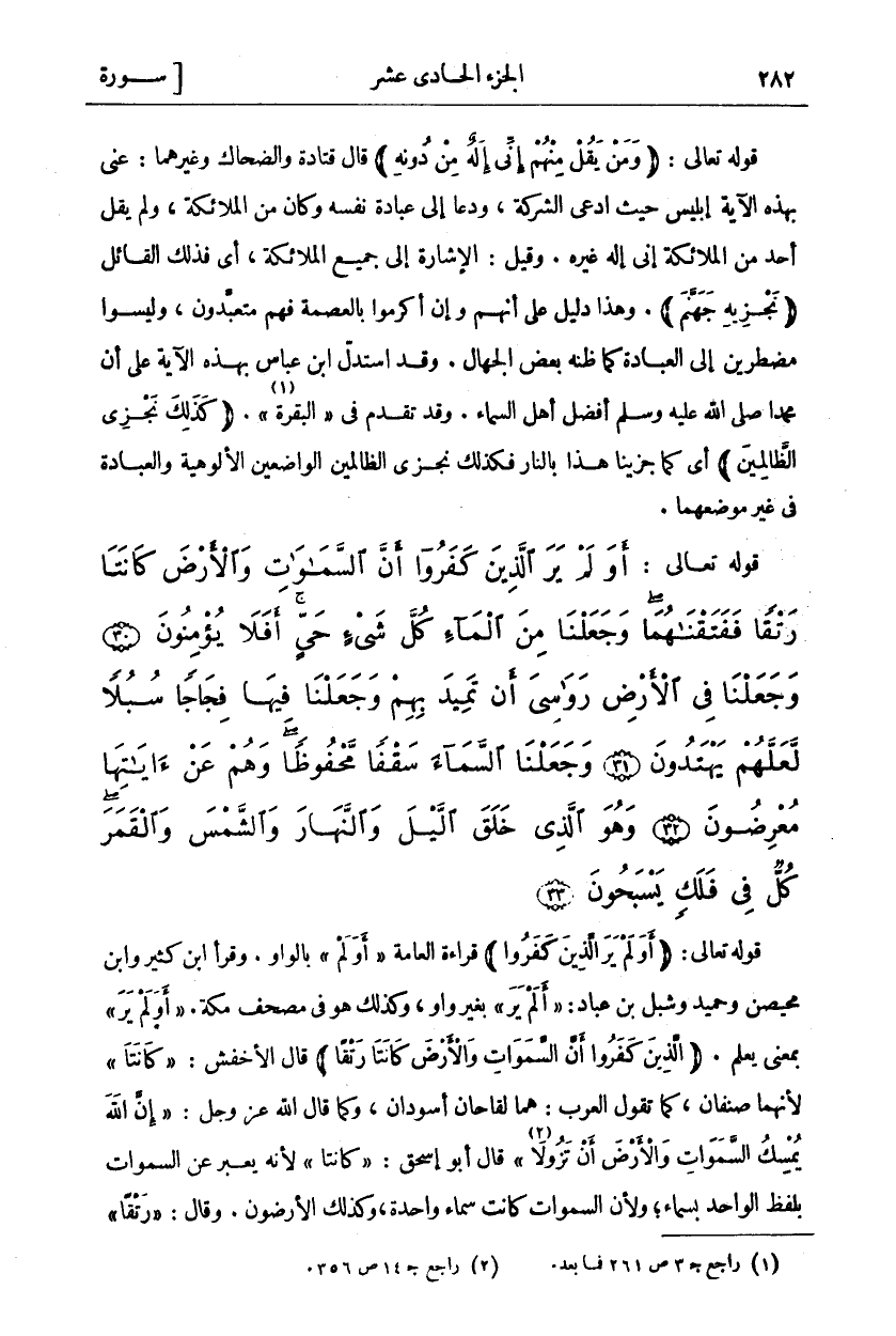 أَوَلَمْ يَرَ الَّذِينَ كَفَرُوا أَنَّ السَّماواتِ وَالْأَرْضَ كانَتا رَتْقاً فَفَتَقْناهُما وَجَعَلْنا مِنَ الْماءِ كُلَّ شَيْءٍ حَيٍّ أَفَلا يُؤْمِنُونَ (٣٠) وَجَعَلْنا فِي الْأَرْضِ رَواسِيَ أَنْ تَمِيدَ بِهِمْ وَجَعَلْنا فِيها فِجاجاً سُبُلاً لَعَلَّهُمْ يَهْتَدُونَ (٣١) وَجَعَلْنَا السَّماءَ سَقْفاً مَحْفُوظاً وَهُمْ عَنْ آياتِها مُعْرِضُونَ (٣٢) وَهُوَ الَّذِي خَلَقَ اللَّيْلَ وَالنَّهارَ وَالشَّمْسَ وَالْقَمَرَ كُلٌّ فِي فَلَكٍ يَسْبَحُونَ (٣٣)