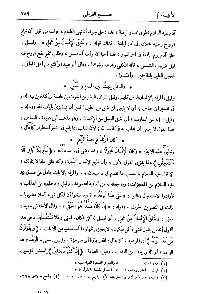 وَقِيلَ: الْمُرَادُ بِالْإِنْسَانِ النَّاسُ كُلُّهُمْ. وَقِيلَ الْمُرَادُ: النَّضْرُ بْنُ الحرث بْنِ عَلْقَمَةَ بْنِ كَلَدَةَ بْنِ عَبْدِ الدَّارِ فِي تَفْسِيرِ ابْنِ عَبَّاسٍ، أَيْ لَا يَنْبَغِي لِمَنْ خُلِقَ مِنَ الطِّينِ الْحَقِيرِ أَنْ يَسْتَهْزِئَ بِآيَاتِ اللَّهِ وَرُسُلِهِ. وَقِيلَ: إِنَّهُ مِنَ الْمَقْلُوبِ، أَيْ خُلِقَ الْعَجَلُ مِنَ الْإِنْسَانِ. وَهُوَ مَذْهَبُ أَبِي عُبَيْدَةَ. النَّحَّاسُ: وَهَذَا الْقَوْلُ لَا يَنْبَغِي أَنْ يُجَابَ بِهِ فِي كِتَابِ اللَّهِ، لِأَنَّ الْقَلْبَ إِنَّمَا يَقَعُ فِي الشِّعْرِ اضْطِرَارًا كَمَا «٢» قال: