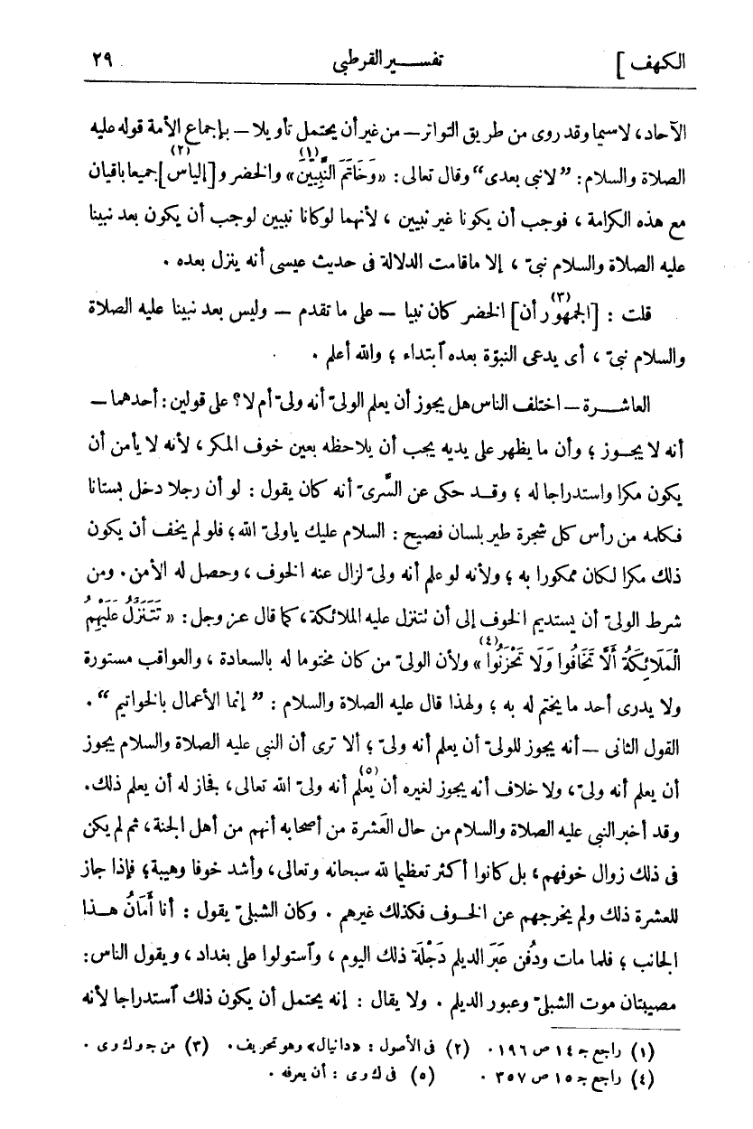 الْآحَادِ، لَا سِيَّمَا وَقَدْ رُوِيَ مِنْ طَرِيقِ التَّوَاتُرِ- مِنْ غَيْرِ أَنْ يَحْتَمِلَ تَأْوِيلًا- بِإِجْمَاعِ الْأُمَّةِ قَوْلُهُ عَلَيْهِ الصَّلَاةُ وَالسَّلَامُ: (لَا نَبِيَّ بعدي) وقال تعالى:" وَخاتَمَ النَّبِيِّينَ ٤٠" «١» [الأحزاب: ٤٠] والخضر و [إلياس «٢»] جَمِيعًا بَاقِيَانِ مَعَ هَذِهِ الْكَرَامَةِ، فَوَجَبَ أَنْ يَكُونَا غَيْرَ نَبِيَّيْنِ، لِأَنَّهُمَا لَوْ كَانَا نَبِيَّيْنِ لَوَجَبَ أَنْ يَكُونَ بَعْدَ نَبِيِّنَا عَلَيْهِ الصَّلَاةُ وَالسَّلَامُ نَبِيٌّ، إِلَّا مَا قَامَتِ الدَّلَالَةُ فِي حديث عيسى أنه ينزل بعده. قلت: [الجمهور أن [«٣» الحضر كَانَ نَبِيًّا- عَلَى مَا تَقَدَّمَ- وَلَيْسَ بَعْدَ نَبِيِّنَا عَلَيْهِ الصَّلَاةُ وَالسَّلَامُ نَبِيٌّ، أَيْ يَدَّعِي النبوة بعده ابتداء الله أَعْلَمُ. الْعَاشِرَةُ- اخْتَلَفَ النَّاسُ هَلْ يَجُوزُ أَنْ يَعْلَمَ الْوَلِيُّ أَنَّهُ وَلِيٌّ أَمْ لَا؟ عَلَى قَوْلَيْنِ: أَحَدُهُمَا- أَنَّهُ لَا يَجُوزُ، وَأَنَّ مَا يَظْهَرُ عَلَى يَدَيْهِ يَجِبُ أَنْ يُلَاحِظَهُ بِعَيْنِ خَوْفِ الْمَكْرِ، لِأَنَّهُ لَا يَأْمَنُ أَنْ يَكُونَ مَكْرًا وَاسْتِدْرَاجًا لَهُ، وَقَدْ حُكِيَ عَنِ السَّرِيِّ أَنَّهُ كَانَ يَقُولُ: لَوْ أَنَّ رَجُلًا دَخَلَ بُسْتَانًا فَكَلَّمَهُ مِنْ رَأْسِ كُلِّ شَجَرَةٍ طَيْرٌ بِلِسَانٍ فَصِيحٍ: السَّلَامُ عَلَيْكَ يَا وَلِيَّ اللَّهِ فَلَوْ لَمْ يَخَفْ أَنْ يَكُونَ ذَلِكَ مَكْرًا لَكَانَ مَمْكُورًا بِهِ، وَلِأَنَّهُ لَوْ عَلِمَ أَنَّهُ وَلِيٌّ لَزَالَ عَنْهُ الْخَوْفُ، وَحَصَلَ لَهُ الْأَمْنُ. وَمِنْ شَرْطِ الْوَلِيِّ أَنْ يَسْتَدِيمَ الْخَوْفُ إِلَى أَنْ تَتَنَزَّلَ عَلَيْهِ الْمَلَائِكَةُ، كَمَا قَالَ عَزَّ وَجَلَّ:" تَتَنَزَّلُ عَلَيْهِمُ الْمَلائِكَةُ أَلَّا تَخافُوا وَلا تَحْزَنُوا ٣٠" «٤» [فصلت: ٣٠] وَلِأَنَّ الْوَلِيَّ مَنْ كَانَ مَخْتُومًا لَهُ بِالسَّعَادَةِ، وَالْعَوَاقِبُ مَسْتُورَةٌ وَلَا يَدْرِي أَحَدٌ مَا يُخْتَمُ لَهُ بِهِ، وَلِهَذَا قَالَ عَلَيْهِ الصَّلَاةُ وَالسَّلَامُ (إِنَّمَا الْأَعْمَالُ بِالْخَوَاتِيمِ). الْقَوْلُ الثَّانِي- أَنَّهُ يَجُوزُ لِلْوَلِيِّ أَنْ يَعْلَمَ أَنَّهُ وَلِيٌّ، أَلَا تَرَى أَنَّ النَّبِيَّ عَلَيْهِ الصَّلَاةُ وَالسَّلَامُ يَجُوزُ أَنْ يَعْلَمَ أَنَّهُ وَلِيٌّ، وَلَا خِلَافَ أَنَّهُ يَجُوزُ لِغَيْرِهِ أَنْ يَعْلَمَ «٥» أَنَّهُ وَلِيُّ اللَّهِ تَعَالَى، فجاز له أَنْ يَعْلَمَ ذَلِكَ. وَقَدْ أَخْبَرَ النَّبِيُّ عَلَيْهِ الصَّلَاةُ وَالسَّلَامُ مِنْ حَالِ الْعَشَرَةِ مِنْ أَصْحَابِهِ أَنَّهُمْ مِنْ أَهْلِ الْجَنَّةِ، ثُمَّ لَمْ يَكُنْ فِي ذَلِكَ زَوَالُ خَوْفِهِمْ، بَلْ كَانُوا أَكْثَرَ تعظيما لله انه سبح وَتَعَالَى، وَأَشَدَّ خَوْفًا وَهَيْبَةً، فَإِذَا جَازَ لِلْعَشَرَةِ ذَلِكَ وَلَمْ يُخْرِجْهُمْ عَنِ الْخَوْفِ فَكَذَلِكَ غَيْرُهُمْ. وَكَانَ الشِّبْلِيُّ يَقُولُ: أَنَا أَمَانُ هَذَا الْجَانِبِ، فَلَمَّا مَاتَ وَدُفِنَ عَبَرَ الدَّيْلَمُ دِجْلَةَ ذَلِكَ الْيَوْمَ، وَاسْتَوْلَوْا عَلَى بَغْدَادَ، وَيَقُولُ النَّاسُ: مُصِيبَتَانِ مَوْتُ الشِّبْلِيِّ وَعُبُورُ الدَّيْلَمِ. وَلَا يُقَالُ: إِنَّهُ يحتمل أن يكون ذلك استدراجا لأنه