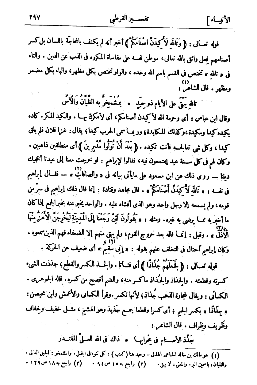 وَقَالَ ابْنُ عَبَّاسٍ: أَيْ وَحُرْمَةُ اللَّهِ لَأَكِيدَنَّ أَصْنَامَكُمْ، أَيْ لَأَمْكُرَنَّ بِهَا. وَالْكَيْدُ الْمَكْرُ. كَادَهُ يَكِيدُهُ كَيْدًا وَمَكِيدَةً، وَكَذَلِكَ الْمُكَايَدَةُ، وَرُبَّمَا سُمِّيَ الْحَرْبُ كَيْدًا، يُقَالُ: غَزَا فلان فلم يلق كيدا، وكل شي تُعَالِجُهُ فَأَنْتَ تَكِيدُهُ. (بَعْدَ أَنْ تُوَلُّوا مُدْبِرِينَ) أَيْ مُنْطَلِقِينَ ذَاهِبِينَ. وَكَانَ لَهُمْ فِي كُلِّ سَنَةٍ عِيدٌ يَجْتَمِعُونَ فِيهِ، فَقَالُوا لِإِبْرَاهِيمَ: لَوْ خَرَجْتَ مَعَنَا إِلَى عِيدِنَا أَعْجَبَكَ دِينُنَا- رُوِيَ ذَلِكَ عَنِ ابْنِ مَسْعُودٍ عَلَى مَا يَأْتِي بَيَانُهُ فِي" وَالصَّافَّاتِ" «٢» - فَقَالَ إِبْرَاهِيمُ فِي نَفْسِهِ:" وَتَاللَّهِ لَأَكِيدَنَّ أَصْنامَكُمْ". قَالَ مُجَاهِدٌ وَقَتَادَةُ: إِنَّمَا قَالَ ذَلِكَ إِبْرَاهِيمُ فِي سِرٍّ مِنْ قَوْمِهِ، وَلَمْ يَسْمَعْهُ إِلَّا رَجُلٌ وَاحِدٌ وَهُوَ الَّذِي أَفْشَاهُ عَلَيْهِ. وَالْوَاحِدُ يُخْبَرُ عَنْهُ بِخَبَرِ الْجَمْعِ إِذَا كَانَ مَا أَخْبَرَ بِهِ مِمَّا يَرْضَى بِهِ غَيْرُهُ. وَمِثْلُهُ" يَقُولُونَ لَئِنْ رَجَعْنا إِلَى الْمَدِينَةِ لَيُخْرِجَنَّ الْأَعَزُّ مِنْهَا الْأَذَلَّ" «٣» [المنافقون: ٨]. وَقِيلَ: إِنَّمَا قَالَهُ بَعْدَ خُرُوجِ الْقَوْمِ، وَلَمْ يَبْقَ مِنْهُمْ إِلَّا الضُّعَفَاءُ فَهُمُ الَّذِينَ سَمِعُوهُ. وَكَانَ إِبْرَاهِيمُ احْتَالَ فِي التَّخَلُّفِ عَنْهُمْ بِقَوْلِهِ:" إِنِّي سَقِيمٌ" [الصافات: ٨٩] أَيْ ضَعِيفٌ عَنِ الْحَرَكَةِ. قَوْلُهُ تَعَالَى: (فَجَعَلَهُمْ جُذاذاً) أَيْ فُتَاتًا. وَالْجَذُّ الْكَسْرُ وَالْقَطْعُ، جَذَذْتُ الشَّيْءَ كَسَرْتُهُ وَقَطَّعْتُهُ. وَالْجِذَاذُ وَالْجُذَاذُ مَا كُسِرَ مِنْهُ، وَالضَّمُّ أَفْصَحُ مِنْ كَسْرِهِ. قَالَهُ الْجَوْهَرِيُّ. الْكِسَائِيُّ: وَيُقَالُ لِحِجَارَةِ الذَّهَبِ جُذَاذٌ، لِأَنَّهَا تُكْسَرُ. وَقَرَأَ الْكِسَائِيُّ وَالْأَعْمَشُ وَابْنُ مُحَيْصِنٍ:" جِذَاذًا" بِكَسْرِ الْجِيمِ، أَيْ كِسَرًا وَقِطَعًا جَمْعُ جَذِيذٍ وَهُوَ الْهَشِيمُ، مِثْلَ خَفِيفٍ وَخِفَافٍ وَظَرِيفٍ وَظِرَافٍ. قَالَ الشاعر: