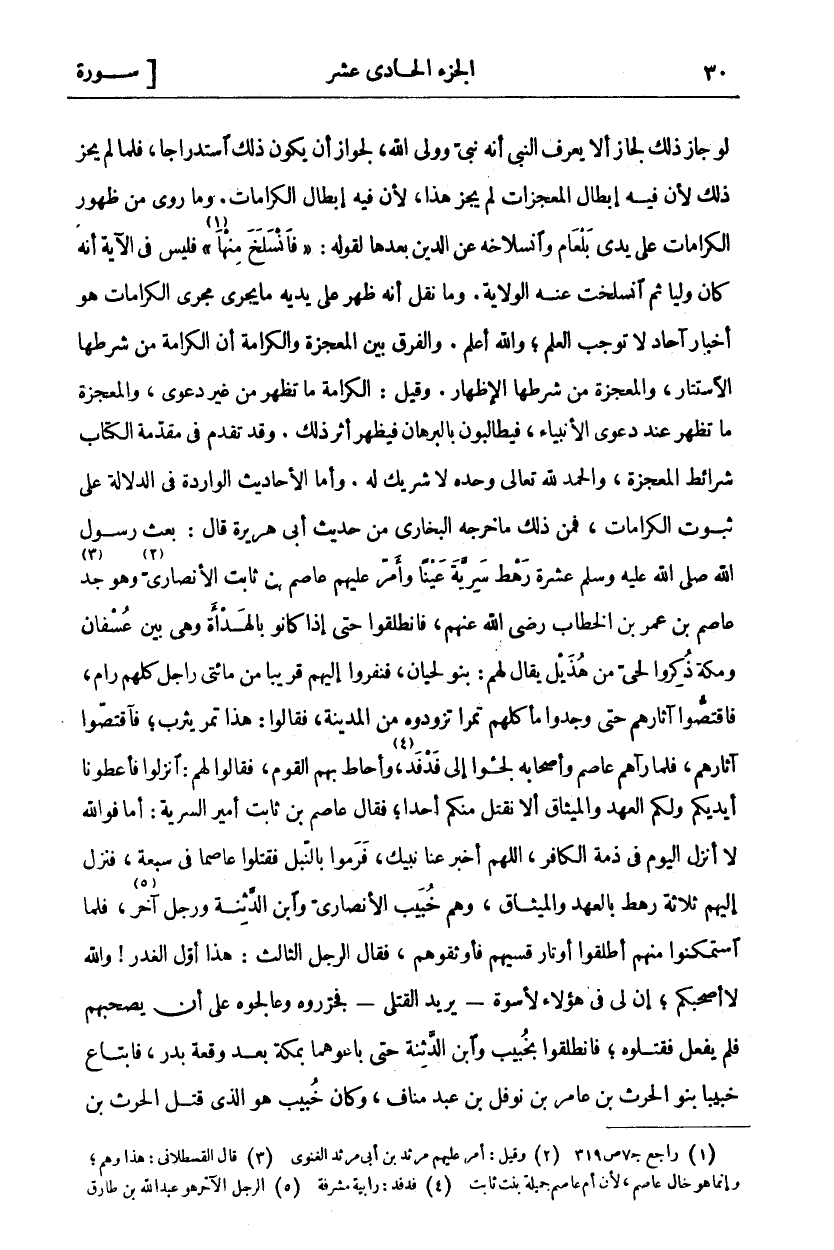 لَوْ جَازَ ذَلِكَ لَجَازَ أَلَّا يَعْرِفَ النَّبِيُّ أَنَّهُ نَبِيٌّ وَوَلِيُّ اللَّهِ، لِجَوَازِ أَنْ يَكُونَ ذَلِكَ اسْتِدْرَاجًا، فَلَمَّا لَمْ يَجُزْ ذَلِكَ لِأَنَّ فِيهِ إِبْطَالُ الْمُعْجِزَاتِ لَمْ يَجُزْ هَذَا، لِأَنَّ فِيهِ إِبْطَالُ الْكَرَامَاتِ. وَمَا رُوِيَ مِنْ ظُهُورِ الْكَرَامَاتِ عَلَى يَدَيْ بَلْعَامَ وَانْسِلَاخِهِ عَنِ الدِّينِ بعدها لقوله:" فَانْسَلَخَ مِنْها" «١» [الأعراف: ١٧٥] فَلَيْسَ فِي الْآيَةِ أَنَّهُ كَانَ وَلِيًّا ثُمَّ انْسَلَخَتْ عَنْهُ الْوِلَايَةُ. وَمَا نُقِلَ أَنَّهُ ظَهَرَ عَلَى يَدَيْهِ مَا يَجْرِي مَجْرَى الْكَرَامَاتِ هُوَ أَخْبَارُ آحَادٍ لَا تُوجِبُ الْعِلْمَ، وَاللَّهُ أَعْلَمُ. وَالْفَرْقُ بَيْنَ الْمُعْجِزَةِ وَالْكَرَامَةِ أَنَّ الْكَرَامَةَ مِنْ شَرْطِهَا الِاسْتِتَارُ، وَالْمُعْجِزَةُ مِنْ شَرْطِهَا الْإِظْهَارُ. وَقِيلَ: الْكَرَامَةُ مَا تَظْهَرُ مِنْ غَيْرِ دَعْوَى وَالْمُعْجِزَةُ مَا تَظْهَرُ عِنْدَ دَعْوَى الْأَنْبِيَاءِ فَيُطَالَبُونَ بِالْبُرْهَانِ فَيَظْهَرُ أَثَرُ ذَلِكَ. وَقَدْ تَقَدَّمَ فِي مُقَدِّمَةِ الْكِتَابِ شَرَائِطُ الْمُعْجِزَةِ، وَالْحَمْدُ لِلَّهِ تَعَالَى وَحْدَهُ لَا شَرِيكَ لَهُ. وَأَمَّا الْأَحَادِيثُ الْوَارِدَةُ فِي الدَّلَالَةِ عَلَى ثُبُوتِ الْكَرَامَاتِ، فَمِنْ ذَلِكَ مَا خَرَّجَهُ الْبُخَارِيُّ مِنْ حَدِيثِ أَبِي هُرَيْرَةَ قَالَ: بَعَثَ رَسُولُ اللَّهِ صَلَّى اللَّهُ عَلَيْهِ وَسَلَّمَ عشرة رهط سرية عينا وَأَمَّرَ عَلَيْهِمْ عَاصِمَ بْنَ ثَابِتٍ الْأَنْصَارِيَّ «٢» وَهُوَ جَدُّ «٣» عَاصِمِ بْنِ عُمَرَ بْنِ الْخَطَّابِ رَضِيَ اللَّهُ عَنْهُ، فَانْطَلَقُوا حَتَّى إِذَا كَانُوا بِالْهَدَأَةِ وَهِيَ بَيْنَ عُسْفَانَ وَمَكَّةَ ذُكِرُوا لِحَيٍّ مِنْ هُذَيْلٍ يُقَالُ لَهُمْ: بَنُو لِحْيَانَ فَنَفَرُوا إِلَيْهِمْ قَرِيبًا مِنْ مِائَتَيْ رَاجِلٍ كُلُّهُمْ رَامٍ، فَاقْتَصُّوا آثَارَهُمْ حَتَّى وَجَدُوا مَأْكَلَهُمْ تَمْرًا تَزَوَّدُوهُ مِنَ الْمَدِينَةِ، فَقَالُوا: هَذَا تَمْرُ يَثْرِبَ، فَاقْتَصُّوا آثَارَهُمْ، فلما رآهم عاصم وأصحابه لجوا إِلَى فَدْفَدٍ «٤»، وَأَحَاطَ بِهِمُ الْقَوْمُ، فَقَالُوا لَهُمْ: انْزِلُوا فَأَعْطُونَا أَيْدِيَكُمْ وَلَكُمُ الْعَهْدُ وَالْمِيثَاقُ أَلَّا نَقْتُلَ مِنْكُمْ أَحَدًا، فَقَالَ عَاصِمُ بْنُ ثَابِتٍ أمير السرية: أما فو الله لَا أَنْزِلُ الْيَوْمَ فِي ذِمَّةِ الْكَافِرِ، اللَّهُمَّ أَخْبِرْ عَنَّا نَبِيَّكَ، فَرَمَوْا بِالنَّبْلِ فَقَتَلُوا عَاصِمًا فِي سَبْعَةٍ، فَنَزَلَ إِلَيْهِمْ ثَلَاثَةُ رَهْطٍ بِالْعَهْدِ وَالْمِيثَاقِ، وَهُمْ خُبَيْبٌ الْأَنْصَارِيُّ وَابْنُ الدَّثِنَةِ وَرَجُلٌ آخرا «٥»، فَلَمَّا اسْتَمْكَنُوا مِنْهُمْ أَطْلَقُوا أَوْتَارَ قِسِيِّهِمْ فَأَوْثَقُوهُمْ، فَقَالَ الرَّجُلُ الثَّالِثُ: هَذَا أَوَّلُ الْغَدْرِ! وَاللَّهِ لَا أَصْحَبُكُمْ، إِنَّ لِي فِي هَؤُلَاءِ لَأُسْوَةٌ- يريد القتلى- فجزروه وَعَالَجُوهُ عَلَى أَنْ يَصْحَبَهُمْ فَلَمْ يَفْعَلْ فَقَتَلُوهُ، فَانْطَلَقُوا بِخُبَيْبٍ وَابْنِ الدَّثِنَةِ حَتَّى بَاعُوهُمَا بِمَكَّةَ بعد وقعة بدر، فابتاع خبيبا بنو الحرث بْنِ عَامِرِ بْنِ نَوْفَلِ بْنِ عَبْدِ مَنَافٍ، وكان خبيب هو الذي قتل الحرث بن