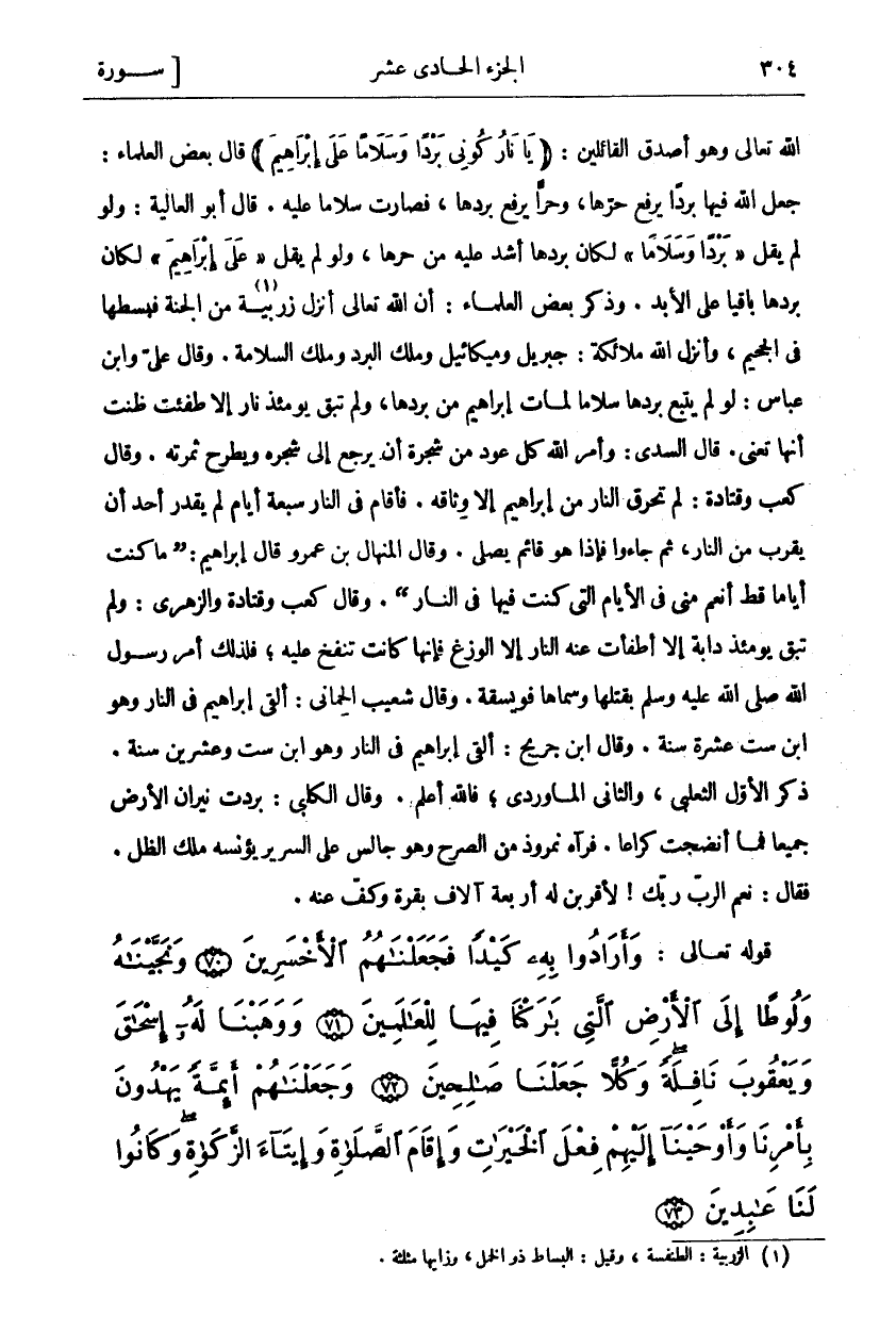اللَّهُ تَعَالَى وَهُوَ أَصْدَقُ الْقَائِلِينَ: (يَا نارُ كُونِي بَرْداً وَسَلاماً عَلى إِبْراهِيمَ) قَالَ بَعْضُ الْعُلَمَاءِ: جَعَلَ اللَّهُ فِيهَا بَرْدًا يَرْفَعُ حَرَّهَا، وَحَرًّا يَرْفَعُ بَرْدَهَا، فَصَارَتْ سَلَامًا عَلَيْهِ. قَالَ أَبُو الْعَالِيَةِ: وَلَوْ لَمْ يَقُلْ" بَرْداً وَسَلاماً" لَكَانَ بَرْدُهَا أَشَدَّ عَلَيْهِ مِنْ حَرِّهَا، وَلَوْ لَمْ يَقُلْ" عَلى إِبْراهِيمَ" لَكَانَ بَرْدُهَا بَاقِيًا عَلَى الْأَبَدِ. وَذَكَرَ بَعْضُ الْعُلَمَاءِ: أَنَّ اللَّهَ تَعَالَى أَنْزَلَ زِرْبِيَّةً «١» مِنَ الْجَنَّةِ فَبَسَطَهَا فِي الْجَحِيمِ، وَأَنْزَلَ اللَّهُ مَلَائِكَةً: جِبْرِيلَ وَمِيكَائِيلَ وَمَلَكَ البرد وملك السلامة. وَقَالَ عَلِيٌّ وَابْنُ عَبَّاسٍ: لَوْ لَمْ يُتْبِعْ بَرْدَهَا سَلَامًا لَمَاتَ إِبْرَاهِيمُ مِنْ بَرْدِهَا، وَلَمْ تَبْقَ يَوْمَئِذٍ نَارٌ إِلَّا طُفِئَتْ ظَنَّتْ أَنَّهَا تُعْنَى. قَالَ السُّدِّيُّ: وَأَمَرَ اللَّهُ كُلَّ عُودٍ مِنْ شَجَرَةٍ أَنْ يَرْجِعَ إِلَى شَجَرِهِ وَيَطْرَحَ ثَمَرَتَهُ. وَقَالَ كَعْبٌ وَقَتَادَةُ: لَمْ تُحْرِقِ النَّارُ مِنْ إِبْرَاهِيمَ إِلَّا وِثَاقَهُ. فَأَقَامَ فِي النَّارِ سَبْعَةَ أَيَّامٍ لَمْ يَقْدِرْ أَحَدٌ أَنْ يَقْرَبَ مِنَ النَّارِ، ثُمَّ جَاءُوا فَإِذَا هُوَ قَائِمٌ يُصَلِّي. وَقَالَ الْمِنْهَالُ بْنُ عَمْرٍو قَالَ إِبْرَاهِيمُ:" مَا كُنْتُ أَيَّامًا قَطُّ أَنْعَمَ مِنِّي فِي الْأَيَّامِ الَّتِي كُنْتُ فِيهَا فِي النَّارِ". وَقَالَ كَعْبٌ وَقَتَادَةُ وَالزُّهْرِيُّ: وَلَمْ تَبْقَ يَوْمَئِذٍ دَابَّةٌ إِلَّا أَطْفَأَتْ عَنْهُ النَّارَ إِلَّا الْوَزَغُ فَإِنَّهَا كَانَتْ تَنْفُخُ عَلَيْهِ، فَلِذَلِكَ أَمَرَ رَسُولُ اللَّهِ صَلَّى اللَّهُ عَلَيْهِ وَسَلَّمَ بِقَتْلِهَا وَسَمَّاهَا فُوَيْسِقَةٌ. وَقَالَ شُعَيْبٌ الْحِمَّانِيُّ: أُلْقِيَ إِبْرَاهِيمُ فِي النَّارِ وَهُوَ ابْنُ سِتَّ عَشْرَةَ سَنَةً. وَقَالَ ابْنُ جُرَيْجٍ: أُلْقِيَ إِبْرَاهِيمُ فِي النَّارِ وَهُوَ ابْنُ سِتٍّ وَعِشْرِينَ سَنَةً. ذَكَرَ الْأَوَّلَ الثَّعْلَبِيُّ، وَالثَّانِي الْمَاوَرْدِيُّ، فَاللَّهُ أَعْلَمُ. وَقَالَ الْكَلْبِيُّ: بَرَدَتْ نِيرَانُ الأرض جميعا فما أنضجت كراعا، فرآه نمروذ من الصرح وَهُوَ جَالِسٌ عَلَى السَّرِيرِ يُؤْنِسُهُ مَلَكُ الظِّلِّ. فَقَالَ: نِعْمَ الرَّبُّ رَبُّكَ! لَأُقَرِّبَنَّ لَهُ أَرْبَعَةَ آلاف بقرة وكف عنه.