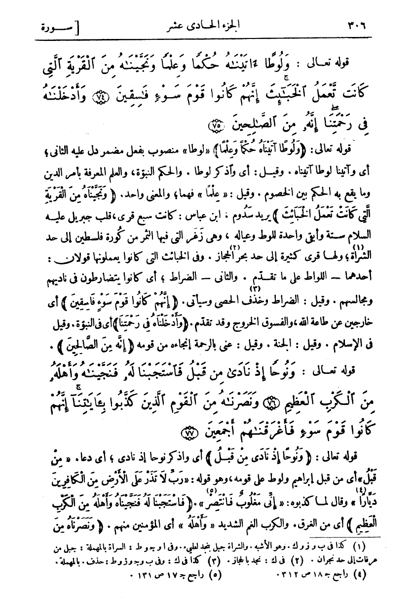 قَوْلُهُ تَعَالَى: (وَلُوطاً آتَيْناهُ حُكْماً وَعِلْماً) " لُوطاً" مَنْصُوبٌ بِفِعْلٍ مُضْمَرٍ دَلَّ عَلَيْهِ الثَّانِي، أَيْ وآتينا لوط آتَيْنَاهُ. وَقِيلَ: أَيْ وَاذْكُرْ لُوطًا. وَالْحُكْمُ النُّبُوَّةُ، وَالْعِلْمُ الْمَعْرِفَةُ بِأَمْرِ الدِّينِ وَمَا يَقَعُ بِهِ الْحُكْمُ بَيْنَ الْخُصُومِ. وَقِيلَ:" عِلْماً" فَهْمًا، وَالْمَعْنَى وَاحِدٌ. (وَنَجَّيْناهُ مِنَ الْقَرْيَةِ الَّتِي كانَتْ تَعْمَلُ الْخَبائِثَ) يُرِيدُ سَدُومَ. ابْنُ عَبَّاسٍ: كَانَتْ سَبْعَ قُرَى، قَلَبَ جِبْرِيلُ عَلَيْهِ السَّلَامُ سِتَّةً وَأَبْقَى وَاحِدَةً لِلُوطٍ وَعِيَالِهِ، وَهِيَ زُغَرُ الَّتِي فِيهَا الثمر من كورة فلسطين إلى حد الشراة «١»، وَلَهَا قُرَى كَثِيرَةٌ إِلَى حَدِّ بَحْرِ الْحِجَازِ «٢». وَفِي الْخَبَائِثِ الَّتِي كَانُوا يَعْمَلُونَهَا قَوْلَانِ: أَحَدُهُمَا: اللِّوَاطُ عَلَى مَا تَقَدَّمَ. وَالثَّانِي: الضُّرَاطُ، أَيْ كَانُوا يَتَضَارَطُونَ فِي نَادِيهِمْ وَمَجَالِسِهِمْ. وَقِيلَ: الضُّرَاطُ وخذف «٣» الْحَصَى وَسَيَأْتِي. (إِنَّهُمْ كانُوا قَوْمَ سَوْءٍ فاسِقِينَ) أَيْ خَارِجِينَ عَنْ طَاعَةِ اللَّهِ، وَالْفُسُوقُ الْخُرُوجُ وقد تقدم. (وَأَدْخَلْناهُ فِي رَحْمَتِنا) أي فِي النُّبُوَّةِ. وَقِيلَ: فِي الْإِسْلَامِ. وَقِيلَ: الْجَنَّةِ. وَقِيلَ: عَنَى بِالرَّحْمَةِ إِنْجَاءَهُ مِنْ قَوْمِهِ (إِنَّهُ مِنَ الصَّالِحِينَ).