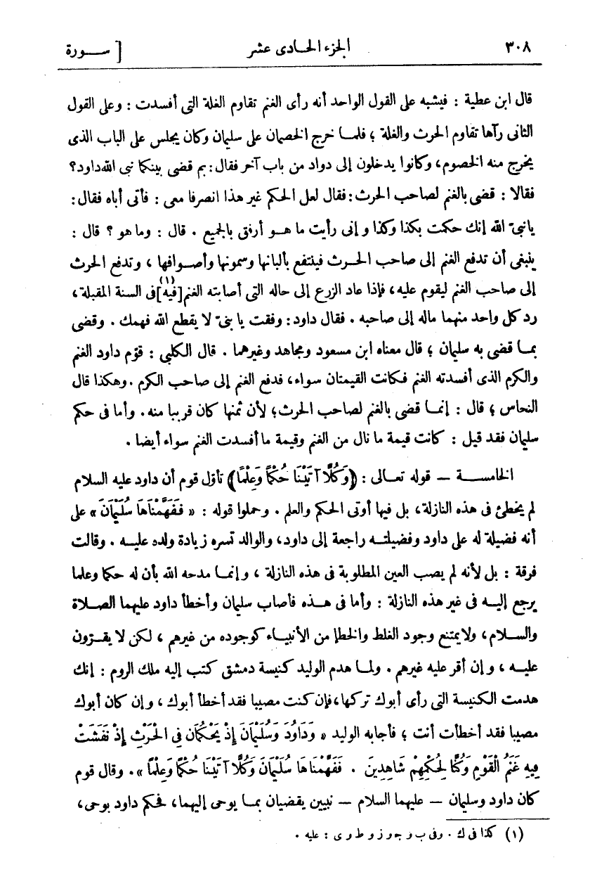 قَالَ ابْنُ عَطِيَّةَ: فَيُشْبِهُ عَلَى الْقَوْلِ الْوَاحِدِ أَنَّهُ رَأَى الْغَنَمَ تُقَاوِمُ الْغَلَّةَ الَّتِي أُفْسِدَتْ. وَعَلَى الْقَوْلِ الثَّانِي رَآهَا تُقَاوِمُ الْحَرْثَ وَالْغَلَّةَ، فَلَمَّا خَرَجَ الْخَصْمَانِ عَلَى سُلَيْمَانَ وَكَانَ يَجْلِسُ عَلَى الْبَابِ الَّذِي يَخْرُجُ مِنْهُ الْخُصُومُ، وَكَانُوا يَدْخُلُونَ إِلَى دَاوُدَ مِنْ بَابٍ آخَرَ فَقَالَ: بِمَ قَضَى بَيْنَكُمَا نَبِيُّ اللَّهِ دَاوُدُ؟ فَقَالَا: قَضَى بِالْغَنَمِ لِصَاحِبِ الْحَرْثِ: فَقَالَ لَعَلَّ الْحُكْمَ غَيْرَ هَذَا انْصَرِفَا مَعِي: فَأَتَى أَبَاهُ فَقَالَ: يَا نَبِيَّ اللَّهِ إِنَّكَ حَكَمْتَ بِكَذَا وَكَذَا وَإِنِّي رَأَيْتُ مَا هُوَ أَرْفَقُ بِالْجَمِيعِ. قَالَ: وَمَا هُوَ؟ قَالَ: يَنْبَغِي أَنْ تَدْفَعَ الْغَنَمَ إِلَى صَاحِبِ الْحَرْثِ فَيَنْتَفِعَ بِأَلْبَانِهَا وَسُمُونِهَا وَأَصْوَافِهَا، وَتَدْفَعَ الْحَرْثَ إِلَى صَاحِبِ الْغَنَمِ لِيَقُومَ عَلَيْهِ، فَإِذَا عَادَ الزَّرْعُ إِلَى حَالِهِ الَّتِي أَصَابَتْهُ الغنم [فيه «١»] فِي السَّنَةِ الْمُقْبِلَةِ، رَدَّ كُلُّ وَاحِدٍ مِنْهُمَا مَالَهُ إِلَى صَاحِبِهِ. فَقَالَ دَاوُدُ: وُفِّقْتَ يَا بُنَيَّ لَا يَقْطَعُ اللَّهُ فَهْمَكَ. وَقَضَى بِمَا قَضَى بِهِ سُلَيْمَانُ، قَالَ مَعْنَاهُ ابْنُ مَسْعُودٍ وَمُجَاهِدٌ وَغَيْرُهُمَا. قَالَ الْكَلْبِيُّ: قَوَّمَ دَاوُدَ الْغَنَمَ وَالْكَرْمَ الَّذِي أَفْسَدَتْهُ الْغَنَمُ فَكَانَتِ الْقِيمَتَانِ سَوَاءً، فَدَفَعَ الْغَنَمَ إِلَى صَاحِبِ الْكَرْمِ. وَهَكَذَا قَالَ النَّحَّاسُ، قَالَ: إِنَّمَا قَضَى بِالْغَنَمِ لِصَاحِبِ الْحَرْثِ، لِأَنَّ ثَمَنَهَا كَانَ قَرِيبًا مِنْهُ. وَأَمَّا فِي حُكْمِ سُلَيْمَانَ فَقَدْ قِيلَ: كَانَتْ قِيمَةُ مَا نَالَ مِنَ الْغَنَمِ وَقِيمَةُ مَا أَفْسَدَتِ الْغَنَمُ سَوَاءً أَيْضًا. الْخَامِسَةُ- (وَكُلًّا آتَيْنا حُكْماً وَعِلْماً) تَأَوَّلَ قَوْمٌ أَنَّ دَاوُدَ عَلَيْهِ السَّلَامُ لَمْ يُخْطِئْ فِي هَذِهِ النَّازِلَةِ، بَلْ فِيهَا أُوتِيَ الْحُكْمَ وَالْعِلْمَ. وَحَمَلُوا قَوْلَهُ:" فَفَهَّمْناها سُلَيْمانَ" عَلَى أَنَّهُ فَضِيلَةٌ لَهُ عَلَى دَاوُدَ وَفَضِيلَتُهُ رَاجِعَةٌ إِلَى دَاوُدَ، وَالْوَالِدُ تَسُرُّهُ زِيَادَةُ وَلَدِهِ عَلَيْهِ. وَقَالَتْ فِرْقَةٌ: بَلْ لِأَنَّهُ لَمْ يُصِبِ الْعَيْنَ الْمَطْلُوبَةَ فِي هَذِهِ النَّازِلَةِ، وَإِنَّمَا مَدَحَهُ اللَّهُ بِأَنَّ لَهُ حُكْمًا وَعِلْمًا يُرْجَعُ إِلَيْهِ فِي غَيْرِ هَذِهِ النَّازِلَةِ. وَأَمَّا فِي هَذِهِ فَأَصَابَ سُلَيْمَانُ وَأَخْطَأَ دَاوُدُ عَلَيْهِمَا الصَّلَاةُ وَالسَّلَامُ، وَلَا يَمْتَنِعُ وُجُودُ الْغَلَطِ وَالْخَطَأِ مِنَ الْأَنْبِيَاءِ كَوُجُودِهِ مِنْ غَيْرِهِمْ، لَكِنْ لَا يُقَرُّونَ عَلَيْهِ، وَإِنْ أُقِرَّ عَلَيْهِ غَيْرُهُمْ. وَلَمَّا هَدَمَ الْوَلِيدُ كَنِيسَةَ دِمَشْقَ كَتَبَ إِلَيْهِ مَلِكُ الرُّومِ: إِنَّكَ هَدَمْتَ الْكَنِيسَةَ الَّتِي رَأَى أَبُوكَ تَرْكَهَا، فَإِنْ كُنْتَ مُصِيبًا فَقَدْ أَخْطَأَ أَبُوكَ، وَإِنْ كَانَ أَبُوكَ مُصِيبًا فَقَدْ أَخْطَأْتَ أَنْتَ، فَأَجَابَهُ الْوَلِيدُ" وَداوُدَ وَسُلَيْمانَ إِذْ يَحْكُمانِ فِي الْحَرْثِ إِذْ نَفَشَتْ فِيهِ غَنَمُ الْقَوْمِ وَكُنَّا لِحُكْمِهِمْ شاهِدِينَ. فَفَهَّمْناها سُلَيْمانَ وَكُلًّا آتَيْنا حُكْماً وَعِلْماً". وَقَالَ قَوْمٌ كَانَ دَاوُدُ وَسُلَيْمَانُ- عَلَيْهِمَا السَّلَامُ- نَبِيَّيْنِ يَقْضِيَانِ بما يوحى إليهما، فحكم داود بوحي،