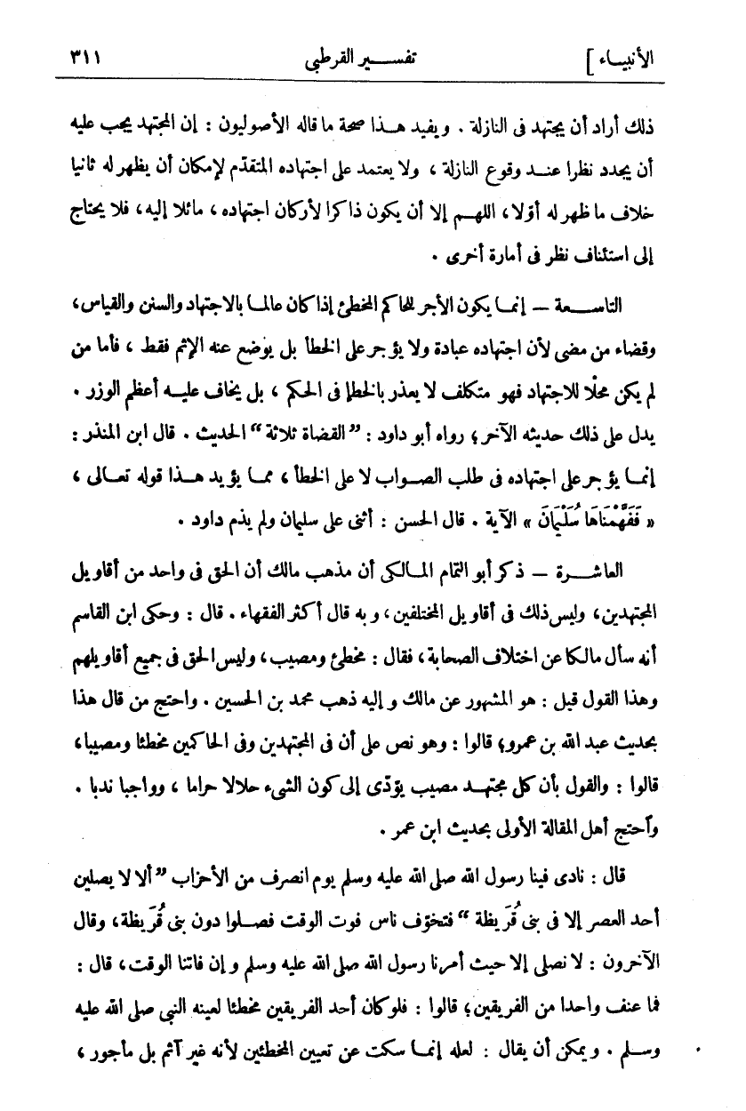ذَلِكَ أَرَادَ أَنْ يَجْتَهِدَ فِي النَّازِلَةِ. وَيُفِيدُ هَذَا صِحَّةَ مَا قَالَهُ الْأُصُولِيُّونَ: إِنَّ الْمُجْتَهِدَ يَجِبُ عَلَيْهِ أَنْ يُجَدِّدَ نَظَرًا عِنْدَ وُقُوعِ النَّازِلَةِ، وَلَا يَعْتَمِدَ عَلَى اجْتِهَادِهِ الْمُتَقَدِّمِ لِإِمْكَانِ أَنْ يَظْهَرَ لَهُ ثَانِيًا خِلَافُ مَا ظَهَرَ لَهُ أَوَّلًا، اللَّهُمَّ إِلَّا أَنْ يَكُونَ ذَاكِرًا لِأَرْكَانِ اجْتِهَادِهِ، مَائِلًا إِلَيْهِ، فَلَا يَحْتَاجُ إِلَى اسْتِئْنَافِ نَظَرٍ فِي أَمَارَةٍ أُخْرَى. التَّاسِعَةُ- إِنَّمَا يكون يَكُونُ الْأَجْرُ لِلْحَاكِمِ الْمُخْطِئِ إِذَا كَانَ عَالِمًا بِالِاجْتِهَادِ وَالسُّنَنِ وَالْقِيَاسِ، وَقَضَاءِ مَنْ مَضَى لِأَنَّ اجْتِهَادَهُ عِبَادَةٌ وَلَا يُؤْجَرُ عَلَى الْخَطَأِ بَلْ يُوضَعُ عَنْهُ الْإِثْمُ فَقَطْ، فَأَمَّا مَنْ لَمْ يَكُنْ مَحَلًّا لِلِاجْتِهَادِ فَهُوَ مُتَكَلِّفٌ لَا يُعْذَرُ بِالْخَطَأِ فِي الْحُكْمِ، بَلْ يُخَافُ عَلَيْهِ أَعْظَمُ الْوِزْرِ. يَدُلُّ عَلَى ذَلِكَ حَدِيثُهُ الْآخَرُ، رَوَاهُ أَبُو دَاوُدَ: (الْقُضَاةُ ثَلَاثَةٌ) الْحَدِيثَ. قَالَ ابْنُ الْمُنْذِرِ: إِنَّمَا يُؤْجَرُ عَلَى اجْتِهَادِهِ فِي طَلَبِ الصَّوَابِ لَا عَلَى الْخَطَأِ، وَمِمَّا يُؤَيِّدُ هَذَا قَوْلُهُ تَعَالَى:" فَفَهَّمْناها سُلَيْمانَ" الْآيَةَ. قَالَ الْحَسَنُ: أَثْنَى عَلَى سُلَيْمَانَ وَلَمْ يَذُمَّ دَاوُدَ. الْعَاشِرَةُ- ذَكَرَ أَبُو التَّمَّامِ الْمَالِكِيِّ أَنَّ مَذْهَبَ مَالِكٍ أَنَّ الْحَقَّ فِي وَاحِدٍ مِنْ أَقَاوِيلِ الْمُجْتَهِدِينَ وَلَيْسَ ذَلِكَ فِي أَقَاوِيلِ الْمُخْتَلِفِينَ، وَبِهِ قَالَ أَكْثَرُ الْفُقَهَاءِ. قَالَ: وَحَكَى ابْنُ الْقَاسِمِ أَنَّهُ سَأَلَ مَالِكًا عَنِ اخْتِلَافِ الصَّحَابَةِ، فَقَالَ: مُخْطِئٌ وَمُصِيبٌ، وَلَيْسَ الْحَقُّ فِي جَمِيعِ أَقَاوِيلِهِمْ. وَهَذَا الْقَوْلُ قِيلَ: هُوَ الْمَشْهُورُ عَنْ مَالِكٍ وَإِلَيْهِ ذَهَبَ مُحَمَّدُ بْنُ الْحُسَيْنِ. وَاحْتَجَّ مَنْ قَالَ هَذَا بِحَدِيثِ عَبْدِ اللَّهِ بْنِ عَمْرٍو، قَالُوا: وَهُوَ نَصٌّ عَلَى أَنَّ فِي الْمُجْتَهِدِينَ وَفِي الْحَاكِمِينَ مُخْطِئًا وَمُصِيبًا، قَالُوا: وَالْقَوْلُ بِأَنَّ كُلَّ مُجْتَهِدٍ مُصِيبٌ يُؤَدِّي إِلَى كَوْنِ الشَّيْءِ حَلَالًا حَرَامًا، وَوَاجِبًا نَدْبًا. وَاحْتَجَّ أَهْلُ الْمَقَالَةِ الْأُولَى بِحَدِيثِ ابْنِ عُمَرَ. قَالَ: نَادَى فِينَا رَسُولُ اللَّهِ صَلَّى اللَّهُ عَلَيْهِ وَسَلَّمَ يَوْمَ انْصَرَفَ مِنَ الْأَحْزَابِ (أَلَا لَا يُصَلِّيَنَّ أَحَدٌ الْعَصْرَ إِلَّا فِي بَنِي قُرَيْظَةَ) فَتَخَوَّفَ نَاسٌ فَوْتَ الْوَقْتِ فَصَلُّوا دُونَ بَنِي قُرَيْظَةَ، وَقَالَ الْآخَرُونَ: لَا نُصَلِّي إِلَّا حَيْثُ أَمَرَنَا رَسُولُ اللَّهِ صَلَّى اللَّهُ عَلَيْهِ وَسَلَّمَ وَإِنْ فَاتَنَا الْوَقْتُ، قَالَ: فَمَا عَنَّفَ وَاحِدًا مِنَ الْفَرِيقَيْنِ، قَالُوا: فَلَوْ كَانَ أَحَدُ الْفَرِيقَيْنِ مُخْطِئًا لَعَيَّنَهُ النَّبِيُّ صَلَّى اللَّهُ عَلَيْهِ وَسَلَّمَ. وَيُمْكِنُ أَنْ يُقَالَ: لَعَلَّهُ إِنَّمَا سَكَتَ عَنْ تَعْيِينِ الْمُخْطِئِينَ لِأَنَّهُ غَيْرُ آثِمٍ بَلْ مَأْجُورٌ،