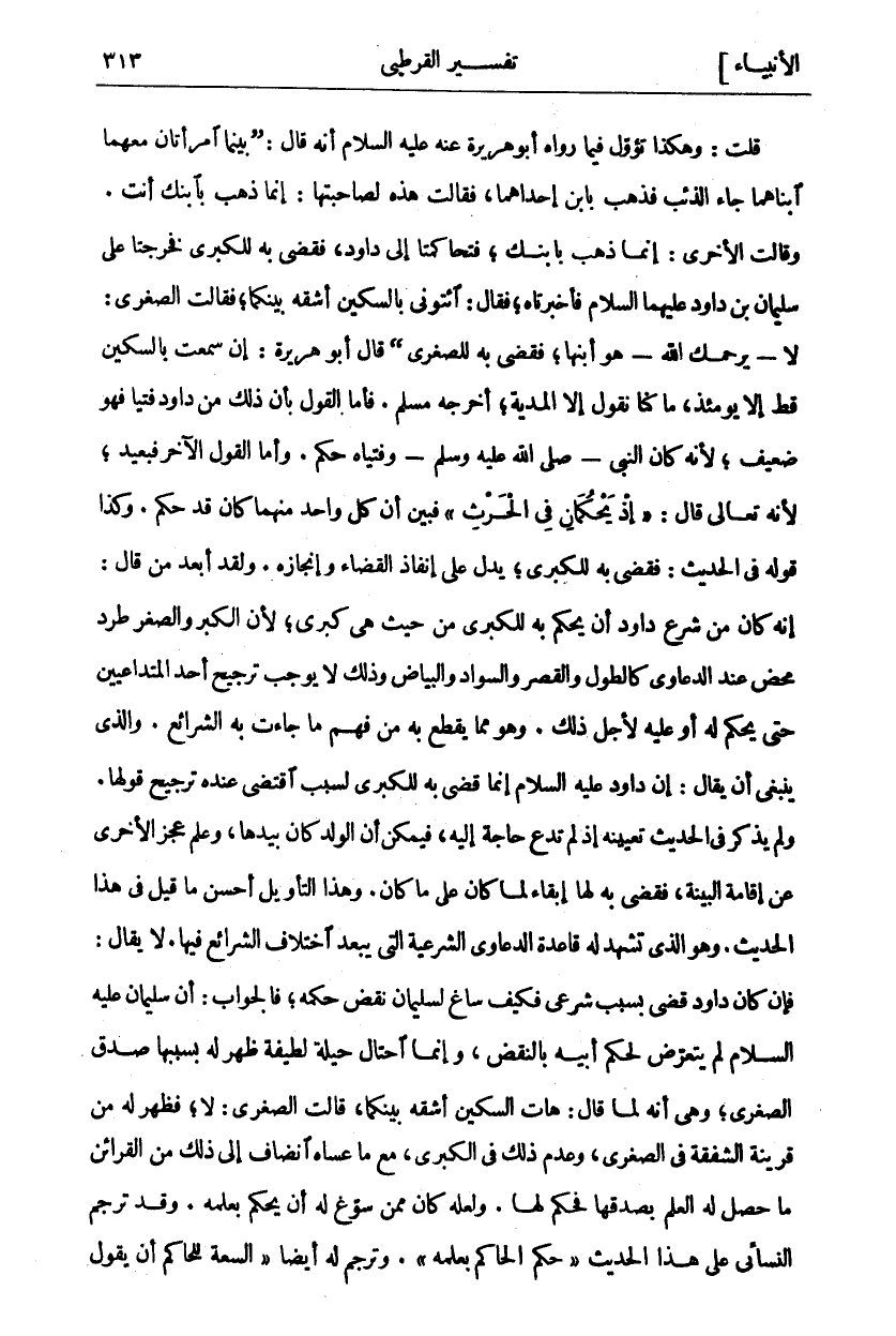 هَذِهِ لِصَاحِبَتِهَا: إِنَّمَا ذَهَبَ بِابْنِكِ أَنْتِ. وَقَالَتِ الْأُخْرَى: إِنَّمَا ذَهَبَ بِابْنِكِ، فَتَحَاكَمَتَا إِلَى دَاوُدَ، فَقَضَى بِهِ لِلْكُبْرَى فَخَرَجَتَا عَلَى سُلَيْمَانَ بْنِ دَاوُدَ عَلَيْهِمَا السَّلَامُ فَأَخْبَرَتَاهُ، فَقَالَ: ائْتُونِي بِالسِّكِّينِ أَشُقُّهُ بَيْنَكُمَا، فَقَالَتِ الصُّغْرَى: لَا- يَرْحَمُكَ اللَّهُ- هُوَ ابْنُهَا، فَقَضَى بِهِ لِلصُّغْرَى، قَالَ أَبُو هُرَيْرَةَ: إِنْ سَمِعْتُ بِالسِّكِّينِ قَطُّ إِلَّا يَوْمَئِذٍ، مَا كُنَّا نَقُولُ إِلَّا الْمُدْيَةَ، أَخْرَجَهُ مُسْلِمٌ. فَأَمَّا الْقَوْلُ بِأَنَّ ذَلِكَ مِنْ دَاوُدَ فُتْيَا فَهُوَ ضَعِيفٌ، لِأَنَّهُ كَانَ النَّبِيُّ- صَلَّى اللَّهُ عَلَيْهِ وَسَلَّمَ- وَفُتْيَاهُ حُكْمٌ. وَأَمَّا الْقَوْلُ الْآخَرُ فَيَبْعُدُ، لِأَنَّهُ تَعَالَى قَالَ:" إِذْ يَحْكُمانِ فِي الْحَرْثِ" فَبَيَّنَ أَنَّ كُلَّ وَاحِدٍ مِنْهُمَا كَانَ قَدْ حَكَمَ. وَكَذَا قَوْلُهُ فِي الْحَدِيثِ: فَقَضَى بِهِ لِلْكُبْرَى، يَدُلُّ عَلَى إِنْفَاذِ الْقَضَاءِ وَإِنْجَازِهِ. وَلَقَدْ أَبْعَدَ مَنْ قَالَ: إِنَّهُ كَانَ مِنْ شَرْعِ دَاوُدَ أَنْ يَحْكُمَ بِهِ لِلْكُبْرَى مِنْ حَيْثُ هِيَ كُبْرَى، لِأَنَّ الْكِبَرَ وَالصِّغَرَ طَرْدٌ مَحْضٌ عِنْدَ الدَّعَاوَى كَالطُّولِ وَالْقِصَرِ وَالسَّوَادِ وَالْبَيَاضِ وَذَلِكَ لَا يُوجِبُ تَرْجِيحَ أَحَدِ الْمُتَدَاعِيَيْنِ حَتَّى يُحْكَمَ لَهُ أَوْ عَلَيْهِ لِأَجْلِ ذَلِكَ. وَهُوَ مِمَّا يَقْطَعُ بِهِ مَنْ فَهِمَ مَا جَاءَتْ بِهِ الشَّرَائِعُ. وَالَّذِي يَنْبَغِي أَنْ يُقَالَ: إِنَّ دَاوُدَ عَلَيْهِ السَّلَامُ إِنَّمَا قَضَى بِهِ لِلْكُبْرَى لِسَبَبٍ اقْتَضَى عِنْدَهُ تَرْجِيحَ قَوْلِهَا. وَلَمْ يَذْكُرْ فِي الْحَدِيثِ تَعْيِينَهُ إِذْ لَمْ تَدْعُ حَاجَةٌ إِلَيْهِ، فَيُمْكِنُ أَنَّ الْوَلَدَ كَانَ بِيَدِهَا، وَعَلِمَ عَجْزَ الْأُخْرَى عَنْ إِقَامَةِ الْبَيِّنَةِ، فَقَضَى بِهِ لَهَا إِبْقَاءً لِمَا كَانَ عَلَى مَا كَانَ. وَهَذَا التَّأْوِيلُ أَحْسَنُ مَا قِيلَ فِي هَذَا الْحَدِيثِ. وَهُوَ الَّذِي تَشْهَدُ لَهُ قَاعِدَةُ الدَّعَاوَى الشَّرْعِيَّةِ الَّتِي يَبْعُدُ اخْتِلَافُ الشَّرَائِعِ فِيهَا. لَا يُقَالُ: فَإِنْ كَانَ دَاوُدُ قَضَى بِسَبَبٍ شَرْعِيٍّ فَكَيْفَ سَاغَ لِسُلَيْمَانَ نَقْضُ حُكْمِهِ، فَالْجَوَابُ: أَنَّ سُلَيْمَانَ عَلَيْهِ السَّلَامُ لَمْ يَتَعَرَّضْ لِحُكْمِ أَبِيهِ بِالنَّقْضِ، وَإِنَّمَا احْتَالَ حِيلَةً لَطِيفَةً ظَهَرَ لَهُ بِسَبَبِهَا صِدْقُ الصُّغْرَى، وَهِيَ أَنَّهُ لَمَّا قَالَ: هَاتِ السِّكِّينَ أَشُقُّهُ بَيْنَكُمَا، قَالَتِ الصُّغْرَى: لَا، فَظَهَرَ لَهُ مِنْ قَرِينَةِ الشَّفَقَةِ فِي الصُّغْرَى، وَعَدَمِ ذَلِكَ فِي الْكُبْرَى، مَعَ مَا عَسَاهُ انْضَافَ إِلَى ذَلِكَ مِنَ الْقَرَائِنِ مَا حَصَلَ لَهُ الْعِلْمُ بِصِدْقِهَا فَحَكَمَ لَهَا. وَلَعَلَّهُ كَانَ مِمَّنْ سَوَّغَ لَهُ أَنْ يَحْكُمَ بِعِلْمِهِ. وَقَدْ تَرْجَمَ النَّسَائِيُّ عَلَى هَذَا الْحَدِيثِ" حُكْمُ الْحَاكِمِ بِعِلْمِهِ". وَتَرْجَمَ لَهُ أَيْضًا" السَّعَةُ لِلْحَاكِمِ أَنْ يَقُولَ
