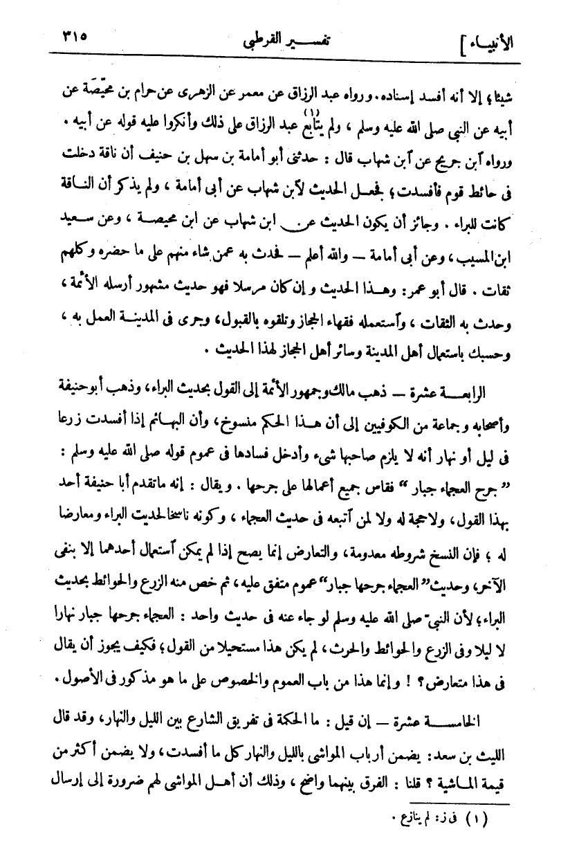 شَيْئًا، إِلَّا أَنَّهُ أَفْسَدَ إِسْنَادَهُ. وَرَوَاهُ عَبْدُ الرَّزَّاقِ عَنْ مَعْمَرٍ عَنِ الزُّهْرِيِّ عَنْ حَرَامِ بْنِ مُحَيِّصَةَ عَنْ أَبِيهِ عَنِ النَّبِيِّ صَلَّى اللَّهُ عَلَيْهِ وَسَلَّمَ، وَلَمْ يُتَابَعْ «١» عَبْدُ الرَّزَّاقِ عَلَى ذَلِكَ وَأَنْكَرُوا عَلَيْهِ قَوْلَهُ عَنْ أَبِيهِ. وَرَوَاهُ ابْنُ جُرَيْجٍ عَنِ ابْنِ شِهَابٍ قَالَ: حَدَّثَنِي أَبُو أُمَامَةَ بْنُ سَهْلِ بْنِ حُنَيْفٍ أَنَّ نَاقَةً دَخَلَتْ فِي حَائِطِ قَوْمٍ فَأَفْسَدَتْ، فَجَعَلَ الْحَدِيثَ لِابْنِ شِهَابٍ عَنْ أَبِي أُمَامَةَ، وَلَمْ يُذْكَرْ أَنَّ النَّاقَةَ كَانَتْ لِلْبَرَاءِ. وَجَائِزٌ أَنْ يَكُونَ الْحَدِيثُ عَنِ ابْنِ شِهَابٍ عَنِ ابن محيصة، وعن سعيد ابن الْمُسَيَّبِ، وَعَنْ أَبِي أُمَامَةَ- وَاللَّهُ أَعْلَمُ- فَحَدَّثَ بِهِ عَمَّنْ شَاءَ مِنْهُمْ عَلَى مَا حَضَرَهُ وَكُلُّهُمْ ثِقَاتٌ. قَالَ أَبُو عُمَرَ: وَهَذَا الْحَدِيثُ وَإِنْ كَانَ مُرْسَلًا فَهُوَ حَدِيثٌ مَشْهُورٌ أَرْسَلَهُ الْأَئِمَّةُ، وَحَدَّثَ بِهِ الثِّقَاتُ، وَاسْتَعْمَلَهُ فُقَهَاءُ الْحِجَازِ وَتَلَقَّوْهُ بِالْقَبُولِ، وَجَرَى فِي الْمَدِينَةِ الْعَمَلُ بِهِ، وَحَسْبُكَ بِاسْتِعْمَالِ أَهْلِ الْمَدِينَةِ وَسَائِرِ أَهْلِ الْحِجَازِ لهذا الحديث. الرابعة عشرة- ذَهَبَ مَالِكٌ وَجُمْهُورُ الْأَئِمَّةِ إِلَى الْقَوْلِ بِحَدِيثِ الْبَرَاءِ، وَذَهَبَ أَبُو حَنِيفَةَ وَأَصْحَابُهُ وَجَمَاعَةٌ مِنَ الْكُوفِيِّينَ إِلَى أَنَّ هَذَا الْحُكْمَ مَنْسُوخٌ، وَأَنَّ الْبَهَائِمَ إِذَا أَفْسَدَتْ زَرْعًا فِي لَيْلٍ أَوْ نهار أنه لا يلزم صاحبها شي وَأُدْخِلَ فَسَادُهَا فِي عُمُومِ قَوْلِهِ صَلَّى اللَّهُ عَلَيْهِ وَسَلَّمَ: (جُرْحُ الْعَجْمَاءِ جُبَارٌ) فَقَاسَ جَمِيعَ أَعْمَالِهَا عَلَى جُرْحِهَا. وَيُقَالُ: إِنَّهُ مَا تَقَدَّمَ أَبَا حَنِيفَةَ أَحَدٌ بِهَذَا الْقَوْلِ، وَلَا حُجَّةَ لَهُ وَلَا لِمَنِ اتَّبَعَهُ فِي حَدِيثِ الْعَجْمَاءِ، وَكَوْنِهِ نَاسِخًا لِحَدِيثِ الْبَرَاءِ وَمُعَارِضًا لَهُ، فَإِنَّ النسخ شروطه معدومة، والتعاوض إنما يصح إذا لم يمكن استعماله أَحَدِهِمَا إِلَّا بِنَفْيِ الْآخَرِ، وَحَدِيثُ (الْعَجْمَاءِ جُرْحُهَا جُبَارٌ) عُمُومٌ مُتَّفَقٌ عَلَيْهِ، ثُمَّ خُصَّ مِنْهُ الزَّرْعُ وَالْحَوَائِطُ بِحَدِيثِ الْبَرَاءِ، لِأَنَّ النَّبِيَّ صَلَّى اللَّهُ عَلَيْهِ وَسَلَّمَ لَوْ جَاءَ عَنْهُ فِي حَدِيثٍ وَاحِدٍ: الْعَجْمَاءُ جُرْحُهَا جُبَارٌ نَهَارًا لَا لَيْلًا وَفِي الزَّرْعِ وَالْحَوَائِطِ وَالْحَرْثِ، لَمْ يَكُنْ هَذَا مُسْتَحِيلًا مِنَ الْقَوْلِ، فَكَيْفَ يَجُوزُ أَنْ يُقَالَ فِي هَذَا مُتَعَارِضٌ؟! وَإِنَّمَا هَذَا مِنْ بَابِ الْعُمُومِ وَالْخُصُوصِ عَلَى مَا هُوَ مَذْكُورٌ في الأصول. الخامشة عشرة- إِنْ قِيلَ: مَا الْحِكْمَةُ فِي تَفْرِيقِ الشَّارِعِ بَيْنَ اللَّيْلِ وَالنَّهَارِ، وَقَدْ قَالَ اللَّيْثُ بْنُ سَعْدٍ: يُضَمَّنُ أَرْبَابُ الْمَوَاشِي بِاللَّيْلِ وَالنَّهَارِ كُلَّ مَا أَفْسَدَتْ، وَلَا يُضَمَّنُ أَكْثَرَ مِنْ قِيمَةِ الْمَاشِيَةِ؟ قُلْنَا: الْفَرْقُ بَيْنَهُمَا وَاضِحٌ وَذَلِكَ أَنَّ أهل المواشي لهم ضرورة إلى إرسال