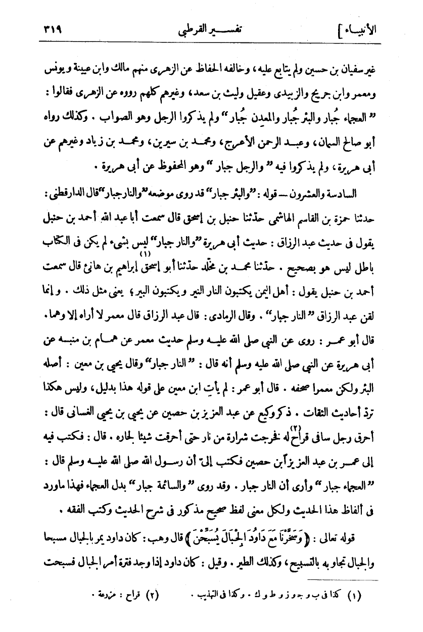 غَيْرُ سُفْيَانَ بْنِ حُسَيْنٍ وَلَمْ يُتَابَعْ عَلَيْهِ، وَخَالَفَهُ الْحُفَّاظُ عَنِ الزُّهْرِيِّ مِنْهُمْ مَالِكٌ وَابْنُ عُيَيْنَةَ وَيُونُسُ وَمَعْمَرٌ وَابْنُ جُرَيْجٍ وَالزُّبَيْدِيُّ وَعُقَيْلٌ وَلَيْثُ بْنُ سَعْدٍ، وَغَيْرُهُمْ كُلُّهُمْ رَوَوْهُ عَنِ الزُّهْرِيِّ فَقَالُوا: (الْعَجْمَاءُ جُبَارٌ وَالْبِئْرُ جُبَارٌ وَالْمَعْدِنُ جُبَارٌ) وَلَمْ يَذْكُرُوا الرِّجْلَ وَهُوَ الصَّوَابُ. وَكَذَلِكَ رواه أَبُو صَالِحٍ السَّمَّانُ، وَعَبْدُ الرَّحْمَنِ الْأَعْرَجُ، وَمُحَمَّدُ بْنُ سِيرِينَ، وَمُحَمَّدُ بْنُ زِيَادٍ وَغَيْرُهُمْ عَنْ أَبِي هُرَيْرَةَ، وَلَمْ يَذْكُرُوا فِيهِ (وَالرِّجْلُ جُبَارٌ) وَهُوَ الْمَحْفُوظُ عَنْ أَبِي هُرَيْرَةَ. السَّادِسَةُ وَالْعِشْرُونَ- قَوْلُهُ: (وَالْبِئْرُ جُبَارٌ) قَدْ رُوِيَ مَوْضِعُهُ (وَالنَّارُ جبار) قَالَ الدَّارَقُطْنِيُّ: حَدَّثَنَا حَمْزَةُ بْنُ الْقَاسِمِ الْهَاشِمِيُّ حَدَّثَنَا حَنْبَلُ بْنُ إِسْحَاقَ قَالَ سَمِعْتُ أَبَا عَبْدِ اللَّهِ أَحْمَدَ بْنَ حَنْبَلٍ يَقُولُ فِي حَدِيثِ عَبْدِ الرَّزَّاقِ: حَدِيثُ أَبِي هُرَيْرَةَ (وَالنَّارُ جُبَارٌ) لَيْسَ بِشَيْءٍ لَمْ يَكُنْ فِي الْكِتَابِ بَاطِلٌ لَيْسَ هُوَ بِصَحِيحٍ. حَدَّثَنَا مُحَمَّدُ بْنُ مخلد حدثنا أبو إسحاق «١» إِبْرَاهِيمَ بْنِ هَانِئٍ قَالَ سَمِعْتُ أَحْمَدَ بْنَ حَنْبَلٍ يَقُولُ: أَهْلُ الْيَمَنِ يَكْتُبُونَ النَّارَ النِّيرَ ويكتبون البئر، يَعْنِي مِثْلَ ذَلِكَ. وَإِنَّمَا لُقِّنَ عَبْدُ الرَّزَّاقِ (النَّارُ جُبَارٌ). وَقَالَ الرَّمَادِيُّ: قَالَ عَبْدُ الرَّزَّاقِ قَالَ مَعْمَرٌ لَا أَرَاهُ إِلَّا وَهْمًا. قَالَ أَبُو عُمَرَ: رُوِيَ عَنِ النَّبِيِّ صَلَّى اللَّهُ عَلَيْهِ وَسَلَّمَ حَدِيثُ مَعْمَرٌ عَنْ هَمَّامِ بْنِ مُنَبِّهٍ عَنْ أَبِي هُرَيْرَةَ عَنِ النَّبِيِّ صَلَّى اللَّهُ عَلَيْهِ وَسَلَّمَ أَنَّهُ قَالَ: (النَّارُ جُبَارٌ) وَقَالَ يَحْيَى بْنُ مَعِينٍ: أَصْلُهُ الْبِئْرُ وَلَكِنَّ مَعْمَرًا صَحَّفَهُ قَالَ أَبُو عُمَرَ: لَمْ يَأْتِ ابْنُ مَعِينٍ عَلَى قَوْلِهِ هَذَا بِدَلِيلٍ، وَلَيْسَ هَكَذَا تُرَدُّ أَحَادِيثُ الثِّقَاتِ. ذَكَرَ وَكِيعٌ عَنْ عَبْدِ الْعَزِيزِ بْنِ حُصَيْنٍ عَنْ يَحْيَى بْنِ يَحْيَى الْغَسَّانِيِّ قَالَ: أَحْرَقَ رَجُلٌ سَافِي قَرَاحٍ «٢» لَهُ فَخَرَجَتْ شَرَارَةٌ مِنْ نَارٍ حَتَّى أَحْرَقَتْ شَيْئًا لِجَارِهِ. قَالَ: فَكَتَبَ فِيهِ إِلَى عُمَرَ بن عبد العزيز ابْنُ حُصَيْنٍ فَكَتَبَ إِلَيَّ أَنَّ رَسُولَ اللَّهِ صَلَّى اللَّهُ عَلَيْهِ وَسَلَّمَ قَالَ: (الْعَجْمَاءُ جُبَارٌ) وَأَرَى أَنَّ النَّارَ جُبَارٌ. وَقَدْ رُوِيَ (وَالسَّائِمَةُ جُبَارٌ) بَدَلَ الْعَجْمَاءِ فَهَذَا مَا وَرَدَ فِي أَلْفَاظِ هَذَا الْحَدِيثِ وَلِكُلِّ مَعْنًى لَفْظٌ صَحِيحٌ مَذْكُورٌ فِي شَرْحِ الْحَدِيثِ وَكُتُبِ الْفِقْهِ. قَوْلُهُ تَعَالَى: (وَسَخَّرْنا مَعَ داوُدَ الْجِبالَ يُسَبِّحْنَ) قَالَ وَهْبٌ: كَانَ دَاوُدُ يَمُرُّ بِالْجِبَالِ مُسَبِّحًا وَالْجِبَالُ تُجَاوِبُهُ بِالتَّسْبِيحِ، وَكَذَلِكَ الطَّيْرُ. وَقِيلَ: كَانَ دَاوُدُ إذا وجد فترة أمر الجبال فسبحت