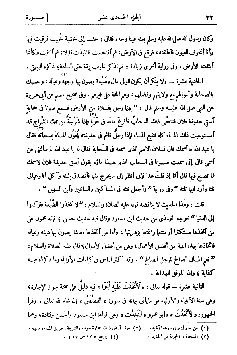 وَكَانَ رَسُولُ اللَّهِ صَلَّى اللَّهُ عَلَيْهِ وَسَلَّمَ بَعَثَهُ عَيْنًا وَحْدَهُ فَقَالَ: جِئْتُ إِلَى خَشَبَةِ خُبَيْبٍ فَرَقِيتُ فِيهَا وَأَنَا أَتَخَوَّفُ الْعُيُونَ فَأَطْلَقْتُهُ، فَوَقَعَ فِي الْأَرْضِ، ثُمَّ اقْتَحَمْتُ فَانْتَبَذْتُ قَلِيلًا، ثُمَّ الْتَفَتُّ فَكَأَنَّمَا ابْتَلَعَتْهُ الْأَرْضُ. وَفِي رِوَايَةٍ أُخْرَى زِيَادَةٌ: فَلَمْ نَذْكُرْ لِخُبَيْبٍ رِمَّةً حَتَّى السَّاعَةَ، ذَكَرَهُ الْبَيْهَقِيُّ. الْحَادِيَةَ عَشْرَةَ- وَلَا يُنْكَرُ أَنْ يَكُونَ لِلْوَلِيِّ مَالٌ وَضَيْعَةٌ يَصُونُ بِهَا وجهه «١» وَعِيَالَهُ، وَحَسْبُكَ بِالصَّحَابَةِ وَأَمْوَالَهُمْ مَعَ وِلَايَتِهِمْ وَفَضْلِهِمْ، وَهُمُ الْحُجَّةُ عَلَى غَيْرِهِمْ. وَفِي صَحِيحِ مُسْلِمٍ عَنْ أَبِي هُرَيْرَةَ عَنِ النَّبِيِّ صَلَّى اللَّهُ عَلَيْهِ وَسَلَّمَ قَالَ: (بَيْنَمَا رَجُلٌ بِفَلَاةٍ مِنَ الْأَرْضِ فَسَمِعَ صَوْتًا فِي سَحَابَةٍ اسْقِ حَدِيقَةَ فُلَانٍ فَتَنَحَّى ذَلِكَ السَّحَابُ فَأَفْرَغَ مَاءَهُ فِي حَرَّةٍ «٢» فَإِذَا شَرْجَةٌ مِنْ تِلْكَ الشِّرَاجِ قَدِ اسْتَوْعَبَتْ ذَلِكَ الْمَاءَ كُلَّهُ فَتَتَبَّعَ الْمَاءَ فَإِذَا رَجُلٌ قَائِمٌ فِي حَدِيقَتِهِ يُحَوِّلُ الْمَاءَ بِمَسَحَاتِهِ «٣» فَقَالَ يَا عَبْدَ اللَّهِ مَا اسْمُكَ قَالَ فُلَانٌ الِاسْمَ الَّذِي سَمِعَهُ فِي السَّحَابَةِ فَقَالَ لَهُ يَا عَبْدَ اللَّهِ لِمَ سَأَلْتَنِي عَنِ اسْمِي قَالَ إِنِّي سَمِعْتُ صَوْتًا فِي السَّحَابِ الَّذِي هَذَا مَاؤُهُ يَقُولُ اسْقِ حَدِيقَةَ فُلَانٍ لِاسْمِكَ فَمَا تَصْنَعُ فِيهَا قَالَ أَمَّا إِذْ قُلْتَ هَذَا فَإِنِّي أَنْظُرُ إِلَى مَا يَخْرُجُ مِنْهَا فَأَتَصَدَّقُ بِثُلُثِهِ وَآكُلُ أَنَا وَعِيَالِي ثُلُثًا وَأَرُدُّ فِيهَا ثُلُثَهُ) وَفِي رِوَايَةٍ (وَأَجْعَلُ ثُلُثَهُ فِي الْمَسَاكِينِ وَالسَّائِلِينَ وَابْنِ السَّبِيلِ). قُلْتُ: وَهَذَا الْحَدِيثُ لَا يُنَاقِضُهُ قَوْلُهُ عَلَيْهِ الصَّلَاةُ وَالسَّلَامُ: (لَا تَتَّخِذُوا الضَّيْعَةَ فَتَرْكَنُوا إِلَى الدُّنْيَا) خَرَّجَهُ التِّرْمِذِيُّ مِنْ حَدِيثِ ابْنِ مَسْعُودٍ وَقَالَ فِيهِ حَدِيثٌ حَسَنٌ، فَإِنَّهُ مَحْمُولٌ عَلَى مَنِ اتَّخَذَهَا مُسْتَكْثِرًا أَوْ مُتَنَعِّمًا وَمُتَمَتِّعًا بِزَهْرَتِهَا، وَأَمَّا مَنِ اتَّخَذَهَا مَعَاشًا يَصُونُ بِهَا دِينَهُ وَعِيَالَهُ فَاتِّخَاذُهَا بِهَذِهِ النِّيَّةِ مِنْ أَفْضَلِ الْأَعْمَالِ، وَهِيَ مِنْ أَفْضَلِ الْأَمْوَالِ، قَالَ عَلَيْهِ الصَّلَاةُ وَالسَّلَامُ: (نِعْمَ الْمَالُ الصَّالِحُ لِلرَّجُلِ الصَّالِحِ). وَقَدْ أَكْثَرَ النَّاسُ فِي كَرَامَاتِ الْأَوْلِيَاءِ وَمَا ذَكَرْنَاهُ فِيهِ كِفَايَةٌ، وَاللَّهُ الْمُوَفِّقُ لِلْهِدَايَةِ. الثَّانِيَةَ عَشْرَةَ- قَوْلُهُ تَعَالَى:" لَاتَّخَذْتَ عَلَيْهِ أَجْراً" فِيهِ دَلِيلٌ عَلَى صِحَّةِ جَوَازِ الْإِجَارَةِ، وَهِيَ سُنَّةُ الْأَنْبِيَاءِ وَالْأَوْلِيَاءِ عَلَى مَا يَأْتِي بَيَانُهُ فِي سُورَةِ" الْقَصَصِ" «٤» إِنْ شَاءَ اللَّهُ تَعَالَى. وَقَرَأَ الْجُمْهُورُ" لَاتَّخَذْتُ" وَأَبُو عَمْرٍو" لَتَّخِذْتُ" وَهِيَ قِرَاءَةُ ابْنِ مَسْعُودٍ وَالْحَسَنِ وقتادة، وهما