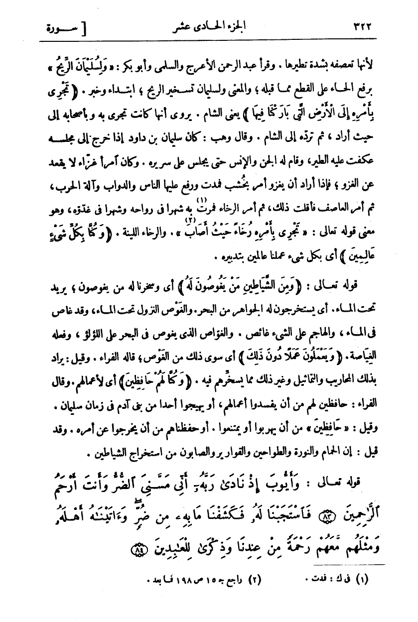 لِأَنَّهَا تَعْصِفهُ بِشِدَّةِ تَطَيُّرِهَا. وَقَرَأَ عَبْدُ الرَّحْمَنِ الْأَعْرَجُ وَالسُّلَمِيُّ وَأَبُو بَكْرٍ" وَلِسُلَيْمانَ الرِّيحَ" بِرَفْعِ الْحَاءِ عَلَى الْقَطْعِ مِمَّا قَبْلَهُ، وَالْمَعْنَى وَلِسُلَيْمَانَ تَسْخِيرُ الرِّيحِ، ابْتِدَاءٌ وَخَبَرٌ. (تَجْرِي بِأَمْرِهِ إِلى الْأَرْضِ الَّتِي بارَكْنا فِيها) يَعْنِي الشَّامَ. يُرْوَى أَنَّهَا كَانَتْ تَجْرِي بِهِ وَبِأَصْحَابِهِ إِلَى حَيْثُ أَرَادَ، ثُمَّ تَرُدُّهُ إِلَى الشَّامِ. وَقَالَ وَهْبٌ: كَانَ سُلَيْمَانُ بْنُ دَاوُدَ إِذَا خَرَجَ إِلَى مَجْلِسِهِ عَكَفَتْ عَلَيْهِ الطَّيْرُ، وَقَامَ لَهُ الْجِنُّ وَالْإِنْسُ حَتَّى يَجْلِسَ عَلَى سَرِيرِهِ. وَكَانَ امْرَأً غَزَّاءً لَا يَقْعُدُ عَنِ الْغَزْوِ، فَإِذَا أَرَادَ أَنْ يَغْزُوَ أَمَرَ بِخَشَبٍ فَمُدَّتْ وَرُفِعَ عَلَيْهَا الناس والدواب وآلة الحرب، ثم أمر الْعَاصِفَ فَأَقَلَّتْ ذَلِكَ، ثُمَّ أَمَرَ الرُّخَاءَ فَمَرَّتْ «١» بِهِ شَهْرًا فِي رَوَاحِهِ وَشَهْرًا فِي غُدُوِّهِ، وَهُوَ مَعْنَى قَوْلِهِ تَعَالَى:" تَجْرِي بِأَمْرِهِ رُخاءً حَيْثُ أَصابَ" «٢» [ص: ٣٦]. وَالرُّخَاءُ اللَّيِّنَةُ. (وَكُنَّا بِكُلِّ شَيْءٍ عالِمِينَ) أَيْ بكل شي عَمِلْنَا عَالِمِينَ بِتَدْبِيرِهِ. قَوْلُهُ تَعَالَى: (وَمِنَ الشَّياطِينِ مَنْ يَغُوصُونَ لَهُ) أَيْ وَسَخَّرْنَا لَهُ مَنْ يَغُوصُونَ، يُرِيدُ تَحْتَ الْمَاءِ. أَيْ يَسْتَخْرِجُونَ لَهُ الْجَوَاهِرَ مِنَ الْبَحْرِ. وَالْغَوْصُ النُّزُولُ تَحْتَ الْمَاءِ، وَقَدْ غَاصَ فِي الْمَاءِ، وَالْهَاجِمُ عَلَى الشَّيْءِ غَائِصٌ. وَالْغَوَّاصُ الَّذِي يَغُوصُ فِي الْبَحْرِ عَلَى اللُّؤْلُؤِ، وَفِعْلُهُ الْغِيَاصَةُ. (وَيَعْمَلُونَ عَمَلًا دُونَ ذلِكَ) أَيْ سِوَى ذَلِكَ مِنَ الْغَوْصِ، قَالَهُ الْفَرَّاءُ. وَقِيلَ: يُرَادُ بِذَلِكَ الْمَحَارِيبُ وَالتَّمَاثِيلُ وَغَيْرُ ذَلِكَ مما يُسَخِّرُهُمْ فِيهِ. (وَكُنَّا لَهُمْ حافِظِينَ) أَيْ لِأَعْمَالِهِمْ. وَقَالَ الْفَرَّاءُ: حَافِظِينَ لَهُمْ مِنْ أَنْ يُفْسِدُوا أَعْمَالَهُمْ، أَوْ يُهَيِّجُوا أَحَدًا مِنْ بَنِي آدَمَ فِي زَمَانِ سُلَيْمَانَ. وَقِيلَ:" حَافِظِينَ" مِنْ أَنْ يَهْرُبُوا أَوْ يَمْتَنِعُوا. أَوْ حَفِظْنَاهُمْ مِنْ أَنْ يَخْرُجُوا عَنْ أَمْرِهِ. وَقَدْ قِيلَ: إِنَّ الْحَمَامَ وَالنَّوْرَةَ وَالطَّوَاحِينَ وَالْقَوَارِيرَ وَالصَّابُونَ مِنَ اسْتِخْرَاجِ الشَّيَاطِينِ.