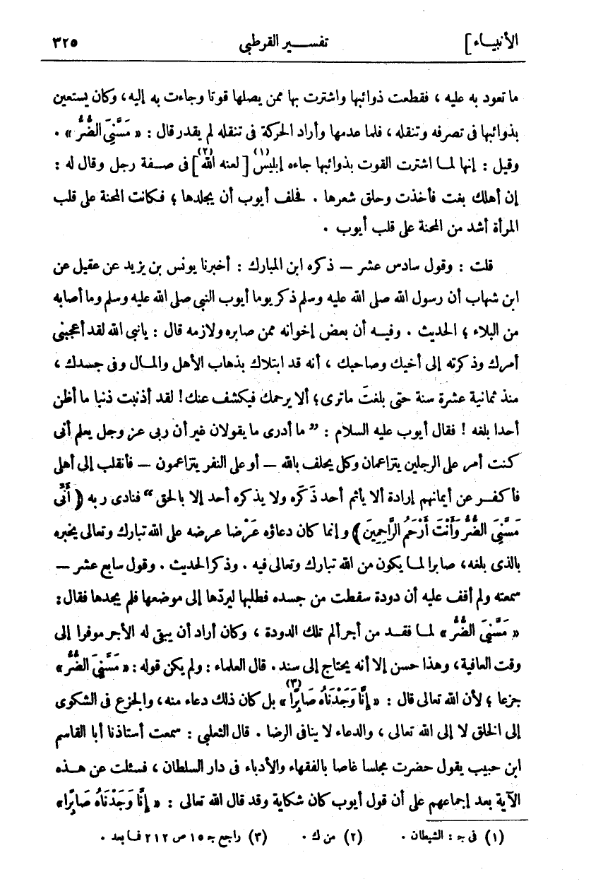 مَا تَعُودُ بِهِ عَلَيْهِ، فَقَطَعَتْ ذَوَائِبَهَا وَاشْتَرَتْ بِهَا مِمَّنْ يَصِلُهَا قُوتًا وَجَاءَتْ بِهِ إِلَيْهِ، وَكَانَ يَسْتَعِينُ بِذَوَائِبِهَا فِي تَصَرُّفِهِ وَتَنَقُّلِهِ، فَلَمَّا عَدِمَهَا وَأَرَادَ الْحَرَكَةَ فِي تَنَقُّلِهِ لَمْ يَقْدِرْ قَالَ:" مَسَّنِيَ الضُّرُّ". وَقِيلَ: إِنَّهَا لَمَّا اشْتَرَتِ القوت بذوائبها جاءه إبليس «١» [لعنه الله «٢»] فِي صِفَةِ رَجُلٍ وَقَالَ لَهُ: إِنَّ أَهْلَكَ بَغَتْ فَأُخِذَتْ وَحُلِقَ شَعْرُهَا. فَحَلَفَ أَيُّوبُ أَنْ يَجْلِدَهَا، فَكَانَتِ الْمِحْنَةُ عَلَى قَلْبِ الْمَرْأَةِ أَشَدَّ مِنَ الْمِحْنَةِ عَلَى قَلْبِ أَيُّوبَ. قُلْتُ: وَقَوْلٌ سَادِسَ عَشَرَ- ذَكَرَهُ ابْنُ الْمُبَارَكِ: أَخْبَرَنَا يُونُسُ بْنُ يَزِيدَ عَنْ عُقَيْلٍ عَنِ ابْنِ شِهَابٍ أَنَّ رَسُولَ اللَّهِ صَلَّى اللَّهُ عَلَيْهِ وَسَلَّمَ ذَكَرَ يَوْمًا أَيُّوبَ النَّبِيَّ صَلَّى اللَّهُ عَلَيْهِ وَسَلَّمَ وَمَا أَصَابَهُ مِنَ الْبَلَاءِ، الْحَدِيثَ. وَفِيهِ أَنَّ بَعْضَ إِخْوَانِهِ مِمَّنْ صَابَرَهُ وَلَازَمَهُ قَالَ: يَا نَبِيَّ اللَّهِ لَقَدْ أَعْجَبَنِي أَمْرُكَ وَذَكَرْتُهُ إِلَى أَخِيكَ وَصَاحِبِكَ، أَنَّهُ قَدِ ابْتَلَاكَ بِذَهَابِ الأهل والمال وفي جسدك منذ ثمانية عَشْرَةَ سَنَةً حَتَّى بَلَغْتَ مَا تَرَى أَلَا يَرْحَمُكَ فَيَكْشِفُ عَنْكَ! لَقَدْ أَذْنَبْتَ ذَنْبًا مَا أَظُنُّ أَحَدًا بَلَغَهُ! فَقَالَ أَيُّوبُ عَلَيْهِ السَّلَامُ:" مَا أَدْرِي مَا يَقُولَانِ غَيْرَ أَنَّ رَبِّي عَزَّ وَجَلَّ يَعْلَمُ أَنِّي كُنْتُ أَمُرُّ عَلَى الرَّجُلَيْنِ يَتَزَاعَمَانِ وَكُلٌّ يَحْلِفُ بِاللَّهِ- أَوْ عَلَى النَّفَرِ يَتَزَاعَمُونَ- فَأَنْقَلِبُ إِلَى أَهْلِي فَأُكَفِّرُ عَنْ أَيْمَانِهِمْ إِرَادَةً أَلَّا يَأْثَمَ أَحَدٌ ذَكَرَهُ وَلَا يَذْكُرُهُ أَحَدٌ إِلَّا بِالْحَقِّ" فَنَادَى رَبَّهُ" أَنِّي مَسَّنِيَ الضُّرُّ وَأَنْتَ أَرْحَمُ الرَّاحِمِينَ" إِنَّمَا كَانَ دُعَاؤُهُ عَرْضًا عَرَضَهُ عَلَى اللَّهِ تَبَارَكَ وَتَعَالَى يُخْبِرُهُ بِالَّذِي بَلَغَهُ، صَابِرًا لِمَا يَكُونُ مِنَ اللَّهِ تَبَارَكَ وَتَعَالَى فِيهِ. وَذَكَرَ الْحَدِيثَ. وَقَوْلٌ سَابِعَ عَشَرَ- سَمِعْتُهُ وَلَمْ أَقِفْ عَلَيْهِ أَنَّ دُودَةً سَقَطَتْ مِنْ جَسَدِهِ فَطَلَبَهَا لِيَرُدَّهَا إِلَى مَوْضِعِهَا فَلَمْ يَجِدْهَا فَقَالَ:" مَسَّنِيَ الضُّرُّ" لِمَا فَقَدَ مِنْ أَجْرِ أَلَمِ تِلْكَ الدُّودَةِ، وَكَانَ أَرَادَ أَنْ يَبْقَى لَهُ الْأَجْرُ مُوَفَّرًا إِلَى وَقْتِ الْعَافِيَةِ، وَهَذَا حَسَنٌ إِلَّا أَنَّهُ يَحْتَاجُ إِلَى سَنَدٍ. قَالَ الْعُلَمَاءُ: وَلَمْ يَكُنْ قَوْلُهُ" مَسَّنِيَ الضُّرُّ" جَزَعًا، لِأَنَّ اللَّهَ تَعَالَى قَالَ:" إِنَّا وَجَدْناهُ صابِراً" «٣» [ص: ٤٤] بَلْ كَانَ ذَلِكَ دُعَاءً مِنْهُ، وَالْجَزَعُ فِي الشَّكْوَى إِلَى الْخَلْقِ لَا إِلَى اللَّهِ تَعَالَى، وَالدُّعَاءُ لَا يُنَافِي الرِّضَا. قَالَ الثَّعْلَبِيُّ: سَمِعْتُ أستاذنا أبا القاسم ابن حَبِيبٍ يَقُولُ حَضَرْتُ مَجْلِسًا غَاصًّا بِالْفُقَهَاءِ وَالْأُدَبَاءِ فِي دَارِ السُّلْطَانِ، فَسَأَلْتُ عَنْ هَذِهِ الْآيَةِ بَعْدَ إِجْمَاعِهِمْ عَلَى أَنَّ قَوْلَ أَيُّوبَ كَانَ شِكَايَةً قَدْ قَالَ اللَّهُ تَعَالَى:" إِنَّا وَجَدْناهُ صابِراً" [ص: ٤٤]
