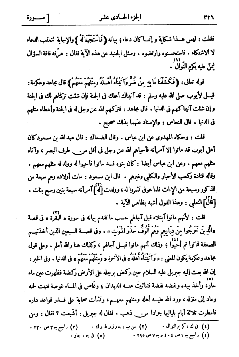 فَقُلْتُ: لَيْسَ هَذَا شِكَايَةً وَإِنَّمَا كَانَ دُعَاءً، بَيَانُهُ (فَاسْتَجَبْنا لَهُ) وَالْإِجَابَةُ تَتَعَقَّبُ الدُّعَاءَ لَا الاشتكاء. فاستحسنوه وارتضوه. وسيل الْجُنَيْدُ عَنْ هَذِهِ الْآيَةِ فَقَالَ: عَرَّفَهُ فَاقَةَ السُّؤَالِ لِيَمُنَّ عَلَيْهِ بِكَرَمِ النَّوَالِ «١». قَوْلُهُ تَعَالَى: (فَكَشَفْنا مَا بِهِ مِنْ ضُرٍّ وَآتَيْناهُ أَهْلَهُ وَمِثْلَهُمْ مَعَهُمْ) قَالَ مُجَاهِدٌ وَعِكْرِمَةُ: قِيلَ لِأَيُّوبَ صَلَّى اللَّهُ عَلَيْهِ وَسَلَّمَ: قَدْ آتَيْنَاكَ أَهْلَكَ فِي الْجَنَّةِ فَإِنْ شِئْتَ تَرَكْنَاهُمْ لَكَ فِي الْجَنَّةِ وَإِنْ شِئْتَ آتَيْنَاكَهُمْ فِي الدُّنْيَا. قَالَ مُجَاهِدٌ: فَتَرَكَهُمُ اللَّهُ عَزَّ وَجَلَّ لَهُ فِي الْجَنَّةِ وَأَعْطَاهُ مِثْلَهُمْ فِي الدُّنْيَا. قَالَ النَّحَّاسُ: وَالْإِسْنَادُ عَنْهُمَا بِذَلِكَ صَحِيحٌ. قُلْتُ: وَحَكَاهُ الْمَهْدَوِيُّ عَنِ ابْنِ عَبَّاسٍ. وَقَالَ الضَّحَّاكُ: قَالَ عَبْدُ اللَّهِ بْنُ مَسْعُودٍ كَانَ أَهْلُ أَيُّوبَ قَدْ مَاتُوا إِلَّا امْرَأَتَهُ فَأَحْيَاهُمُ اللَّهُ عَزَّ وَجَلَّ فِي أَقَلَّ مِنْ طَرْفِ الْبَصَرِ، وَآتَاهُ مِثْلَهُمْ مَعَهُمْ. وَعَنِ ابْنِ عَبَّاسٍ أَيْضًا: كَانَ بَنُوهُ قَدْ مَاتُوا فَأُحْيُوا لَهُ وَوُلِدَ لَهُ مِثْلُهُمْ معهم. وقاله قَتَادَةُ وَكَعْبُ الْأَحْبَارِ وَالْكَلْبِيُّ وَغَيْرُهُمْ. قَالَ ابْنُ مَسْعُودٍ: مَاتَ أَوْلَادُهُ وَهُمْ سَبْعَةٌ مِنَ الذُّكُورِ وَسَبْعَةٌ مِنَ الْإِنَاثِ فَلَمَّا عُوفِيَ نُشِرُوا لَهُ، وولدت [له «٢»] امرأته سبعة بنين وسبع بنات. [قَالَ «٣»] الثَّعْلَبِيُّ: وَهَذَا الْقَوْلُ أَشْبَهُ بِظَاهِرِ الْآيَةِ. قُلْتُ: لِأَنَّهُمْ مَاتُوا ابْتِلَاءً قَبْلَ آجَالِهِمْ حَسَبَ مَا تَقَدَّمَ بَيَانُهُ فِي سُورَةِ" الْبَقَرَةِ" «٤» فِي قِصَّةِ" الَّذِينَ خَرَجُوا مِنْ دِيارِهِمْ وَهُمْ أُلُوفٌ حَذَرَ الْمَوْتِ" [البقرة: ٢٤٣]. وَفِي قِصَّةِ السَّبْعِينَ الَّذِينَ أَخَذَتْهُمُ الصَّعْقَةُ فَمَاتُوا ثُمَّ أُحْيُوا «٥»، وَذَلِكَ أَنَّهُمْ مَاتُوا قَبْلَ آجَالِهِمْ، وَكَذَلِكَ هُنَا وَاللَّهُ أَعْلَمُ. وَعَلَى قَوْلِ مُجَاهِدٍ وَعِكْرِمَةَ يَكُونُ الْمَعْنَى:" وَآتَيْناهُ أَهْلَهُ" فِي الْآخِرَةِ" وَمِثْلَهُمْ مَعَهُمْ" فِي الدُّنْيَا. وَفِي الْخَبَرِ: إِنَّ اللَّهَ بَعَثَ إِلَيْهِ جِبْرِيلَ عَلَيْهِ السَّلَامُ حِينَ رَكَضَ بِرِجْلِهِ عَلَى الْأَرْضِ رَكْضَةً فَظَهَرَتْ عَيْنُ مَاءٍ حَارٍّ «٦»، وَأَخَذَ بِيَدِهِ وَنَفَضَهُ نَفْضَةً فَتَنَاثَرَتْ عَنْهُ الدِّيدَانُ، وَغَاصَ فِي الْمَاءِ غَوْصَةً فَنَبَتَ لَحْمُهُ وَعَادَ إِلَى مَنْزِلِهِ، وَرَدَّ اللَّهُ عَلَيْهِ أَهْلَهُ وَمِثْلَهُمْ مَعَهُمْ، وَنَشَأَتْ سَحَابَةٌ عَلَى قَدْرِ قَوَاعِدِ دَارِهِ فَأَمْطَرَتْ ثَلَاثَةَ أَيَّامٍ بِلَيَالِيهَا جَرَادًا مِنْ ذَهَبٍ. فَقَالَ لَهُ جِبْرِيلُ: أَشَبِعْتَ؟ فَقَالَ: ومن