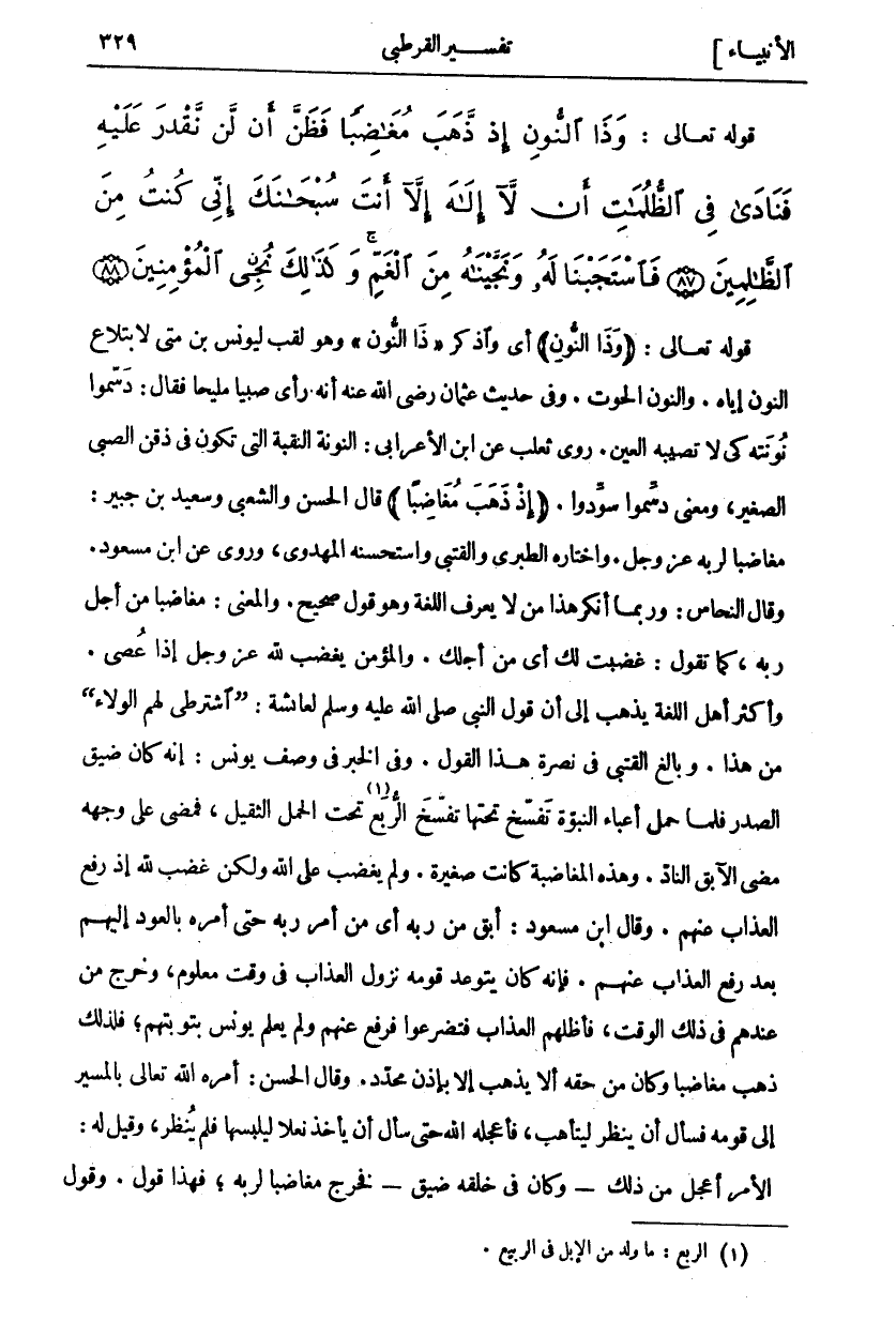 قوله تعالى: (وَذَا النُّونِ) أَيْ وَاذْكُرْ" ذَا النُّونِ" وَهُوَ لَقَبٌ لِيُونُسَ بْنِ مَتَّى لِابْتِلَاعِ النُّونِ إِيَّاهُ. وَالنُّونُ الْحُوتُ. وَفِي حَدِيثِ عُثْمَانَ رَضِيَ اللَّهُ عَنْهُ أَنَّهُ رَأَى صَبِيًّا مَلِيحًا فَقَالَ: دَسِّمُوا نُونَتَهُ كَيْ لَا تُصِيبَهُ الْعَيْنُ. رَوَى ثَعْلَبٌ عَنِ ابْنِ الْأَعْرَابِيِّ: النُّونَةُ النُّقْبَةُ الَّتِي تَكُونُ فِي ذَقَنِ الصَّبِيِّ الصَّغِيرِ، وَمَعْنَى دَسِّمُوا سَوِّدُوا. (إِذْ ذَهَبَ مُغاضِباً) قَالَ الْحَسَنُ وَالشَّعْبِيُّ وَسَعِيدُ بْنُ جُبَيْرٍ: مُغَاضِبًا لِرَبِّهِ عَزَّ وَجَلَّ. وَاخْتَارَهُ الطَّبَرِيُّ وَالْقُتَبِيُّ وَاسْتَحْسَنَهُ الْمَهْدَوِيُّ، وَرُوِيَ عَنِ ابْنِ مَسْعُودٍ. وقال النحاس: وربما أنكره هَذَا مَنْ لَا يَعْرِفُ اللُّغَةَ وَهُوَ قَوْلٌ صَحِيحٌ. وَالْمَعْنَى: مُغَاضِبًا مِنْ أَجْلِ رَبِّهِ، كَمَا تَقُولُ: غَضِبْتُ لَكَ أَيْ مِنْ أَجْلِكَ. وَالْمُؤْمِنُ يَغْضَبُ لِلَّهِ عَزَّ وَجَلَّ إِذَا عُصِيَ. وَأَكْثَرُ أَهْلِ اللُّغَةِ يَذْهَبُ إِلَى أَنَّ قَوْلَ النَّبِيِّ صَلَّى اللَّهُ عَلَيْهِ وَسَلَّمَ لِعَائِشَةَ: (اشْتَرِطِي لَهُمُ الْوَلَاءَ) مِنْ هَذَا. وَبَالَغَ الْقُتَبِيُّ فِي نُصْرَةِ هَذَا الْقَوْلِ. وَفِي الْخَبَرِ فِي وَصْفِ يُونُسَ: إِنَّهُ كَانَ ضَيِّقَ الصَّدْرِ فَلَمَّا حَمَلَ أَعْبَاءَ النُّبُوَّةِ تَفَسَّخَ تَحْتَهَا تَفَسُّخَ الرُّبَعِ «١» تَحْتَ الْحِمْلِ الثَّقِيلِ، فَمَضَى عَلَى وَجْهِهِ مُضِيَّ الْآبِقِ النَّادِّ. وَهَذِهِ الْمُغَاضَبَةُ كَانَتْ صَغِيرَةً. وَلَمْ يَغْضَبْ عَلَى اللَّهِ وَلَكِنْ غَضِبَ لِلَّهِ إِذْ رَفَعَ الْعَذَابَ عَنْهُمْ. وَقَالَ ابْنُ مَسْعُودٍ: أَبَقَ مِنْ رَبِّهِ أي من أمر ربه حتى أمره بالعودة إِلَيْهِمْ بَعْدَ رَفْعِ الْعَذَابِ عَنْهُمْ. فَإِنَّهُ كَانَ يتوعد قومه نزول الْعَذَابِ فِي وَقْتٍ مَعْلُومٍ، وَخَرَجَ مِنْ عِنْدِهِمْ فِي ذَلِكَ الْوَقْتِ، فَأَظَلَّهُمُ الْعَذَابُ فَتَضَرَّعُوا فَرُفِعَ عَنْهُمْ وَلَمْ يَعْلَمْ يُونُسُ بِتَوْبَتِهِمْ، فَلِذَلِكَ ذَهَبَ مُغَاضِبًا وَكَانَ مِنْ حَقِّهِ أَلَّا يَذْهَبَ إِلَّا بِإِذْنٍ مُحَدَّدٍ. وَقَالَ الْحَسَنُ: أَمَرَهُ اللَّهُ تَعَالَى بِالْمَسِيرِ إِلَى قَوْمِهِ فَسَأَلَ أَنْ يُنْظَرَ لِيَتَأَهَّبَ، فَأَعْجَلَهُ اللَّهُ حَتَّى سَأَلَ أَنْ يَأْخُذَ نَعْلًا لِيَلْبَسَهَا فَلَمْ يُنْظَرْ، وَقِيلَ لَهُ: الْأَمْرُ أَعْجَلُ مِنْ ذَلِكَ- وَكَانَ فِي خُلُقِهِ ضِيقٌ- فَخَرَجَ مغاضبا لربه، فهذا قول. وقول