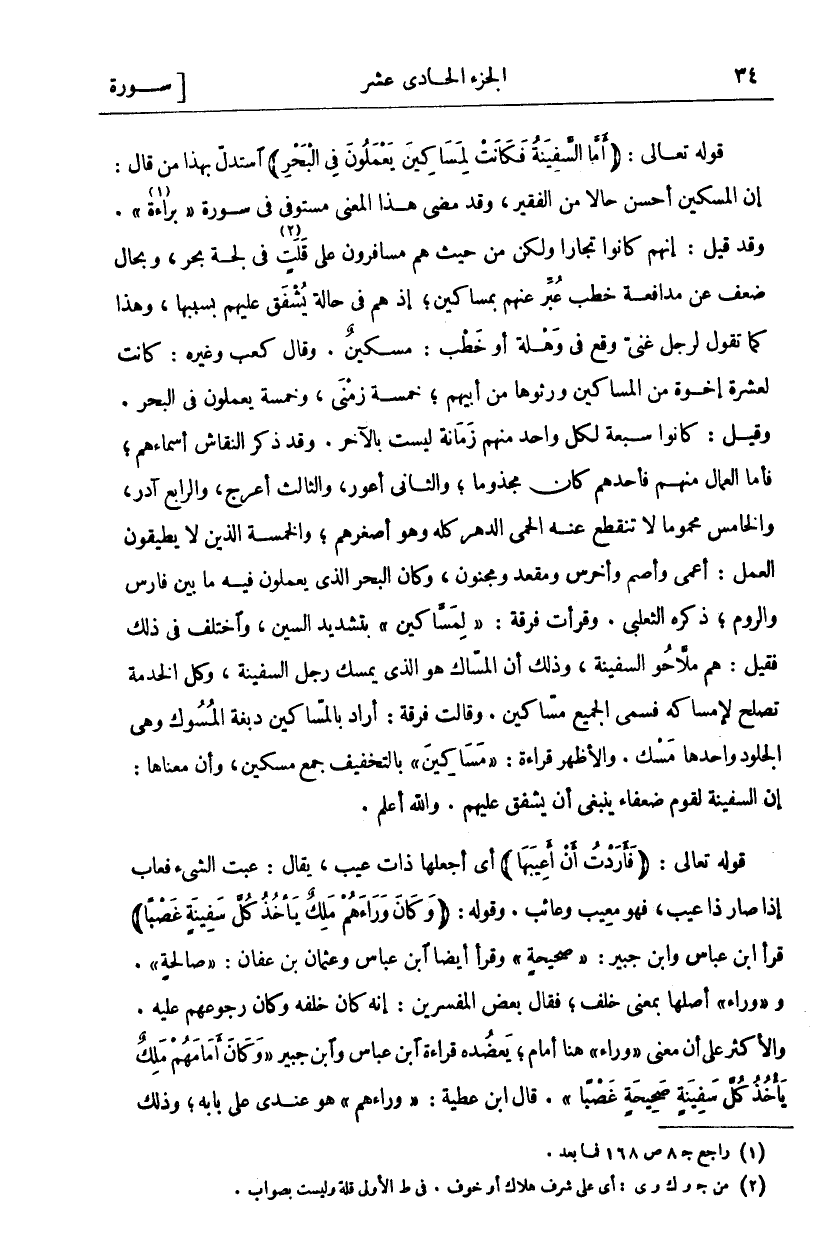 قَوْلُهُ تَعَالَى: (أَمَّا السَّفِينَةُ فَكانَتْ لِمَساكِينَ يَعْمَلُونَ فِي الْبَحْرِ) اسْتَدَلَّ بِهَذَا مَنْ قَالَ: إِنَّ الْمِسْكِينَ أَحْسَنُ حَالًا مِنَ الْفَقِيرِ، وَقَدْ مَضَى هذا المعنى مستوفي في سورة" براءة" «١». وقد وقيل: إِنَّهُمْ كَانُوا تُجَّارًا وَلَكِنْ مِنْ حَيْثُ هُمْ مسافرون على قلت «٢» فِي لُجَّةِ بَحْرٍ، وَبِحَالِ ضَعْفٍ عَنْ مُدَافَعَةِ خَطْبٍ عَبَّرَ عَنْهُمْ بِمَسَاكِينَ، إِذْ هُمْ فِي حَالَةٍ يُشْفَقُ عَلَيْهِمْ بِسَبَبِهَا، وَهَذَا كَمَا تَقُولُ لِرَجُلٍ غَنِيٍّ وَقَعَ فِي وَهْلَةٍ أَوْ خَطْبٍ: مِسْكِينٌ. وَقَالَ كَعْبٌ وَغَيْرُهُ: كَانَتْ لِعَشَرَةِ إِخْوَةٍ مِنَ الْمَسَاكِينِ وَرِثُوهَا مِنْ أَبِيهِمْ خَمْسَةٌ زَمْنَى، وَخَمْسَةٌ يَعْمَلُونَ فِي الْبَحْرِ. وَقِيلَ: كَانُوا سَبْعَةً لِكُلِ وَاحِدٍ مِنْهُمْ زَمَانَةٌ لَيْسَتْ بِالْآخَرِ. وَقَدْ ذَكَرَ النَّقَّاشُ أَسْمَاءَهُمْ، فَأَمَّا الْعُمَّالُ مِنْهُمْ فَأَحَدُهُمْ كَانَ مَجْذُومًا، وَالثَّانِي أَعْوَرَ، وَالثَّالِثُ أَعْرَجَ، وَالرَّابِعُ آدَرَ، وَالْخَامِسُ مَحْمُومًا لَا تَنْقَطِعُ عَنْهُ الْحُمَّى الدَّهْرَ كُلَّهُ وَهُوَ أَصْغَرُهُمْ، وَالْخَمْسَةُ الَّذِينَ لَا يُطِيقُونَ الْعَمَلَ: أَعْمَى وَأَصَمُّ وَأَخْرَسُ وَمُقْعَدٌ وَمَجْنُونٌ، وَكَانَ الْبَحْرُ الَّذِي يَعْمَلُونَ فِيهِ مَا بَيْنَ فَارِسَ وَالرُّومِ، ذَكَرَهُ الثَّعْلَبِيُّ. وَقَرَأَتْ فِرْقَةٌ:" لِمَسَّاكِينَ" بِتَشْدِيدِ السِّينِ، وَاخْتُلِفَ فِي ذَلِكَ فَقِيلَ: هُمْ مَلَّاحُو السَّفِينَةِ، وَذَلِكَ أَنَّ الْمَسَّاكَ هُوَ الَّذِي يَمْسِكُ رِجْلَ السَّفِينَةِ، وَكُلُّ الْخَدَمَةِ تَصْلُحُ لِإِمْسَاكِهِ فَسُمِّيَ الْجَمِيعُ مَسَّاكِينَ. وَقَالَتْ فِرْقَةٌ: أَرَادَ بِالْمَسَّاكِينِ دَبَغَةَ الْمُسُوكِ وَهِيَ الْجُلُودُ وَاحِدُهَا مَسْكٌ. وَالْأَظْهَرُ قِرَاءَةُ:" مَسَاكِينَ" بِالتَّخْفِيفِ جَمْعُ مِسْكِينٍ، وَأَنَّ مَعْنَاهَا: إِنَّ السَّفِينَةَ لِقَوْمٍ ضُعَفَاءَ يَنْبَغِي أَنْ يُشْفَقَ عَلَيْهِمْ. وَاللَّهُ أَعْلَمُ. قَوْلُهُ تَعَالَى: (فَأَرَدْتُ أَنْ أَعِيبَها) أَيْ أَجْعَلَهَا ذَاتَ عَيْبٍ، يُقَالُ: عِبْتُ الشَّيْءَ فَعَابَ إِذَا صَارَ ذَا عَيْبٍ، فَهُوَ مَعِيبٌ وَعَائِبٌ. وَقَوْلُهُ: (وَكَانَ وَرَاءَهُمْ مَلِكٌ يَأْخُذُ كُلَّ سَفِينَةٍ غَصْبًا) قَرَأَ ابْنُ عَبَّاسٍ وَابْنُ جُبَيْرٍ: (صَحِيحَةٍ) وَقَرَأَ أَيْضًا ابْنُ عَبَّاسٍ وَعُثْمَانُ بْنُ عَفَّانَ (صَالِحَةٍ). وَ (وَرَاءَ) أَصْلُهَا بِمَعْنَى خَلْفَ، فَقَالَ بَعْضُ الْمُفَسِّرِينَ: إِنَّهُ كَانَ خَلْفَهُ وَكَانَ رُجُوعُهُمْ عَلَيْهِ. وَالْأَكْثَرُ عَلَى أَنَّ مَعْنَى (وَرَاءَ) هُنَا أَمَامَ، يُعَضِّدُهُ قِرَاءَةُ ابْنِ عَبَّاسٍ وَابْنِ جُبَيْرٍ" وَكَانَ أَمَامَهُمْ مَلِكٌ يَأْخُذُ كُلَّ سَفِينَةٍ صَحِيحَةٍ غَصْبًا". قَالَ ابْنُ عَطِيَّةَ:" وَرَاءَهُمْ" هو عندي على بابه، وذلك