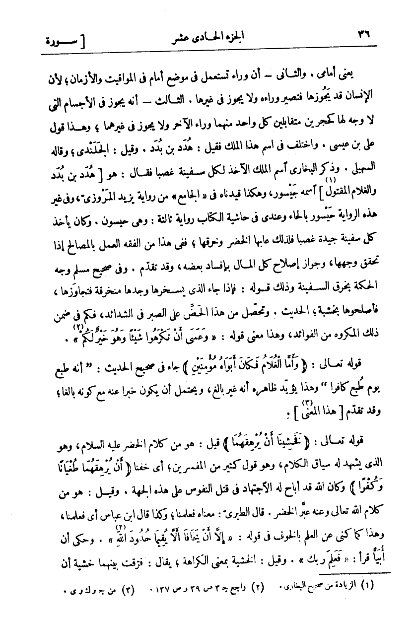 يَعْنِي أَمَامِي. وَالثَّانِي- أَنَّ وَرَاءَ تُسْتَعْمَلُ فِي مَوْضِعِ أَمَامَ فِي الْمَوَاقِيتِ وَالْأَزْمَانِ لِأَنَّ الْإِنْسَانَ قد يَجُوزُهَا فَتَصِيرُ وَرَاءَهُ وَلَا يَجُوزُ فِي غَيْرِهَا. الثَّالِثُ- أَنَّهُ يَجُوزُ فِي الْأَجْسَامِ الَّتِي لَا وَجْهَ لَهَا كَحَجَرَيْنِ مُتَقَابِلَيْنِ كُلُّ وَاحِدٍ مِنْهُمَا وَرَاءَ الْآخَرِ وَلَا يَجُوزُ فِي غَيْرِهِمَا، وَهَذَا قَوْلُ عَلِيِّ بْنِ عِيسَى. وَاخْتُلِفَ فِي اسْمِ هَذَا الْمَلِكِ فَقِيلَ: هُدَدُ بْنُ بُدَدَ. وَقِيلَ: الْجَلَنْدِيُّ، وَقَالَهُ السُّهَيْلِيُّ. وَذَكَرَ الْبُخَارِيُّ اسْمَ الْمَلِكِ الْآخِذِ لِكُلِّ سَفِينَةٍ غَصْبًا فَقَالَ: هُوَ [هُدَدُ بن بدد والغلام المقتول «١»] اسمه جيسور، وَهَكَذَا قَيَّدْنَاهُ فِي (الْجَامِعِ) مِنْ رِوَايَةِ يَزِيدَ الْمَرْوَزِيِّ، وَفِي غَيْرِ هَذِهِ الرِّوَايَةِ حَيْسُورُ بِالْحَاءِ وَعِنْدِي فِي حَاشِيَةِ الْكِتَابِ رِوَايَةٌ ثَالِثَةٌ: وَهِيَ حَيْسُونُ. وَكَانَ يَأْخُذُ كُلَّ سَفِينَةٍ جَيِّدَةٍ غَصْبًا فَلِذَلِكَ عَابَهَا الْخَضِرُ وَخَرَقَهَا، فَفِي هَذَا مِنَ الْفِقْهِ الْعَمَلُ بِالْمَصَالِحِ إِذَا تَحَقَّقَ وَجْهُهَا، وَجَوَازُ إِصْلَاحِ كُلِّ الْمَالِ بِإِفْسَادِ بَعْضِهِ، وَقَدْ تَقَدَّمَ. وَفِي صَحِيحِ مُسْلِمٍ وَجْهُ الْحِكْمَةِ بِخَرْقِ السَّفِينَةِ وَذَلِكَ قَوْلُهُ: فَإِذَا جَاءَ الَّذِي يُسَخِّرُهَا وَجَدَهَا مُنْخَرِقَةً فَتَجَاوَزَهَا، فَأَصْلَحُوهَا بِخَشَبَةٍ، الْحَدِيثَ. وَتَحَصَّلَ مِنْ هَذَا الْحَضُّ عَلَى الصَّبْرِ فِي الشَّدَائِدِ، فَكَمْ فِي ضِمْنِ ذَلِكَ الْمَكْرُوهِ مِنَ الْفَوَائِدِ، وَهَذَا مَعْنَى قَوْلِهِ:" وَعَسَى أَنْ تَكْرَهُوا شَيْئًا وَهُوَ خَيْرٌ لَكُمْ" «٢» [البقرة: ٢١٦]. قَوْلُهُ تَعَالَى: (وَأَمَّا الْغُلامُ فَكانَ أَبَواهُ مُؤْمِنَيْنِ) ٨٠ جَاءَ فِي صَحِيحِ الْحَدِيثِ: (أَنَّهُ طُبِعَ يَوْمَ طُبِعَ كَافِرًا) وَهَذَا يُؤَيِّدُ ظَاهِرُهُ أَنَّهُ غَيْرُ بَالِغٍ، وَيَحْتَمِلُ أَنْ يَكُونَ خَبَرًا عَنْهُ مَعَ كونه بالغا، وقد تقدم. [هذا المعنى [«٣». قَوْلُهُ تَعَالَى: (فَخَشِينا أَنْ يُرْهِقَهُما) ٨٠ قِيلَ: هُوَ مِنْ كَلَامِ الْخَضِرِ عَلَيْهِ السَّلَامُ، وَهُوَ الَّذِي يَشْهَدُ لَهُ سِيَاقُ الْكَلَامِ، وَهُوَ قَوْلُ كَثِيرٍ مِنَ الْمُفَسِّرِينَ، أَيْ خِفْنَا (أَنْ يُرْهِقَهُما طُغْياناً وَكُفْراً) ٨٠، وَكَانَ اللَّهُ قَدْ أَبَاحَ لَهُ الِاجْتِهَادَ فِي قَتْلِ النُّفُوسِ عَلَى هَذِهِ الْجِهَةِ. وَقِيلَ: هُوَ مِنْ كَلَامِ اللَّهِ تَعَالَى وَعَنْهُ عَبَّرَ الْخَضِرُ. قَالَ الطَّبَرِيُّ: مَعْنَاهُ فَعَلِمْنَا، وَكَذَا قَالَ ابْنُ عَبَّاسٍ أَيْ فَعَلِمْنَا، وَهَذَا كَمَا كَنَّى عَنِ الْعِلْمِ بِالْخَوْفِ فِي قَوْلِهِ" إِلَّا أَنْ يَخافا أَلَّا يُقِيما حُدُودَ اللَّهِ" «٤» [البقرة: ٢٢٩]. وَحُكِيَ أَنَّ أُبَيًّا قَرَأَ:" فَعَلِمَ رَبُّكَ" وَقِيلَ: الْخَشْيَةُ بِمَعْنَى الْكَرَاهَةِ، يُقَالُ: فَرَّقْتُ بَيْنَهُمَا خَشْيَةَ أن