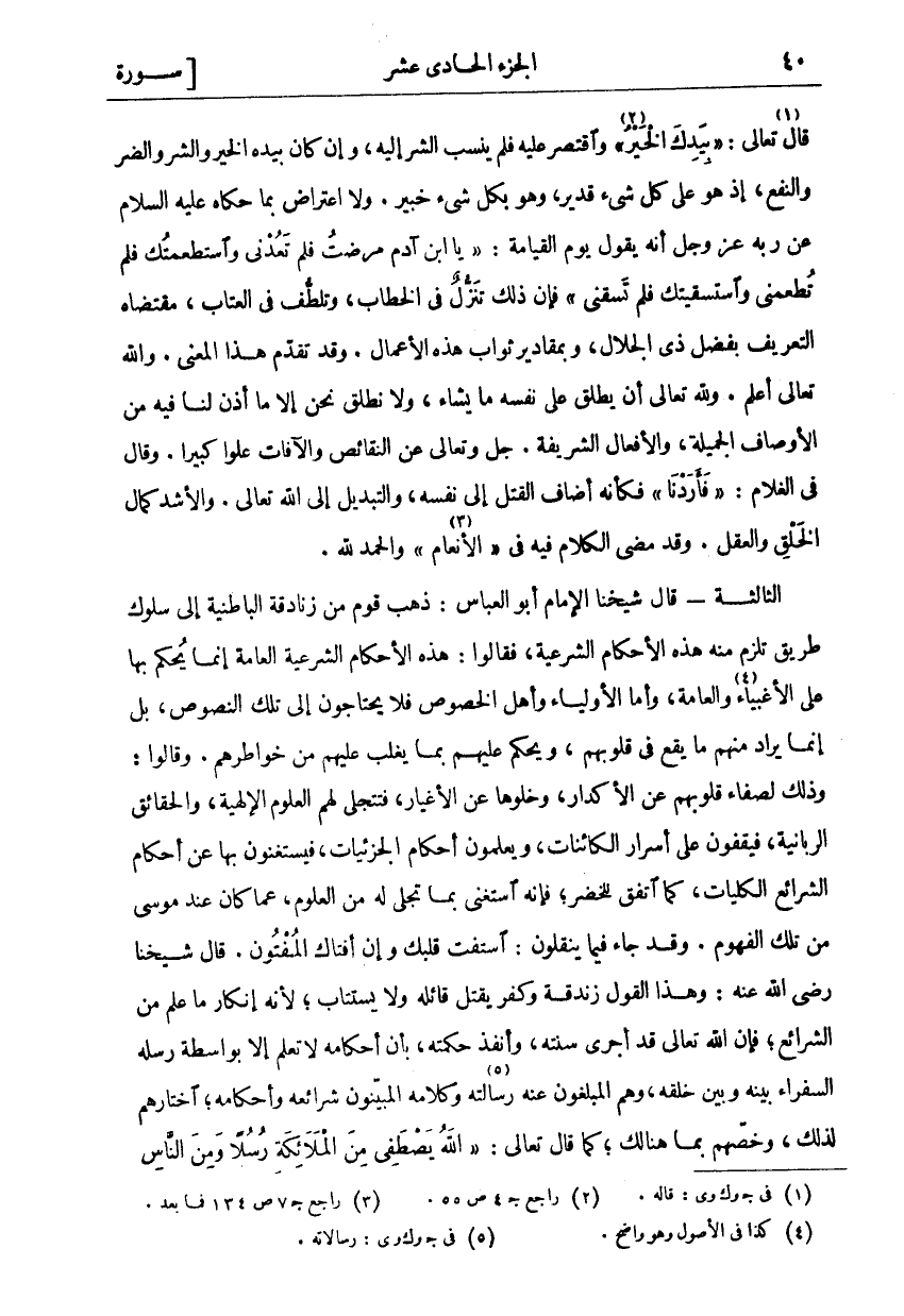 قال «١» تعالى:" بِيَدِكَ الْخَيْرُ" «٢» [آل عمران: ٢٦] وَاقْتَصَرَ عَلَيْهِ فَلَمْ يُنْسَبِ الشَّرُّ إِلَيْهِ، وَإِنْ كَانَ بِيَدِهِ الْخَيْرُ وَالشَّرُّ وَالضُّرُّ وَالنَّفْعُ، إِذْ هو على كل شي قدير، وهو بكل شي خَبِيرٌ. وَلَا اعْتِرَاضَ بِمَا حَكَاهُ عَلَيْهِ السَّلَامُ عَنْ رَبِّهِ عَزَّ وَجَلَّ أَنَّهُ يَقُولُ يَوْمَ الْقِيَامَةِ: (يَا ابْنَ آدَمَ مَرِضْتُ فَلَمْ تَعُدْنِي واستطعمك فَلَمْ تُطْعِمْنِي وَاسْتَسْقَيْتُكَ فَلَمْ تَسْقِنِي) فَإِنَّ ذَلِكَ تَنَزُّلٌ فِي الْخِطَابِ وَتَلَطُّفٌ فِي الْعِتَابِ مُقْتَضَاهُ التَّعْرِيفُ بِفَضْلِ ذِي الْجَلَالِ وَبِمَقَادِيرِ ثَوَابِ هَذِهِ الْأَعْمَالِ. وَقَدْ تَقَدَّمَ هَذَا الْمَعْنَى. وَاللَّهُ تَعَالَى أَعْلَمُ. وَلِلَّهِ تَعَالَى أَنْ يُطْلِقَ عَلَى نَفْسِهِ مَا يَشَاءُ، وَلَا نُطْلِقُ نَحْنُ إِلَّا مَا أَذِنَ لَنَا فِيهِ مِنَ الْأَوْصَافِ الْجَمِيلَةِ وَالْأَفْعَالِ الشَّرِيفَةِ. جَلَّ وَتَعَالَى عَنِ النَّقَائِصِ وَالْآفَاتِ عُلُوًّا كَبِيرًا. وَقَالَ فِي الْغُلَامِ:" فَأَرَدْنا" فَكَأَنَّهُ أَضَافَ الْقَتْلَ إِلَى نَفْسِهِ، وَالتَّبْدِيلَ إِلَى اللَّهِ تَعَالَى. وَالْأَشُدُّ كَمَالُ الْخَلْقِ وَالْعَقْلِ. وَقَدْ مَضَى الْكَلَامُ فِيهِ فِي" الْأَنْعَامِ" «٣» وَالْحَمْدُ لِلَّهِ. الثَّالِثَةُ- قَالَ شَيْخُنَا الْإِمَامُ أَبُو الْعَبَّاسِ: ذَهَبَ قَوْمٌ مِنْ زَنَادِقَةِ الْبَاطِنِيَّةِ إِلَى سُلُوكِ طَرِيقٍ تَلْزَمُ مِنْهُ هَذِهِ الْأَحْكَامُ الشَّرْعِيَّةُ، فَقَالُوا: هَذِهِ الْأَحْكَامُ الشَّرْعِيَّةُ الْعَامَّةُ إِنَّمَا يُحْكَمُ بِهَا عَلَى الْأَنْبِيَاءِ «٤» وَالْعَامَّةِ، وَأَمَّا الْأَوْلِيَاءُ وَأَهْلُ الْخُصُوصِ فَلَا يَحْتَاجُونَ إِلَى تلك النصوص، بل إنما يزاد مِنْهُمْ مَا يَقَعُ فِي قُلُوبِهِمْ، وَيُحْكَمُ عَلَيْهِمْ بِمَا يَغْلِبُ عَلَيْهِمْ مِنْ خَوَاطِرِهِمْ. وَقَالُوا: وَذَلِكَ لصفاء قلوبهم عن الاكدار، وخلوها عن الْأَغْيَارِ، فَتَتَجَلَّى لَهُمُ الْعُلُومُ الْإِلَهِيَّةُ، وَالْحَقَائِقُ الرَّبَّانِيَّةُ، فَيَقِفُونَ عَلَى أَسْرَارِ الْكَائِنَاتِ، وَيَعْلَمُونَ أَحْكَامَ الْجُزْئِيَّاتِ، فَيَسْتَغْنُونَ بِهَا عَنْ أَحْكَامِ الشَّرَائِعِ الْكُلِّيَّاتِ، كَمَا اتَّفَقَ لِلْخَضِرِ، فَإِنَّهُ اسْتَغْنَى بِمَا تَجَلَّى لَهُ مِنَ الْعُلُومِ، عَمَّا كَانَ عِنْدَ مُوسَى مِنْ تِلْكَ الْفُهُومِ. وَقَدْ جَاءَ فِيمَا يَنْقُلُونَ: اسْتَفْتِ قَلْبَكَ وَإِنْ أَفْتَاكَ الْمُفْتُونَ. قَالَ شَيْخُنَا رَضِيَ اللَّهُ عَنْهُ: وَهَذَا الْقَوْلُ زَنْدَقَةٌ وَكُفْرٌ يُقْتَلُ قَائِلُهُ وَلَا يُسْتَتَابُ، لِأَنَّهُ إِنْكَارُ مَا عُلِمَ مِنَ الشَّرَائِعِ، فَإِنَّ اللَّهَ تَعَالَى قَدْ أَجْرَى سُنَّتَهُ، وَأَنْفَذَ حِكْمَتَهُ، بِأَنَّ أَحْكَامَهُ لَا تُعْلَمُ إِلَّا بِوَاسِطَةِ رُسُلِهِ السُّفَرَاءِ بَيْنَهُ وَبَيْنَ خَلْقِهِ، وَهُمُ الْمُبَلِّغُونَ عَنْهُ رِسَالَتَهُ «٥» وَكَلَامَهُ الْمُبَيِّنُونَ شَرَائِعَهُ وَأَحْكَامَهُ، اخْتَارَهُمْ لِذَلِكَ، وَخَصَّهُمْ بِمَا هُنَالِكَ، كَمَا قَالَ تَعَالَى:" اللَّهُ يَصْطَفِي مِنَ الْمَلائِكَةِ رُسُلًا وَمِنَ النَّاسِ