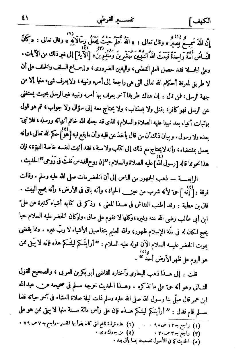 إِنَّ اللَّهَ سَمِيعٌ بَصِيرٌ" «١» [الحج: ٧٥] وَقَالَ تَعَالَى:" اللَّهُ أَعْلَمُ حَيْثُ يَجْعَلُ رِسالَتَهُ" «٢» [الانعام: ٢٤١] وَقَالَ تَعَالَى:" كانَ النَّاسُ أُمَّةً واحِدَةً فَبَعَثَ اللَّهُ النَّبِيِّينَ مُبَشِّرِينَ وَمُنْذِرِينَ" «٣» [البقرة: ٢١٣] [الآية «٤»] إِلَى غَيْرِ ذَلِكَ مِنَ الْآيَاتِ. وَعَلَى الْجُمْلَةِ فَقَدْ حَصَلَ الْعِلْمُ الْقَطْعِيُّ، وَالْيَقِينُ الضَّرُورِيُّ وَاجْتِمَاعُ السَّلَفِ وَالْخَلَفِ عَلَى أَنْ لَا طَرِيقَ لِمَعْرِفَةِ أَحْكَامِ اللَّهِ تَعَالَى الَّتِي هِيَ رَاجِعَةٌ إِلَى أمره ونهيه، ولا يعرف شي مِنْهَا إِلَّا مِنْ جِهَةِ الرُّسُلِ، فَمَنْ قَالَ: إِنَّ هُنَاكَ طَرِيقًا آخَرَ يُعْرَفُ بِهَا أَمْرُهُ وَنَهْيُهُ غَيْرُ الرُّسُلِ بِحَيْثُ يُسْتَغْنَى عَنِ الرُّسُلِ فَهُوَ كَافِرٌ يُقْتَلُ وَلَا يُسْتَتَابُ، وَلَا يَحْتَاجُ مَعَهُ إِلَى سُؤَالٍ وَلَا جَوَابٍ، ثُمَّ هُوَ قَوْلٌ بِإِثْبَاتِ أَنْبِيَاءَ بَعْدَ نَبِيِّنَا عَلَيْهِ الصَّلَاةُ وَالسَّلَامُ، الَّذِي قَدْ جَعَلَهُ اللَّهُ خَاتَمَ أَنْبِيَائِهِ وَرُسُلِهِ، فَلَا نَبِيَّ بَعْدَهُ وَلَا رَسُولَ. وَبَيَانُ ذَلِكَ أَنَّ مَنْ قَالَ يَأْخُذُ عَنْ قَلْبِهِ وأن ما يقع فيه [هو] «٥» حُكْمُ اللَّهِ تَعَالَى وَأَنَّهُ يَعْمَلُ بِمُقْتَضَاهُ، وَأَنَّهُ لَا يَحْتَاجُ مَعَ ذَلِكَ إِلَى كِتَابٍ وَلَا سُنَّةٍ، فَقَدْ أَثْبَتَ لِنَفْسِهِ خَاصَّةَ النُّبُوَّةِ، فَإِنَّ هذا نحو ما قاله [رسول الله «٦»] عَلَيْهِ الصَّلَاةُ وَالسَّلَامُ: (إِنَّ رُوحَ الْقُدُسِ نَفَثَ فِي رُوعِي) الْحَدِيثَ. الرَّابِعَةُ- ذَهَبَ الْجُمْهُورُ مِنَ النَّاسِ إِلَى أَنَّ الْخَضِرَ مَاتَ صَلَّى اللَّهُ عَلَيْهِ وَسَلَّمَ. وقالت فرقة: [إنه [«٧» حَيٌّ لِأَنَّهُ شَرِبَ مِنْ عَيْنِ الْحَيَاةِ، وَأَنَّهُ بَاقٍ فِي الْأَرْضِ وَأَنَّهُ يَحُجُّ الْبَيْتَ. قَالَ بن عَطِيَّةَ: وَقَدْ أَطْنَبَ النَّقَّاشُ فِي هَذَا الْمَعْنَى، وَذَكَرَ فِي كِتَابِهِ أَشْيَاءَ كَثِيرَةً عَنْ عَلِيِّ ابن أبي طالب رضى الله عنه وَغَيْرِهِ، وَكُلُّهَا لَا تَقُومُ عَلَى سَاقٍ. وَلَوْ كَانَ الْخَضِرُ عَلَيْهِ السَّلَامُ حَيًّا يَحُجُّ لَكَانَ لَهُ فِي مِلَّةِ الْإِسْلَامِ ظُهُورٌ، وَاللَّهُ الْعَلِيمُ بِتَفَاصِيلِ الْأَشْيَاءِ لَا رَبَّ غَيْرُهُ. وَمِمَّا يَقْضِي بِمَوْتِ الْخَضِرِ عَلَيْهِ السَّلَامُ الْآنَ قَوْلُهُ عَلَيْهِ السلام: (أرأيتكم ليلتكم هذه فإنه لَا يَبْقَى مِمَّنْ هُوَ الْيَوْمَ عَلَى ظَهْرِ الْأَرْضِ أَحَدٌ) «٨». قُلْتُ: إِلَى هَذَا ذَهَبَ الْبُخَارِيُّ وَاخْتَارَهُ الْقَاضِي أَبُو بَكْرِ بْنُ الْعَرَبِيِّ، وَالصَّحِيحُ الْقَوْلُ الثَّانِي وَهُوَ أَنَّهُ حَيٌّ عَلَى مَا نذكره. وهذا وَالْحَدِيثُ خَرَّجَهُ مُسْلِمٌ فِي صَحِيحِهِ عَنْ عَبْدِ الله ابن عُمَرَ قَالَ صَلَّى بِنَا رَسُولُ اللَّهِ صَلَّى اللَّهُ عَلَيْهِ وَسَلَّمَ ذَاتَ لَيْلَةٍ صَلَاةَ الْعِشَاءِ فِي آخِرِ حَيَاتِهِ فَلَمَّا سَلَّمَ قَامَ فَقَالَ: (أَرَأَيْتُكُمْ لَيْلَتَكُمْ هَذِهِ فَإِنَّ عَلَى رَأْسِ مِائَةِ سَنَةٍ مِنْهَا لَا يَبْقَى مِمَّنْ هُوَ عَلَى