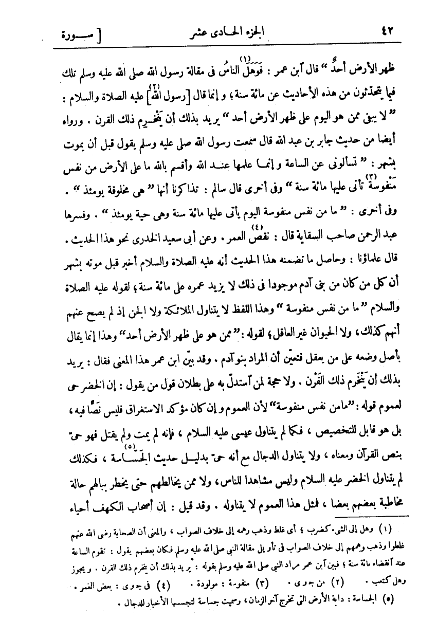 ظَهْرِ الْأَرْضِ أَحَدٌ) قَالَ ابْنُ عُمَرَ: فَوَهَلَ «١» النَّاسُ فِي مَقَالَةِ رَسُولُ اللَّهِ صَلَّى اللَّهُ عَلَيْهِ وَسَلَّمَ تِلْكَ فِيمَا يَتَحَدَّثُونَ مِنْ هَذِهِ الأحاديث عن مائة سنة، وإنما قال [رسول الله «٢»] عَلَيْهِ الصَّلَاةُ وَالسَّلَامُ: (لَا يَبْقَى مِمَّنْ هُوَ الْيَوْمَ عَلَى ظَهْرِ الْأَرْضِ أَحَدٌ) يُرِيدُ بِذَلِكَ أَنْ يَنْخَرِمَ ذَلِكَ الْقَرْنُ. وَرَوَاهُ أَيْضًا مِنْ حَدِيثِ جَابِرِ بْنِ عَبْدِ اللَّهِ قَالَ سَمِعْتُ رَسُولَ اللَّهِ صَلَّى اللَّهُ عَلَيْهِ وَسَلَّمَ يقول قَبْلَ أَنْ يَمُوتَ بِشَهْرٍ: (تَسْأَلُونِي عَنِ السَّاعَةِ وَإِنَّمَا عِلْمُهَا عِنْدَ اللَّهِ وَأُقْسِمُ بِاللَّهِ مَا عَلَى الْأَرْضِ مِنْ نَفْسٍ مَنْفُوسَةٍ «٣» تَأْتِي عَلَيْهَا مِائَةُ سَنَةٍ) وَفِي أُخْرَى قَالَ سَالِمٌ: تَذَاكَرْنَا أَنَّهَا (هِيَ مَخْلُوقَةٌ يَوْمئِذٍ). وَفِي أُخْرَى: (مَا مِنْ نَفْسٍ مَنْفُوسَةٍ الْيَوْمَ يَأْتِي عَلَيْهَا مِائَةُ سَنَةٍ وَهِيَ حَيَّةٌ يَوْمئِذٍ). وَفَسَّرَهَا عَبْدُ الرَّحْمَنِ صَاحِبُ السِّقَايَةِ قَالَ: نَقْصُ «٤» الْعُمْرِ. وَعَنْ أَبِي سَعِيدٍ الْخُدْرِيِّ نَحْوُ هَذَا الْحَدِيثِ قَالَ عُلَمَاؤُنَا: وَحَاصِلُ مَا تَضَمَّنَهُ هَذَا الْحَدِيثُ أَنَّهُ عَلَيْهِ الصَّلَاةُ وَالسَّلَامُ أَخْبَرَ قَبْلَ مَوْتِهِ بِشَهْرٍ أَنَّ كُلَّ مَنْ كَانَ مِنْ بَنِي آدَمَ مَوْجُودًا فِي ذَلِكَ لَا يَزِيدُ عُمْرُهُ عَلَى مِائَةِ سَنَةٍ، لِقَوْلِهِ عَلَيْهِ الصَّلَاةُ وَالسَّلَامُ: (مَا مِنْ نَفْسٍ مَنْفُوسَةٍ) وَهَذَا اللَّفْظُ لَا يَتَنَاوَلُ الْمَلَائِكَةَ وَلَا الْجِنَّ إِذْ لَمْ يَصِحَّ عَنْهُمْ أَنَّهُمْ كَذَلِكَ، وَلَا الْحَيَوَانَ غَيْرَ الْعَاقِلِ، لِقَوْلِهِ: (مِمَّنْ هُوَ عَلَى ظَهْرِ الْأَرْضِ أَحَدٌ) وَهَذَا إِنَّمَا يُقَالُ بِأَصْلِ وَضْعِهِ عَلَى مَنْ يَعْقِلُ، فَتَعَيَّنَ أَنَّ الْمُرَادَ بَنُو آدَمَ. وَقَدْ بَيَّنَ ابْنُ عُمَرَ هَذَا الْمَعْنَى، فَقَالَ: يُرِيدُ بِذَلِكَ أَنْ يَنْخَرِمَ ذَلِكَ الْقَرْنُ. وَلَا حُجَّةَ لِمَنِ اسْتَدَلَّ بِهِ عَلَى بُطْلَانِ قَوْلِ مَنْ يَقُولُ: إِنَّ الْخَضِرَ حَيٌّ لِعُمُومِ قَوْلِهِ: (مَا مِنْ نَفْسٍ مَنْفُوسَةٍ) لِأَنَّ الْعُمُومَ وَإِنْ كَانَ مُؤَكِّدَ الِاسْتِغْرَاقِ فَلَيْسَ نَصًّا فِيهِ، بَلْ هُوَ قَابِلٌ لِلتَّخْصِيصِ. فَكَمَا لَمْ يَتَنَاوَلْ عِيسَى عَلَيْهِ السَّلَامَ، فَإِنَّهُ لَمْ يَمُتْ وَلَمْ يُقْتَلْ فَهُوَ حَيٌّ بِنَصِّ الْقُرْآنِ وَمَعْنَاهُ، وَلَا يَتَنَاوَلُ الدَّجَّالَ مَعَ أَنَّهُ حَيٌّ بِدَلِيلِ حَدِيثِ الْجَسَّاسَةِ «٥»، فَكَذَلِكَ لَمْ يَتَنَاوَلِ الخضر عليه السلام وليس مشاهد لِلنَّاسِ، وَلَا مِمَّنْ يُخَالِطُهُمْ حَتَّى يَخْطُرَ بِبَالِهِمْ حَالَةَ مُخَاطَبَةِ بَعْضِهِمْ بَعْضًا، فَمِثْلُ هَذَا الْعُمُومِ لَا يَتَنَاوَلُهُ. وَقَدْ قِيلَ: إِنَّ أَصْحَابَ الْكَهْفِ أحياء