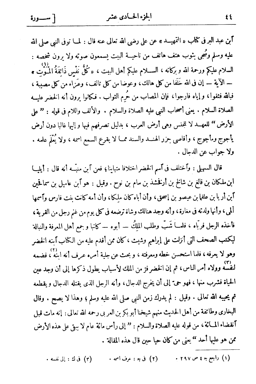 ابن عَبْدِ الْبَرِّ فِي كِتَابِ (التَّمْهِيدِ) عَنْ عَلِيٍّ رَضِيَ اللَّهُ تَعَالَى عَنْهُ قَالَ: لَمَّا تُوُفِّيَ النَّبِيُّ صَلَّى اللَّهُ عَلَيْهِ وَسَلَّمَ وَسُجِّيَ بِثَوْبٍ هَتَفَ هَاتِفٌ مِنْ نَاحِيَةِ الْبَيْتِ يَسْمَعُونَ صَوْتَهُ وَلَا يَرَوْنَ شَخْصَهُ: السَّلَامُ عَلَيْكُمْ وَرَحْمَةُ اللَّهِ وَبَرَكَاتُهُ، السَّلَامُ عَلَيْكُمْ أَهْلَ الْبَيْتِ" كُلُّ نَفْسٍ ذائِقَةُ الْمَوْتِ" «١» [أل عمران: ١٨٥]- الْآيَةَ- إِنَّ فِي اللَّهِ خَلَفًا مِنْ كُلِّ هَالِكٍ، وَعِوَضًا مِنْ كُلِّ تَالِفٍ، وَعَزَاءً مِنْ كُلِّ مُصِيبَةٍ، فَبِاللَّهِ فَثِقُوا، وَإِيَّاهُ فَارْجُوا، فَإِنَّ الْمُصَابَ مَنْ حُرِمَ الثَّوَابَ. فَكَانُوا يَرَوْنَ أَنَّهُ الخضر عليه الصلاة السلام. يَعْنِي أَصْحَابَ النَّبِيِّ عَلَيْهِ الصَّلَاةُ وَالسَّلَامُ. وَالْأَلِفُ وَاللَّامُ فِي قَوْلِهِ: (عَلَى الْأَرْضِ) لِلْعَهْدِ لَا لِلْجِنْسِ وَهِيَ أَرْضُ الْعَرَبِ، بِدَلِيلِ تَصَرُّفِهِمْ فِيهَا وَإِلَيْهَا غَالِبًا دُونَ أَرْضِ يَأْجُوجَ وَمَأْجُوجَ، وَأَقَاصِي جُزُرِ الْهِنْدِ وَالسِّنْدِ مِمَّا لَا يَقْرَعُ السَّمْعَ اسْمُهُ، وَلَا يُعْلَمُ عِلْمُهُ. وَلَا جَوَابَ عَنِ الدَّجَّالِ. قَالَ السُّهَيْلِيُّ: وَاخْتُلِفَ فِي اسْمِ الْخَضِرِ اخْتِلَافًا مُتَبَايِنًا، فَعَنِ ابْنِ مُنَبِّهٍ أَنَّهُ قَالَ: أيليا ابن مَلْكَانَ بْنِ فَالِغَ بْنِ شَالِخَ بْنِ أَرْفَخْشَذَ بْنِ سَامِ بْنِ نُوحٍ. وَقِيلَ: هُوَ ابْنُ عاميل بن سماقحين ابن أَرْيَا بْنِ عَلْقَمَا بْنِ عِيصُو بْنِ إِسْحَاقَ، وَأَنَّ أَبَاهُ كَانَ مَلِكًا، وَأَنَّ أُمَّهُ كَانَتْ بِنْتَ فَارِسٍ وَاسْمُهَا أَلْمَى، وَأَنَّهَا وَلَدَتْهُ فِي مَغَارَةٍ، وَأَنَّهُ وُجِدَ هُنَالِكَ وَشَاةً تُرْضِعُهُ فِي كُلِّ يَوْمٍ مِنْ غَنَمِ رَجُلٍ مِنَ الْقَرْيَةِ، فَأَخَذَهُ الرَّجُلُ فَرَبَّاهُ، فَلَمَّا شَبَّ وَطَلَبَ الْمَلِكُ- أَبُوهُ- كَاتِبًا وَجَمَعَ أَهْلَ الْمَعْرِفَةِ وَالنَّبَالَةِ لِيَكْتُبَ الصُّحُفَ الَّتِي أُنْزِلَتْ عَلَى إِبْرَاهِيمَ وَشِيثَ، كَانَ مِمَّنْ أَقْدَمَ عَلَيْهِ مِنَ الْكُتَّابِ ابْنُهُ الْخَضِرُ وَهُوَ لَا يَعْرِفُهُ، فَلَمَّا اسْتَحْسَنَ خَطَّهُ وَمَعْرِفَتَهُ وَبَحَثَ عَنْ جَلِيَّةِ أَمْرِهِ عَرَفَ أَنَّهُ ابْنُهُ «٢» فَضَمَّهُ لِنَفْسِهِ «٣» وَوَلَّاهُ أَمْرَ النَّاسِ ثُمَّ إِنَّ الْخَضِرَ فَرَّ مِنَ الْمَلِكِ لِأَسْبَابٍ يَطُولُ ذِكْرُهَا إِلَى أَنْ وَجَدَ عَيْنَ الْحَيَاةِ فَشَرِبَ مِنْهَا، فَهُوَ حَيٌّ إِلَى أَنْ يَخْرُجَ الدَّجَّالُ، وَأَنَّهُ الرَّجُلُ الَّذِي يَقْتُلُهُ الدَّجَّالُ وَيَقْطَعُهُ ثُمَّ يُحْيِيَهُ اللَّهُ تَعَالَى. وَقِيلَ: لَمْ يُدْرِكْ زَمَنَ النَّبِيِّ صَلَّى اللَّهُ عَلَيْهِ وَسَلَّمَ، وَهَذَا لَا يَصِحُّ. وَقَالَ الْبُخَارِيُّ وَطَائِفَةٌ مِنْ أَهْلِ الْحَدِيثِ مِنْهُمْ شَيْخُنَا أَبُو بَكْرِ بْنُ الْعَرَبِيِّ رَحِمَهُ اللَّهُ تَعَالَى: إِنَّهُ مَاتَ قَبْلَ انْقِضَاءِ الْمِائَةِ، مِنْ قَوْلِهِ عَلَيْهِ الصَّلَاةُ وَالسَّلَامُ: (إِلَى رَأْسِ مِائَةِ عَامٍ لَا يَبْقَى عَلَى هَذِهِ الْأَرْضِ مِمَّنْ هُوَ عَلَيْهَا أَحَدٌ) يَعْنِي مَنْ كَانَ حَيًّا حين قال هذه المقالة.