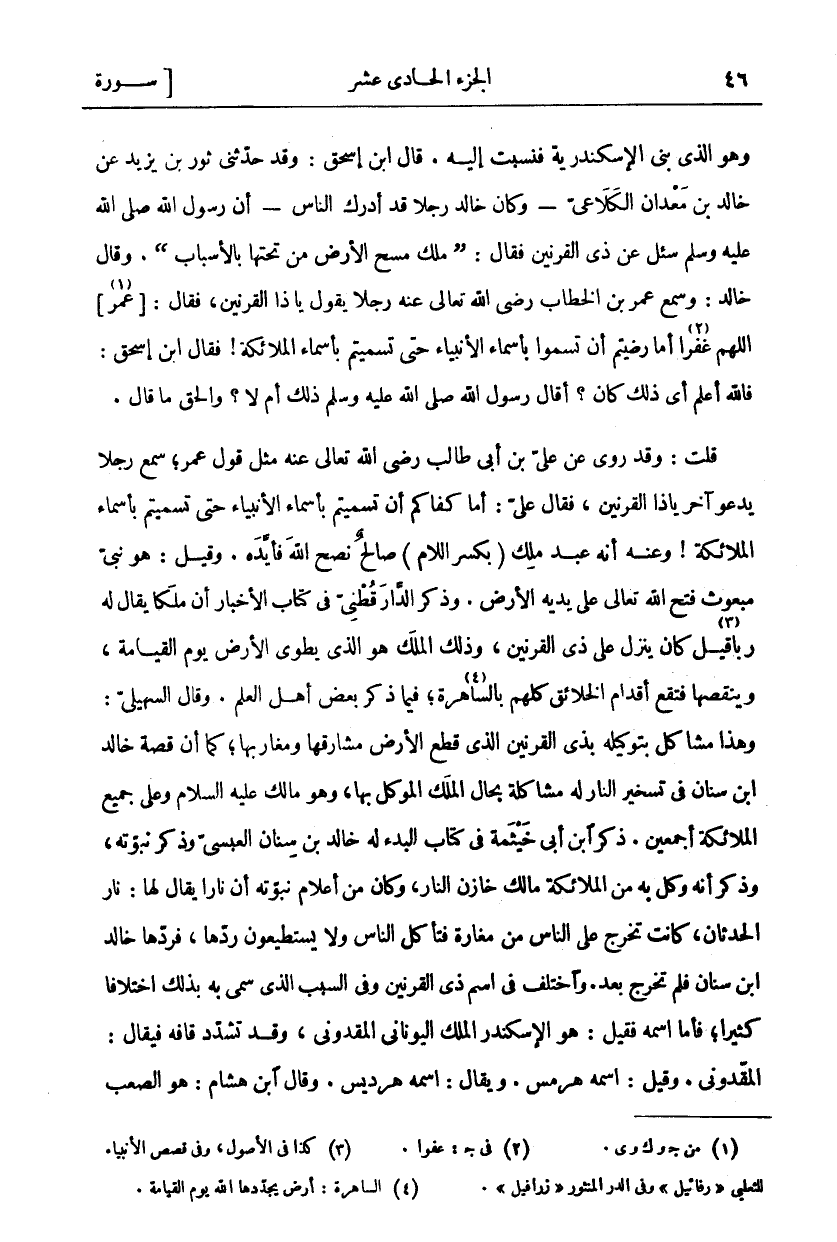 وَهُوَ الَّذِي بَنَى الْإِسْكَنْدَرِيَّةَ فَنُسِبَتْ إِلَيْهِ. قَالَ ابْنُ إِسْحَاقَ: وَقَدْ حَدَّثَنِي ثَوْرِ بْنِ يَزِيدَ عَنْ خَالِدِ بْنِ مَعْدَانَ الْكُلَاعِيِّ- وَكَانَ خَالِدُ رَجُلًا قَدْ أَدْرَكَ النَّاسَ- أَنَّ رَسُولَ اللَّهِ صَلَّى اللَّهُ عَلَيْهِ وَسَلَّمَ سُئِلَ عَنْ ذِي الْقَرْنَيْنِ فَقَالَ: (مَلِكٌ مَسَحَ الْأَرْضَ مِنْ تَحْتِهَا بِالْأَسْبَابِ). وَقَالَ خَالِدٌ: وَسَمِعَ عُمَرَ بْنِ الْخَطَّابِ رَضِيَ اللَّهُ تَعَالَى عَنْهُ رَجُلًا يَقُولُ يَا ذا القرنين، فقال: [عمر «١»] اللَّهُمَّ غُفْرًا «٢» أَمَا رَضِيتُمْ أَنْ تُسَمَّوْا بِأَسْمَاءِ الأنبياء حتى تسميتم بأسماء الملائكة! فقال ابْنُ إِسْحَاقَ: فَاللَّهُ أَعْلَمُ أَيُّ ذَلِكَ كَانَ؟ أَقَالَ رَسُولِ اللَّهِ صَلَّى اللَّهُ عَلَيْهِ وَسَلَّمَ ذَلِكَ أَمْ لَا؟ وَالْحَقُّ مَا قَالَ. قُلْتُ: وَقَدْ رُوِيَ عَنْ عَلِيِّ بْنِ أَبِي طَالِبٍ رَضِيَ اللَّهُ تَعَالَى عَنْهُ مِثْلُ قَوْلِ عُمَرَ، سمع رجل يَدْعُو آخَرَ يَا ذَا الْقَرْنَيْنِ، فَقَالَ عَلِيٌّ: أَمَا كَفَاكُمْ أَنْ تَسَمَّيْتُمْ بِأَسْمَاءِ الْأَنْبِيَاءِ حَتَّى تَسَمَّيْتُمْ بِأَسْمَاءِ الْمَلَائِكَةِ! وَعَنْهُ أَنَّهُ عَبْدُ مَلِكٍ (بِكَسْرِ اللَّامِ) صَالِحٍ نَصَحَ اللَّهَ فَأَيَّدَهُ. وَقِيلَ: هُوَ نَبِيٌّ مَبْعُوثٌ فَتَحَ اللَّهُ تَعَالَى عَلَى يَدَيْهِ الْأَرْضَ. وَذَكَرَ الدَّارَقُطْنِيُّ فِي كِتَابِ الْأَخْبَارِ أَنَّ مَلَكًا يُقَالُ لَهُ رَبَاقِيلُ «٣» كَانَ يَنْزِلُ عَلَى ذِي الْقَرْنَيْنِ، وَذَلِكَ الْمَلَكُ هُوَ الَّذِي يطوي الأرض يوم القيامة، وينقصها فَتَقَعُ أَقْدَامُ الْخَلَائِقِ كُلِّهِمْ بِالسَّاهِرَةِ «٤»، فِيمَا ذَكَرَ بَعْضُ أَهْلِ الْعِلْمِ. وَقَالَ السُّهَيْلِيُّ: وَهَذَا مُشَاكِلٌ بِتَوْكِيلِهِ بِذِي الْقَرْنَيْنِ الَّذِي قَطَعَ الْأَرْضَ مَشَارِقَهَا ومغاربها، كما أن قصة خالد ابن سِنَانٍ فِي تَسْخِيرِ النَّارِ لَهُ مُشَاكِلَةٌ بِحَالِ الْمَلَكِ الْمُوَكَّلِ بِهَا، وَهُوَ مَالِكٌ عَلَيْهِ السَّلَامُ وَعَلَى جَمِيعِ الْمَلَائِكَةِ أَجْمَعِينَ. ذَكَرَ ابْنُ أَبِي خَيْثَمَةَ فِي كِتَابِ الْبَدْءِ لَهُ خَالِدَ بْنَ سِنَانٍ الْعَبْسِيَّ وَذَكَرَ نُبُوَّتَهُ، وَذَكَرَ أَنَّهُ وُكِّلَ بِهِ مِنَ الْمَلَائِكَةِ مَالِكٌ خَازِنُ النَّارِ، وَكَانَ مِنْ أَعْلَامِ نُبُوَّتِهِ أَنَّ نَارًا يُقَالُ لَهَا: نَارُ الْحَدَثَانِ، كَانَتْ تَخْرُجُ عَلَى النَّاسِ مِنْ مَغَارَةٍ فَتَأْكُلُ النَّاسَ وَلَا يَسْتَطِيعُونَ رَدَّهَا، فَرَدَّهَا خالد ابن سِنَانٍ فَلَمْ تَخْرُجْ بَعْدُ. وَاخْتُلِفَ فِي اسْمِ ذِي الْقَرْنَيْنِ وَفِي السَّبَبِ الَّذِي سُمِّيَ بِهِ بِذَلِكَ اخْتِلَافًا كَثِيرًا، فَأَمَّا اسْمُهُ فَقِيلَ: هُوَ الْإِسْكَنْدَرُ الْمَلِكُ الْيُونَانِيُّ الْمَقْدُونِيُّ، وَقَدْ تُشَدَّدُ قَافُهُ فَيُقَالُ: الْمَقَّدُونِيُّ. وَقِيلَ: اسْمُهُ هَرْمَسُ. وَيُقَالُ: اسْمُهُ هرديس. وقال ابن هشام: هو الصعب