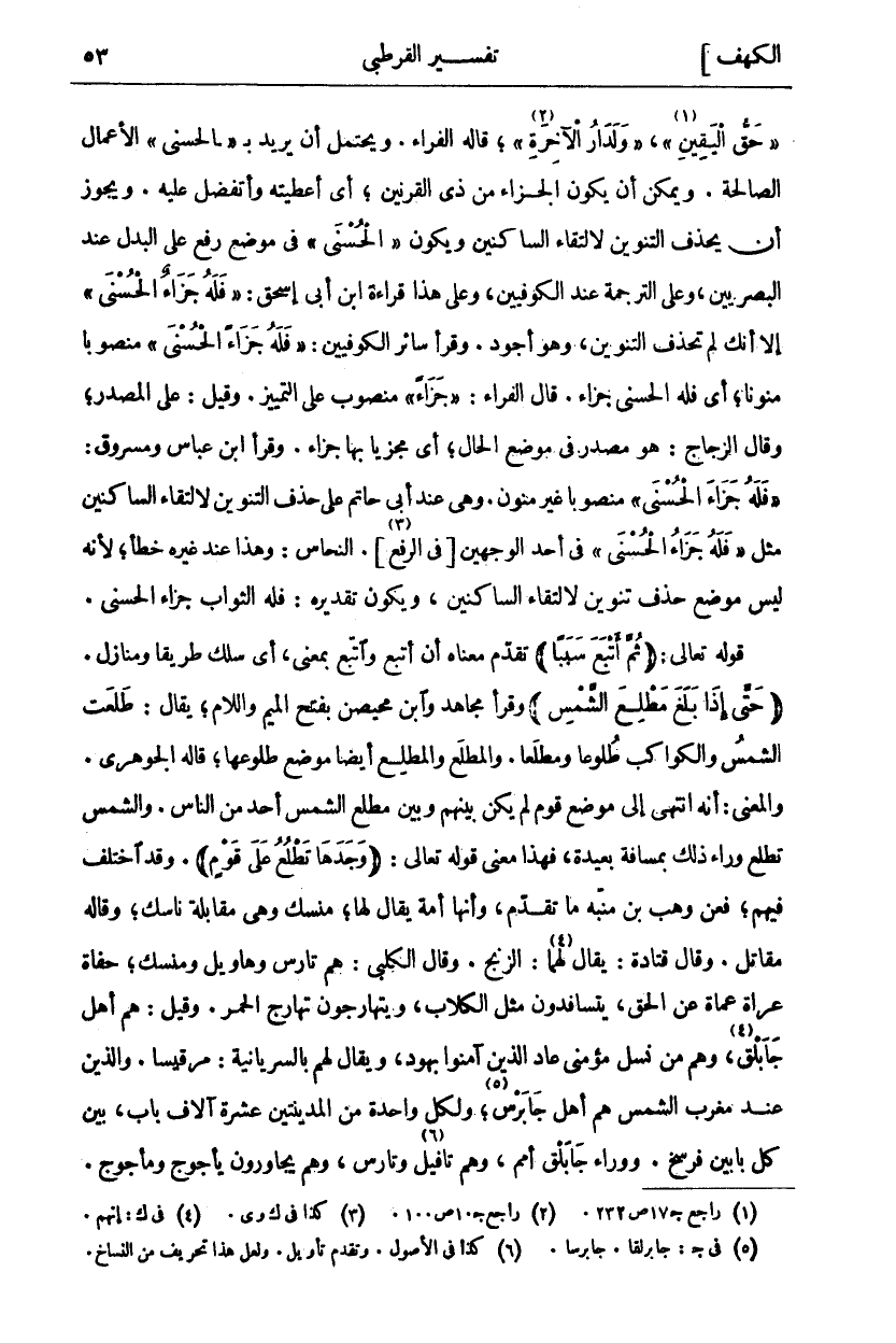 " حَقُّ الْيَقِينِ" «١» [الواقعة: ٩٥]،" وَلَدارُ الْآخِرَةِ ١٠" «٢» [الانعام: ٣٢]، قَالَهُ الْفَرَّاءُ. وَيَحْتَمِلُ أَنْ يُرِيدَ بِ" الْحُسْنى " الْأَعْمَالَ الصَّالِحَةَ. وَيُمْكِنُ أَنْ يَكُونَ الْجَزَاءُ مِنْ ذي القرنين، أي أعطيته وَأَتَفَضَّلُ عَلَيْهِ. وَيَجُوزُ أَنْ يُحْذَفَ التَّنْوِينُ لِالْتِقَاءِ السَّاكِنَيْنِ وَيَكُونُ" الْحُسْنى " فِي مَوْضِعِ رَفْعٍ عَلَى الْبَدَلِ عِنْدَ الْبَصْرِيِّينَ، وَعَلَى التَّرْجَمَةِ عِنْدَ الْكُوفِيِّينَ، وَعَلَى هَذَا قِرَاءَةُ ابْنِ أَبِي إِسْحَاقَ" فَلَهُ جَزَاءً الْحُسْنَى" إِلَّا أَنَّكَ لَمْ تَحْذِفِ التَّنْوِينَ، وَهُوَ أَجْوَدُ. وَقَرَأَ سَائِرُ الْكُوفِيِّينَ" فَلَهُ جَزَاءً الْحُسْنَى" مَنْصُوبًا مُنَوَّنًا، أَيْ فَلَهُ الْحُسْنَى جَزَاءً. قَالَ الْفَرَّاءُ:" جَزاءُ" مَنْصُوبٌ عَلَى التَّمْيِيزِ. وَقِيلَ: عَلَى الْمَصْدَرِ، وَقَالَ الزَّجَّاجُ: هُوَ مَصْدَرٌ فِي مَوْضِعِ الْحَالِ، أَيْ مَجْزِيًّا بِهَا جَزَاءً. وَقَرَأَ ابْنُ عَبَّاسٍ وَمَسْرُوقٌ:" فَلَهُ جَزَاءَ الْحُسْنَى" مَنْصُوبًا غَيْرَ مُنَوَّنٍ وَهِيَ عِنْدَ أَبِي حَاتِمٍ عَلَى حَذْفِ التَّنْوِينِ لِالْتِقَاءِ السَّاكِنَيْنِ مِثْلُ" فَلَهُ جَزَاءَ الحسنى" في أحد الوجهين [في الرفع «٣»]. النَّحَّاسُ: وَهَذَا عِنْدَ غَيْرِهِ خَطَأٌ لِأَنَّهُ لَيْسَ مَوْضِعُ حَذْفِ تَنْوِينٍ لِالْتِقَاءِ السَّاكِنَيْنِ وَيَكُونُ تَقْدِيرُهُ: فَلَهُ الثَّوَابُ جَزَاءَ الْحُسْنَى. قَوْلُهُ تَعَالَى: (ثُمَّ أَتْبَعَ سَبَباً) تَقَدَّمَ مَعْنَاهُ أَنَّ أَتْبَعَ وَاتَّبَعَ بمعنى أي سلك طريقا ومنازل. (حَتَّى إِذا بَلَغَ مَطْلِعَ الشَّمْسِ) ٩٠ وَقَرَأَ مُجَاهِدٌ وَابْنُ مُحَيْصِنٍ بِفَتْحِ الْمِيمِ وَاللَّامِ، يُقَالُ: طَلَعَتِ الشَّمْسُ وَالْكَوَاكِبُ طُلُوعًا وَمَطْلِعًا. وَالْمَطْلَعُ وَالْمَطْلِعُ أَيْضًا مَوْضِعُ طُلُوعِهَا قاله الجوهري. الْمَعْنَى: أَنَّهُ انْتَهَى إِلَى مَوْضِعِ قَوْمٍ لَمْ يَكُنْ بَيْنَهُمْ وَبَيْنَ مَطْلَعِ الشَّمْسِ أَحَدٌ مِنَ النَّاسِ. وَالشَّمْسُ تَطْلُعُ وَرَاءَ ذَلِكَ بِمَسَافَةٍ بَعِيدَةٍ فهذا معنى قوله تعالى: (وَجَدَها تَطْلُعُ عَلى قَوْمٍ) ٩٠. وَقَدِ اخْتُلِفَ فِيهِمْ، فَعَنْ وَهْبِ بْنِ مُنَبِّهٍ مَا تَقَدَّمَ، وَأَنَّهَا أُمَّةٌ يُقَالُ لَهَا مَنْسَكُ وَهِيَ مُقَابِلَةُ نَاسِكَ، وَقَالَهُ مُقَاتِلٌ. وَقَالَ قَتَادَةُ: يُقَالُ لَهُمَا «٤»: الزِّنْجُ وَقَالَ الْكَلْبِيُّ: هُمْ تَارِسُ وَهَاوِيلُ وَمَنْسَكُ، حُفَاةً عُرَاةً عُمَاةً عَنِ الْحَقِّ، يَتَسَافَدُونَ مِثْلَ الْكِلَابِ، وَيَتَهَارَجُونَ تَهَارُجَ الْحُمُرِ. وَقِيلَ: هُمْ أَهْلُ جابلق وَهُمْ مِنْ نَسْلِ مُؤْمِنِي عَادٍ الَّذِينَ آمَنُوا بِهُودٍ، وَيُقَالُ لَهُمْ بِالسُّرْيَانِيَّةِ مرقيسا. وَالَّذِينَ عِنْدَ مَغْرِبِ الشَّمْسِ هُمْ أَهْلُ جابرس «٥»، وَلِكُلِّ وَاحِدَةٍ مِنَ الْمَدِينَتَيْنِ عَشَرَةُ آلَافِ باب، وبين كل بابين فَرْسَخٌ. وَوَرَاءَ جابلق أُمَمٌ وَهُمْ تَافِيلُ «٦» وَتَارِسُ وهم يجاورون يأجوج ومأجوج.