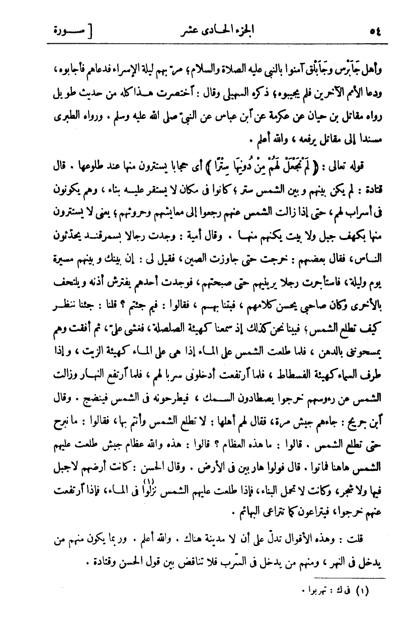 وَأَهْلُ جابرس وَجابلق آمَنُوا بِالنَّبِيِّ عَلَيْهِ الصَّلَاةُ وَالسَّلَامُ (مَرَّ بِهِمْ لَيْلَةَ الْإِسْرَاءِ فَدَعَاهُمْ فَأَجَابُوهُ، وَدَعَا الْأُمَمَ الْآخَرِينَ فَلَمْ يُجِيبُوهُ)، ذَكَرَهُ السُّهَيْلِيُّ وَقَالَ: اخْتَصَرْتُ هَذَا كُلَّهُ مِنْ حَدِيثٍ طَوِيلٍ رَوَاهُ مُقَاتِلُ بْنُ حَيَّانَ عَنْ عِكْرِمَةُ عَنِ ابْنِ عَبَّاسٍ عَنِ النَّبِيِّ صَلَّى اللَّهُ عَلَيْهِ وَسَلَّمَ. وَرَوَاهُ الطَّبَرِيُّ مُسْنَدًا إِلَى مُقَاتِلٍ يَرْفَعُهُ، وَاللَّهُ أَعْلَمُ. قَوْلُهُ تَعَالَى: (لَمْ نَجْعَلْ لَهُمْ مِنْ دُونِها سِتْراً) ٩٠ أَيْ حِجَابًا يَسْتَتِرُونَ مِنْهَا عِنْدَ طُلُوعِهَا. قَالَ قَتَادَةُ: لَمْ يَكُنْ بَيْنَهُمْ وبين الشمس ستر، كَانُوا فِي مَكَانٍ لَا يَسْتَقِرُّ عَلَيْهِ بِنَاءٌ، وَهُمْ يَكُونُونَ فِي أَسْرَابٍ لَهُمْ، حَتَّى إِذَا زَالَتِ الشَّمْسُ عَنْهُمْ رَجَعُوا إِلَى مَعَايِشِهِمْ وَحُرُوثِهِمْ، يَعْنِي لَا يَسْتَتِرُونَ مِنْهَا بِكَهْفِ جَبَلٍ وَلَا بَيْتٍ يُكِنُّهُمْ مِنْهَا. وَقَالَ أُمَيَّةُ: وَجَدْتُ رِجَالًا بِسَمَرْقَنْدَ يُحَدِّثُونَ النَّاسَ، فَقَالَ بَعْضُهُمْ: خَرَجْتُ حَتَّى جَاوَزْتُ الصِّينَ، فَقِيلَ لِي: إِنَّ بَيْنَكَ وَبَيْنَهُمْ مَسِيرَةَ يَوْمٍ وَلَيْلَةٍ، فَاسْتَأْجَرْتُ رَجُلًا يُرِينِيهِمْ حَتَّى صَبَّحْتُهُمْ، فَوَجَدْتُ أَحَدَهُمْ يَفْتَرِشُ أُذُنَهُ وَيَلْتَحِفُ بِالْأُخْرَى وَكَانَ صَاحِبِي يُحْسِنُ كَلَامَهُمْ، فَبِتْنَا بِهِمْ، فَقَالُوا: فِيمَ جِئْتُمْ؟ قُلْنَا: جِئْنَا نَنْظُرَ كَيْفَ تَطْلُعُ الشَّمْسُ، فَبَيْنَا نَحْنُ كَذَلِكَ إِذْ سَمِعْنَا كَهَيْئَةِ الصَّلْصَلَةِ، فَغُشِيَ عَلَيَّ ثُمَّ أَفَقْتُ وَهُمْ يَمْسَحُونَنِي بِالدُّهْنِ، فَلَمَّا طَلَعَتِ الشَّمْسُ عَلَى الْمَاءِ إِذْ هِيَ عَلَى الْمَاءِ كَهَيْئَةِ الزَّيْتِ، وَإِذَا طَرَفُ السَّمَاءِ كَهَيْئَةِ الْفُسْطَاطِ، فَلَمَّا ارْتَفَعَتْ أَدْخَلُونِي سَرَبًا لَهُمْ، فَلَمَّا ارْتَفَعَ النَّهَارُ وَزَالَتِ الشَّمْسُ عَنْ رؤوسهم خَرَجُوا يَصْطَادُونَ السَّمَكَ، فَيَطْرَحُونَهُ فِي الشَّمْسِ فَيَنْضَجُ. وَقَالَ ابْنُ جُرَيْجٍ: جَاءَهُمْ جَيْشٌ مَرَّةً، فَقَالَ لَهُمْ أَهْلُهَا: لَا تَطْلُعُ الشَّمْسُ وَأَنْتُمْ بِهَا، فقالوا: ما نبرح حتى تطلع الشمس. قَالُوا: مَا هَذِهِ الْعِظَامُ؟ قَالُوا: هَذِهِ وَاللَّهِ عِظَامُ جَيْشٍ طَلَعَتْ عَلَيْهِمُ الشَّمْسُ هَاهُنَا فَمَاتُوا. قَالَ فَوَلَّوْا هَارِبِينَ فِي الْأَرْضِ. وَقَالَ الْحَسَنُ: كَانَتْ أَرْضُهُمْ لَا جَبَلَ فِيهَا وَلَا شَجَرَ، وَكَانَتْ لَا تَحْمِلُ الْبِنَاءَ، فَإِذَا طَلَعَتْ عَلَيْهِمُ الشَّمْسُ نَزَلُوا «١» فِي الْمَاءِ، فَإِذَا ارْتَفَعَتْ عَنْهُمْ خَرَجُوا، فَيَتَرَاعَوْنَ كَمَا تَتَرَاعَى الْبَهَائِمُ. قُلْتُ: وَهَذِهِ الْأَقْوَالُ تَدُلُّ عَلَى أَنْ لَا مَدِينَةَ هُنَاكَ. وَاللَّهُ أَعْلَمُ. وَرُبَّمَا يَكُونُ مِنْهُمْ مَنْ يَدْخُلُ فِي النَّهْرِ وَمِنْهُمْ مَنْ يَدْخُلُ فِي السَّرَبِ فلا تناقض بين قول الحسن وقتادة.