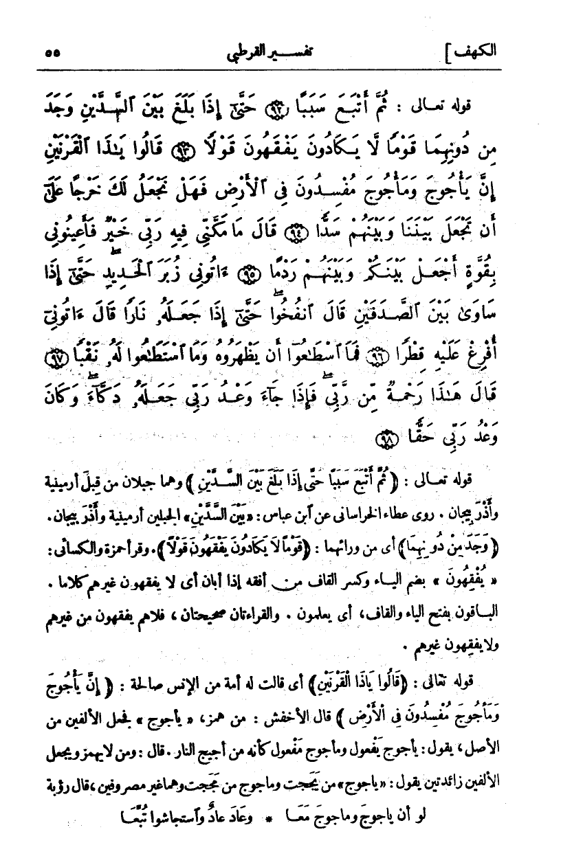 قَوْلُهُ تعالى: (ثُمَّ أَتْبَعَ سَبَباً حَتَّى إِذا بَلَغَ بَيْنَ السَّدَّيْنِ) وَهُمَا جَبَلَانِ مِنْ قِبَلِ أَرْمِينِيَّةَ وَأَذْرَبِيجَانَ. رَوَى عَطَاءٌ الْخُرَاسَانِيُّ عَنِ ابْنِ عَبَّاسٍ:" بَيْنَ السَّدَّيْنِ" الْجَبَلَيْنِ أَرْمِينِيَّةَ وَأَذْرَبِيجَانَ (وَجَدَ مِنْ دُونِهِما) أَيْ مِنْ وَرَائِهِمَا: (قَوْماً لَا يَكادُونَ يَفْقَهُونَ قَوْلًا). وَقَرَأَ حَمْزَةُ وَالْكِسَائِيُّ:" يُفْقِهُونَ" بِضَمِّ الْيَاءِ وَكَسْرِ الْقَافِ مِنْ أَفْقَهَ إِذَا أَبَانَ أَيْ لَا يُفْقِهُونَ غَيْرَهُمْ كَلَامًا. الْبَاقُونَ بِفَتْحِ الْيَاءِ وَالْقَافِ، أَيْ يَعْلَمُونَ. وَالْقِرَاءَتَانِ صَحِيحَتَانِ، فَلَا هُمْ يفقهون من غيرهم ولا يفقهون غيرهم. قوله تعالى: (قالُوا يا ذَا الْقَرْنَيْنِ) أَيْ قَالَتْ لَهُ أُمَّةٌ مِنَ الْإِنْسِ صَالِحَةٍ: (إِنَّ يَأْجُوجَ وَمَأْجُوجَ مُفْسِدُونَ فِي الْأَرْضِ) قَالَ الْأَخْفَشُ: مَنْ هَمَزَ" يَأْجُوجَ" فَجَعَلَ الْأَلِفَيْنِ مِنَ الْأَصْلِ يَقُولُ: يَأْجُوجَ يَفْعُولَ وَمَأْجُوجَ مَفْعُولَ كَأَنَّهُ مِنْ أَجِيجِ النَّارِ. قَالَ: وَمَنْ لَا يَهْمِزُ وَيَجْعَلُ الْأَلِفَيْنِ زَائِدَتَيْنِ يَقُولُ:" يَاجُوجَ" مِنْ يَجَجْتُ وَمَاجُوجَ مِنْ مَجَجْتَ وَهُمَا غَيْرُ مَصْرُوفَيْنِ، قَالَ رُؤْبَةُ: