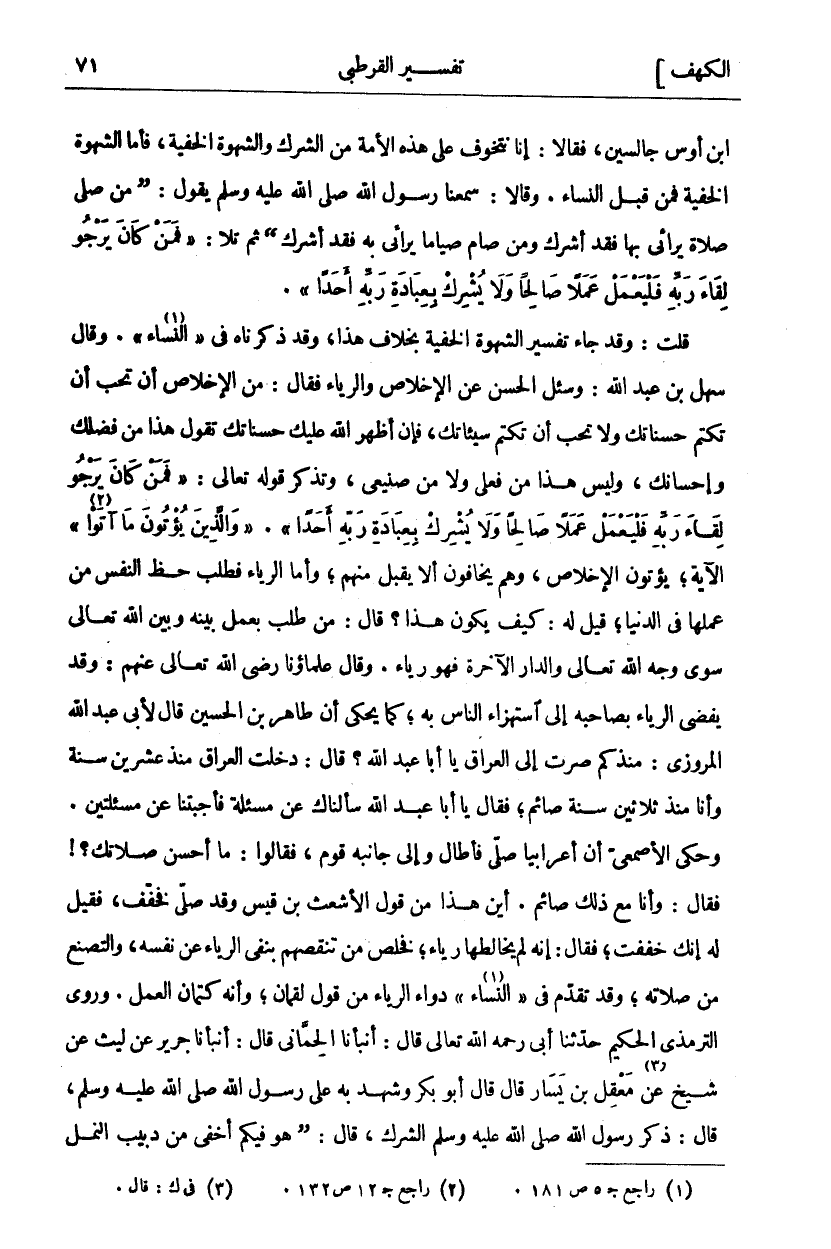 ابن أَوْسٍ جَالِسَيْنِ، فَقَالَا: إِنَّا نَتَخَوَّفُ عَلَى هَذِهِ الْأُمَّةِ مِنَ الشِّرْكِ وَالشَّهْوَةِ الْخَفِيَّةِ، فَأَمَّا الشَّهْوَةُ الْخَفِيَّةُ فَمِنْ قِبَلِ النِّسَاءِ. وَقَالَا: سَمِعْنَا رَسُولَ الله صَلَّى اللَّهُ عَلَيْهِ وَسَلَّمَ يقول: (من صَلَّى صَلَاةً يُرَائِي بِهَا فَقَدْ أَشْرَكَ وَمَنْ صَامَ صِيَامًا يُرَائِي بِهِ فَقَدْ أَشْرَكَ) ثُمَّ تَلَا" فَمَنْ كَانَ يَرْجُو لِقَاءَ رَبِّهِ فَلْيَعْمَلْ عَمَلًا صَالِحًا وَلَا يُشْرِكْ بِعِبَادَةِ رَبِّهِ أَحَدًا (. قُلْتُ: وَقَدْ جَاءَ تَفْسِيرُ الشَّهْوَةِ الْخَفِيَّةِ بِخِلَافِ هَذَا، وَقَدْ ذَكَرْنَاهُ فِي" النِّسَاءِ" «١». وَقَالَ سَهْلُ بن عبد الله: وسيل الْحَسَنُ عَنِ الْإِخْلَاصِ وَالرِّيَاءِ فَقَالَ: مِنَ الْإِخْلَاصِ أَنْ تُحِبَّ أَنْ تَكْتُمَ حَسَنَاتِكَ وَلَا تُحِبَّ أَنْ تَكْتُمَ سَيِّئَاتِكَ، فَإِنْ أَظْهَرَ اللَّهُ عَلَيْكَ حَسَنَاتِكَ تَقُولُ هَذَا مِنْ فَضْلِكَ وَإِحْسَانِكَ، وَلَيْسَ هَذَا مِنْ فِعْلِي وَلَا مِنْ صَنِيعِي، وَتَذْكُرُ قوله تعالى:" فَمَنْ كانَ يَرْجُوا لِقاءَ رَبِّهِ فَلْيَعْمَلْ عَمَلًا صالِحاً وَلا يُشْرِكْ بِعِبادَةِ رَبِّهِ أَحَداً. ١١٠"" وَالَّذِينَ يُؤْتُونَ ما آتَوْا ٦٠" «٢» [المؤمنون: ١٠] الْآيَةَ، يُؤْتُونَ الْإِخْلَاصَ، وَهُمْ يَخَافُونَ أَلَّا يُقْبَلَ مِنْهُمْ، وَأَمَّا الرِّيَاءُ فَطَلَبُ حَظِّ النَّفْسِ مِنْ عَمَلِهَا فِي الدُّنْيَا، قِيلَ لَهَا: كَيْفَ يَكُونُ هَذَا؟ قَالَ: مَنْ طَلَبَ بِعَمَلٍ بَيْنَهُ وَبَيْنَ اللَّهِ تَعَالَى سِوَى وَجْهَ اللَّهِ تَعَالَى وَالدَّارَ الْآخِرَةَ فَهُوَ رِيَاءٌ. وَقَالَ عُلَمَاؤُنَا رَضِيَ اللَّهُ تَعَالَى عَنْهُمْ: وَقَدْ يُفْضِي الرِّيَاءُ بِصَاحِبِهِ إِلَى اسْتِهْزَاءِ النَّاسِ بِهِ، كَمَا يُحْكَى أَنَّ طَاهِرَ بْنَ الْحُسَيْنِ قَالَ لِأَبِي عَبْدِ اللَّهِ الْمَرْوَزِيِّ: مُنْذُ كَمْ صِرْتَ إِلَى الْعِرَاقِ يَا أَبَا عَبْدِ اللَّهِ؟ قَالَ: دَخَلْتُ الْعِرَاقَ مُنْذُ عِشْرِينَ سَنَةً وَأَنَا مُنْذُ ثَلَاثِينَ سَنَةً صَائِمٌ، فَقَالَ يَا أَبَا عَبْدِ اللَّهِ سَأَلْنَاكَ عَنْ مَسْأَلَةٍ فَأَجَبْتِنَا عَنْ مَسْأَلَتَيْنِ. وَحَكَى الْأَصْمَعِيُّ أَنَّ أَعْرَابِيًّا صَلَّى فَأَطَالَ وَإِلَى جَانِبِهِ قَوْمٌ، فَقَالُوا: مَا أَحْسَنَ صَلَاتَكَ؟! فَقَالَ: وَأَنَا مَعَ ذَلِكَ صَائِمٌ. أَيْنَ هَذَا مِنْ قَوْلِ الْأَشْعَثِ بْنِ قَيْسٍ وَقَدْ صَلَّى فَخَفَّفَ، فَقِيلَ لَهُ إِنَّكَ خَفَّفْتَ، فَقَالَ: إِنَّهُ لَمْ يُخَالِطْهَا رِيَاءٌ، فَخَلَصَ مِنْ تَنَقَّصَهُمْ بِنَفْيِ الرِّيَاءِ عَنْ نَفْسِهِ، وَالتَّصَنُّعِ مِنْ صَلَاتِهِ، وَقَدْ تَقَدَّمَ فِي" النِّسَاءِ" دَوَاءُ الرِّيَاءِ مِنْ قَوْلِ لُقْمَانَ، وَأَنَّهُ كِتْمَانُ الْعَمَلِ. وَرَوَى التِّرْمِذِيُّ الْحَكِيمُ حَدَّثَنَا أَبِي رَحِمَهُ اللَّهُ تَعَالَى قَالَ: أَنْبَأَنَا الْحِمَّانِيُّ قَالَ: أَنْبَأَنَا جَرِيرٌ عَنْ لَيْثٍ عَنْ شَيْخٍ عَنْ «٣» مَعْقِلِ بْنِ يَسَارٍ قَالَ قَالَ أَبُو بَكْرٍ وَشَهِدَ بِهِ عَلَى رَسُولِ اللَّهِ صَلَّى اللَّهُ عَلَيْهِ وَسَلَّمَ، قَالَ: ذَكَرَ رَسُولُ اللَّهِ صَلَّى اللَّهُ عَلَيْهِ وَسَلَّمَ الشِّرْكَ، قَالَ: (هُوَ فِيكُمْ أَخْفَى مِنْ دَبِيبِ النمل