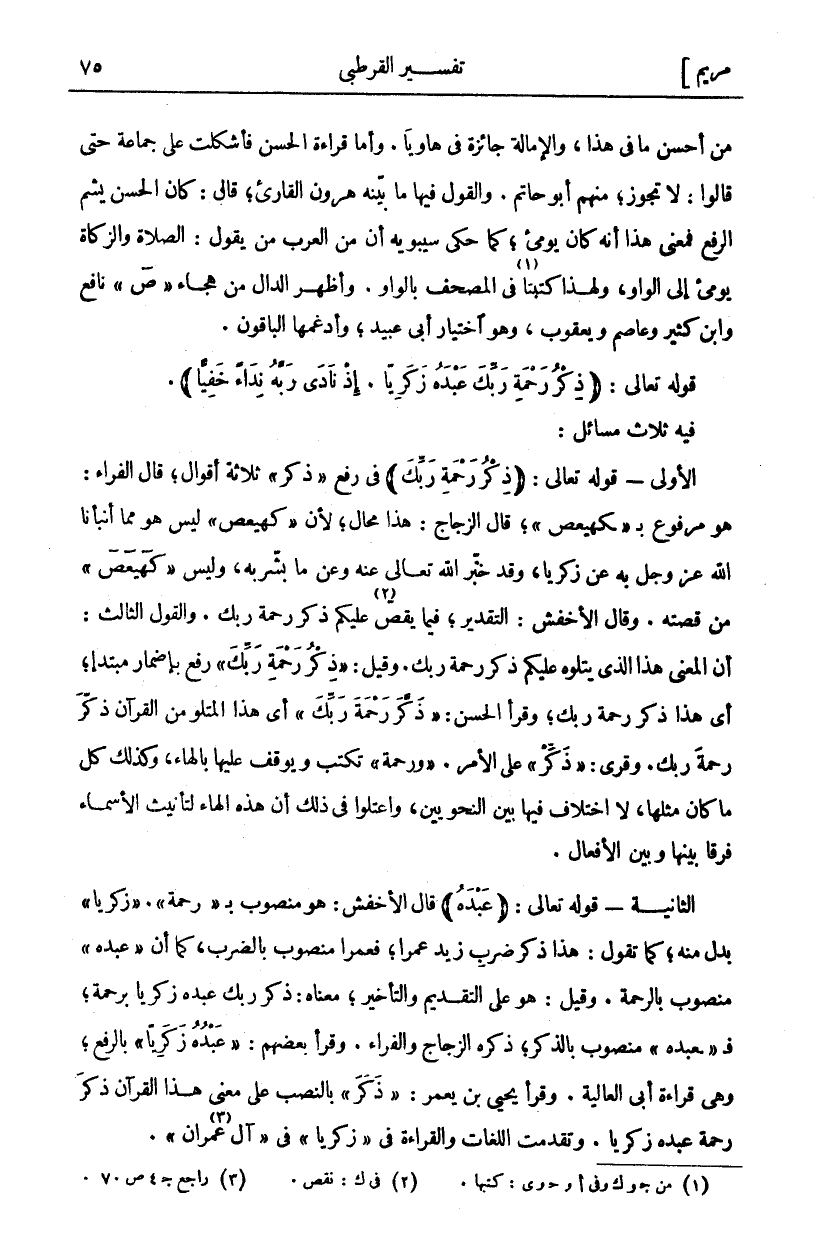 مِنْ أَحْسَنِ مَا فِي هَذَا، وَالْإِمَالَةُ جَائِزَةٌ في هاويا. وَأَمَّا قِرَاءَةُ الْحَسَنِ فَأَشْكَلَتْ عَلَى جَمَاعَةٍ حَتَّى قَالُوا: لَا تَجُوزُ، مِنْهُمْ أَبُو حَاتِمٍ. وَالْقَوْلُ فيها ما بينه هرون الْقَارِئُ، قَالَ: كَانَ الْحَسَنُ يُشِمُّ الرَّفْعَ فَمَعْنَى هَذَا أَنَّهُ كَانَ يُومِئُ، كَمَا حَكَى سِيبَوَيْهِ أَنَّ مِنَ الْعَرَبِ مَنْ يَقُولُ: الصَّلَاةُ وَالزَّكَاةُ يومئ إلى الواو، ولهذا كتبتا «١» فِي الْمُصْحَفِ بِالْوَاوِ. وَأَظْهَرَ الدَّالَّ مِنْ هِجَاءِ" ص" نَافِعٌ وَابْنُ كَثِيرٍ وَعَاصِمٌ وَيَعْقُوبُ، وَهُوَ اخْتِيَارُ أَبِي عُبَيْدٍ، وَأَدْغَمَهَا الْبَاقُونَ. قَوْلُهُ تَعَالَى: (ذِكْرُ رَحْمَتِ رَبِّكَ عَبْدَهُ زَكَرِيَّا. إِذْ نَادَى رَبَّهُ نِداءً خَفِيًّا). فِيهِ ثَلَاثُ مَسَائِلَ: الْأُولَى- قَوْلُهُ تَعَالَى:" ذِكْرُ رَحْمَتِ رَبِّكَ" فِي رَفْعِ" ذِكْرُ" ثَلَاثَةُ أَقْوَالٍ، قَالَ الْفَرَّاءُ: هُوَ مَرْفُوعٌ بِ"- كهيعص"، قَالَ الزَّجَّاجُ: هَذَا مُحَالٌ، لِأَنَّ" كهيعص" لَيْسَ هُوَ مِمَّا أَنْبَأَنَا اللَّهُ عَزَّ وَجَلَّ بِهِ عَنْ زَكَرِيَّا، وَقَدْ خَبَّرَ اللَّهُ تَعَالَى عَنْهُ وَعَنْ مَا بُشِّرَ بِهِ، وَلَيْسَ" كهيعص" مِنْ قِصَّتِهِ. وَقَالَ الْأَخْفَشُ: التَّقْدِيرُ، فِيمَا يُقَصُّ «٢» عَلَيْكُمْ ذِكْرُ رَحْمَةِ رَبِّكَ. وَالْقَوْلُ الثَّالِثُ: أَنَّ الْمَعْنَى هَذَا الَّذِي يَتْلُوهُ عَلَيْكُمْ ذِكْرُ رَحْمَةِ رَبِّكَ. وَقِيلَ:" ذِكْرُ رَحْمَتِ رَبِّكَ" رُفِعَ بِإِضْمَارِ مُبْتَدَأٍ، أَيْ هَذَا ذِكْرُ رحمة ربك، وقرا الحسن" ذكر رحمت رَبِّكَ" أَيْ هَذَا الْمَتْلُوُّ مِنَ الْقُرْآنِ ذَكَّرَ رحمة ربك. وقرى" ذَكِّرْ" عَلَى الْأَمْرِ." وَرَحْمَةُ" تُكْتَبُ وَيُوقَفُ عَلَيْهَا بِالْهَاءِ وَكَذَلِكَ كُلُّ مَا كَانَ مِثْلَهَا، لَا اخْتِلَافَ فِيهَا بَيْنَ النَّحْوِيِّينَ. وَاعْتَلُّوا فِي ذَلِكَ أَنَّ هَذِهِ الْهَاءَ لِتَأْنِيثِ الْأَسْمَاءِ فَرْقًا بَيْنَهَا وَبَيْنَ الْأَفْعَالِ. الثَّانِيَةُ- قَوْلُهُ تَعَالَى:" عَبْدَهُ" قَالَ الأخفش: هو منصوب ب"- رَحْمَتِ"." زَكَرِيَّا" بَدَلٌ مِنْهُ، كَمَا تَقُولُ: هَذَا ذِكْرُ ضَرْبِ زَيْدٍ عَمْرًا، فَعَمْرًا مَنْصُوبٌ بِالضَّرْبِ، كَمَا أَنَّ" عَبْدُهُ" مَنْصُوبٌ بِالرَّحْمَةِ. وَقِيلَ: هُوَ عَلَى التَّقْدِيمِ وَالتَّأْخِيرِ، مَعْنَاهُ: ذِكْرُ رَبِّكَ عَبْدَهُ زَكَرِيَّا بِرَحْمَةٍ، فَ"- عَبْدَهُ" مَنْصُوبٌ بِالذِّكْرِ، ذَكَرَهُ الزَّجَّاجُ وَالْفَرَّاءُ. وَقَرَأَ بَعْضُهُمْ" عَبْدُهُ زَكَرِيَّا" بِالرَّفْعِ، وَهِيَ قِرَاءَةُ أَبِي الْعَالِيَةِ. وَقَرَأَ يَحْيَى بْنُ يَعْمَرَ:" ذَكَرَ" بِالنَّصْبِ عَلَى مَعْنَى هَذَا الْقُرْآنُ ذَكَرَ رَحْمَةَ عَبْدِهِ زَكَرِيَّا. وَتَقَدَّمَتِ اللُّغَاتُ وَالْقِرَاءَةُ فِي" زكريا" في" آل عمران" «٣».