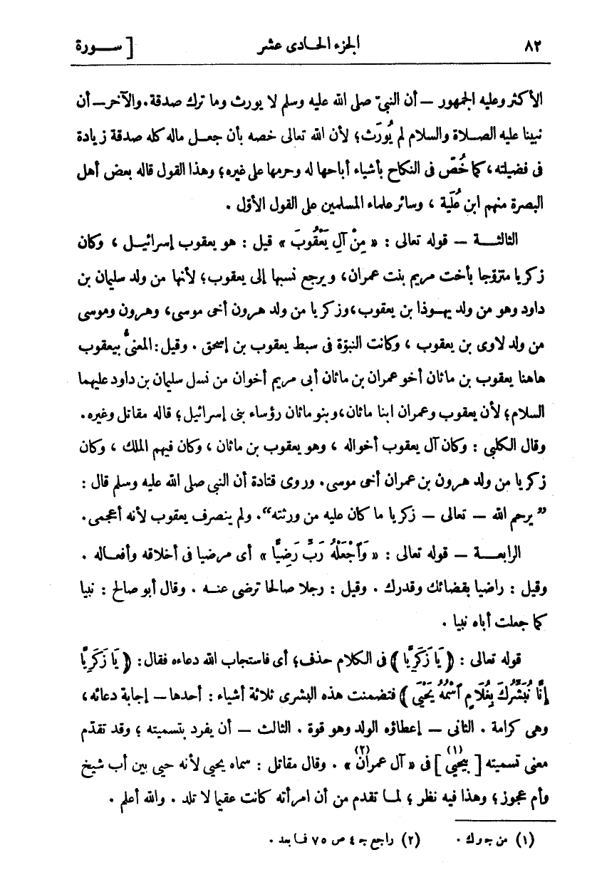 الْأَكْثَرُ وَعَلَيْهِ الْجُمْهُورُ- أَنَّ النَّبِيَّ صَلَّى اللَّهُ عَلَيْهِ وَسَلَّمَ لَا يُورَثُ وَمَا تَرَكَ صَدَقَةٌ. وَالْآخَرُ- أَنَّ نَبِيَّنَا عَلَيْهِ الصَّلَاةُ وَالسَّلَامُ لَمْ يُورَثْ، لِأَنَّ اللَّهَ تَعَالَى خَصَّهُ بِأَنْ جَعَلَ مَالَهُ كُلَّهُ صَدَقَةً زِيَادَةً فِي فَضِيلَتِهِ، كَمَا خُصَّ فِي النِّكَاحِ بِأَشْيَاءَ أَبَاحَهَا لَهُ وَحَرَّمَهَا عَلَى غَيْرِهِ، وَهَذَا الْقَوْلُ قَالَهُ بَعْضُ أَهْلِ الْبَصْرَةِ مِنْهُمُ ابْنُ عُلَيَّةَ، وَسَائِرُ عُلَمَاءِ الْمُسْلِمِينَ عَلَى الْقَوْلِ الْأَوَّلِ. الثَّالِثَةُ- قَوْلُهُ تَعَالَى:" مِنْ آلِ يَعْقُوبَ" قِيلَ: هُوَ يَعْقُوبُ بْنُ إِسْرَائِيلَ، وَكَانَ زَكَرِيَّا مُتَزَوِّجًا بِأُخْتِ مَرْيَمَ بِنْتِ عِمْرَانَ، وَيَرْجِعُ نَسَبُهَا إِلَى يَعْقُوبَ، لِأَنَّهَا مِنْ وَلَدِ سُلَيْمَانَ بْنِ دَاوُدَ وَهُوَ مِنْ وَلَدِ يَهُوذَا بن يعقوب، وزكريا من ولد هرون أخي موسى، وهرون وَمُوسَى مِنْ وَلَدِ لَاوِي بْنِ يَعْقُوبَ، وَكَانَتِ النُّبُوَّةُ فِي سِبْطِ يَعْقُوبَ بْنِ إِسْحَاقَ. وَقِيلَ: المعنى بيعقوب ها هنا يعقوب بن ما ثان أخو عمران بن ما ثان أَبِي مَرْيَمَ أَخَوَانِ مِنْ نَسْلِ سُلَيْمَانَ بْنِ دَاوُدَ عَلَيْهِمَا السَّلَامُ، لِأَنَّ يَعْقُوبَ وَعِمْرَانَ ابْنَا ما ثان، وبنو ما ثان رُؤَسَاءُ بَنِي إِسْرَائِيلَ، قَالَهُ مُقَاتِلٌ وَغَيْرُهُ. وَقَالَ الْكَلْبِيُّ: وَكَانَ آلُ يَعْقُوبَ أَخْوَالَهُ، وَهُوَ يَعْقُوبُ بن ما ثان، وَكَانَ فِيهِمُ الْمُلْكُ، وَكَانَ زَكَرِيَّا مِنْ وَلَدِ هرون بْنِ عِمْرَانَ أَخِي مُوسَى. وَرَوَى قَتَادَةَ أَنَّ النَّبِيَّ صَلَّى اللَّهُ عَلَيْهِ وَسَلَّمَ قَالَ: (يرحم اللَّهُ- تَعَالَى- زَكَرِيَّا مَا كَانَ عَلَيْهِ مِنْ وَرَثَتِهِ). وَلَمْ يَنْصَرِفْ يَعْقُوبُ لِأَنَّهُ أَعْجَمِيٌّ. الرَّابِعَةُ- قَوْلُهُ تَعَالَى:" وَاجْعَلْهُ رَبِّ رَضِيًّا" أَيْ مَرْضِيًّا فِي أَخْلَاقِهِ وَأَفْعَالِهِ. وَقِيلَ: رَاضِيًا بِقَضَائِكَ وَقَدَرِكَ. وَقِيلَ: رَجُلًا صَالِحًا تَرْضَى عَنْهُ. وَقَالَ أَبُو صَالِحٍ: نَبِيًّا كَمَا جَعَلْتَ أَبَاهُ نَبِيًّا. قَوْلُهُ تَعَالَى:" يَا زَكَرِيَّا" فِي الْكَلَامِ حَذْفٌ، أَيْ فَاسْتَجَابَ اللَّهُ دُعَاءَهُ فَقَالَ:" يَا زَكَرِيَّا إِنَّا نُبَشِّرُكَ بِغُلامٍ اسْمُهُ يَحْيى " فَتَضَمَّنَتْ هَذِهِ الْبُشْرَى ثَلَاثَةَ أَشْيَاءَ: أَحَدُهَا- إِجَابَةُ دُعَائِهِ، وَهِيَ كَرَامَةٌ. الثَّانِي- إِعْطَاؤُهُ الْوَلَدَ وَهُوَ قُوَّةٌ. الثَّالِثُ- أَنْ يفرد بتسميته، وقد تقدم معنى تسميته [بيحيى «١»] فِي" آلِ عِمْرَانَ" «٢». وَقَالَ مُقَاتِلٌ: سَمَّاهُ يَحْيَى لِأَنَّهُ حَيِيَ بَيْنَ أَبٍ شَيْخٍ وَأُمٍّ عَجُوزٍ، وَهَذَا فِيهِ نَظَرٌ، لِمَا تَقَدَّمَ مِنْ أَنَّ امْرَأَتَهُ كَانَتْ عَقِيمًا لَا تَلِدُ. وَاللَّهُ أَعْلَمُ.