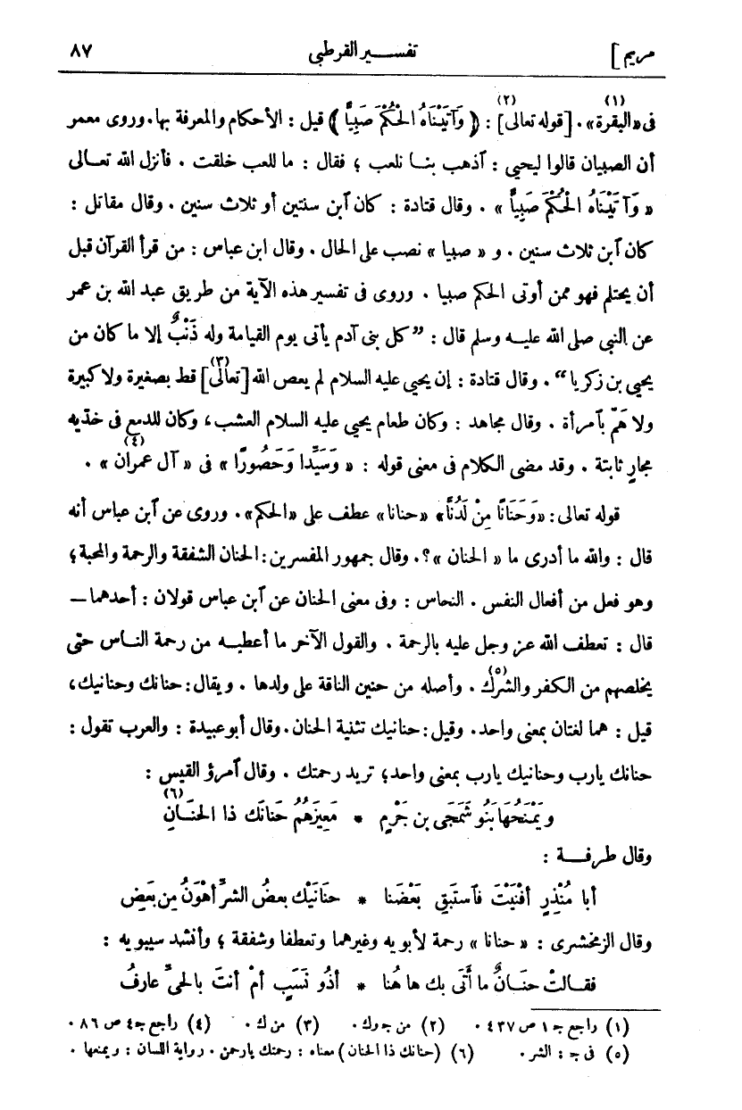 في" البقرة" «١». [قوله تعالى [«٢»: (وَآتَيْناهُ الْحُكْمَ صَبِيًّا) قِيلَ: الْأَحْكَامُ وَالْمَعْرِفَةُ بِهَا. وَرَوَى مَعْمَرٌ أَنَّ الصِّبْيَانَ قَالُوا لِيَحْيَى: اذْهَبْ بِنَا نَلْعَبْ، فَقَالَ: مَا لِلَعِبٍ خُلِقْتُ. فَأَنْزَلَ اللَّهُ تَعَالَى" وَآتَيْناهُ الْحُكْمَ صَبِيًّا". وَقَالَ قَتَادَةُ: كَانَ ابْنَ سَنَتَيْنِ أَوْ ثَلَاثِ سِنِينَ. وَقَالَ مُقَاتِلٌ: كَانَ ابْنَ ثَلَاثِ سِنِينَ. وَ" صَبِيًّا" نُصِبَ عَلَى الْحَالِ. وَقَالَ ابْنُ عَبَّاسٍ: مَنْ قَرَأَ الْقُرْآنَ قَبْلَ أَنْ يَحْتَلِمَ فَهُوَ مِمَّنْ أُوتِيَ الْحُكْمَ صَبِيًّا. وَرُوِيَ فِي تَفْسِيرِ هَذِهِ الْآيَةِ مِنْ طَرِيقِ عَبْدِ اللَّهِ بْنِ عُمَرَ عَنِ النَّبِيِّ صَلَّى اللَّهُ عَلَيْهِ وَسَلَّمَ قَالَ: (كُلُّ بَنِي آدَمَ يَأْتِي يَوْمَ الْقِيَامَةِ وَلَهُ ذَنْبٌ إِلَّا مَا كَانَ مِنْ يَحْيَى بْنِ زَكَرِيَّا). وَقَالَ قَتَادَةُ: إِنَّ يَحْيَى عَلَيْهِ السَّلَامُ لم يعص الله] تعالى [«٣» قَطُّ بِصَغِيرَةٍ وَلَا كَبِيرَةٍ وَلَا هَمَّ بِامْرَأَةٍ. وَقَالَ مُجَاهِدٌ: وَكَانَ طَعَامُ يَحْيَى عَلَيْهِ السَّلَامُ الْعُشْبَ، كَانَ لِلدَّمْعِ فِي خَدَّيْهِ مَجَارٍ ثَابِتَةٌ. وَقَدْ مَضَى الْكَلَامُ فِي مَعْنَى قَوْلِهِ:" وَسَيِّداً وَحَصُوراً" [آل عمران: ٣٩] فِي" آلِ عِمْرَانَ" «٤». قَوْلُهُ تَعَالَى: (وَحَناناً مِنْ لَدُنَّا) " حَنَانًا" عَطْفٌ عَلَى" الْحُكْمَ". وَرُوِيَ عَنِ ابْنِ عَبَّاسٍ أَنَّهُ قَالَ: وَاللَّهِ مَا أَدْرِي مَا" الْحَنَانُ"؟. وَقَالَ جُمْهُورُ الْمُفَسِّرِينَ: الْحَنَانُ الشَّفَقَةُ وَالرَّحْمَةُ وَالْمَحَبَّةُ، وَهُوَ فِعْلٌ مِنْ أَفْعَالِ النَّفْسِ. النَّحَّاسُ: وَفِي مَعْنَى الْحَنَانِ عَنِ ابْنِ عَبَّاسٍ قَوْلَانِ: أَحَدُهُمَا- قَالَ: تَعَطَّفَ اللَّهُ عَزَّ وَجَلَّ عَلَيْهِ بِالرَّحْمَةِ. وَالْقَوْلُ الْآخَرُ مَا أُعْطِيهِ مِنْ رَحْمَةِ النَّاسِ حَتَّى يُخَلِّصَهُمْ مِنَ الْكُفْرِ وَالشِّرْكِ «٥». وَأَصْلُهُ مِنْ حَنِينِ النَّاقَةِ عَلَى وَلَدِهَا. وَيُقَالُ: حَنَانَكَ وَحَنَانَيْكَ، قِيلَ: هُمَا لُغَتَانِ بِمَعْنًى وَاحِدٍ. وَقِيلَ: حَنَانَيْكَ تَثْنِيَةُ الْحَنَانِ. وَقَالَ أَبُو عُبَيْدَةَ: وَالْعَرَبُ تَقُولُ: حَنَانَكَ يَا رَبِّ وَحَنَانَيْكَ يَا رَبِّ بِمَعْنًى وَاحِدٍ، تُرِيدُ رَحْمَتَكَ. وَقَالَ امْرُؤُ الْقَيْسِ: