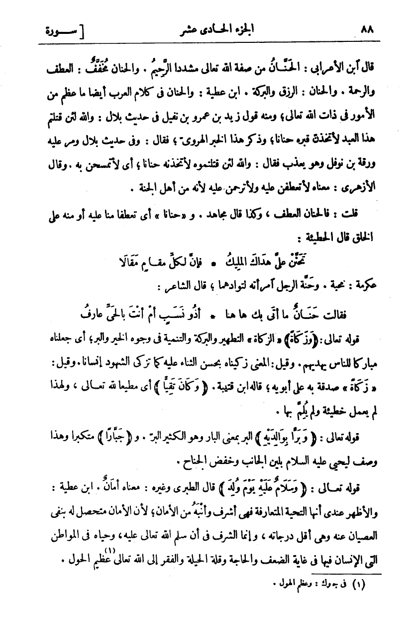 قَالَ ابْنُ الْأَعْرَابِيِّ: الْحَنَّانُ مِنْ صِفَةِ اللَّهِ تَعَالَى مُشَدَّدًا الرَّحِيمُ. وَالْحَنَانُ مُخَفَّفٌ: الْعَطْفُ وَالرَّحْمَةُ. وَالْحَنَانُ: الرِّزْقُ وَالْبَرَكَةُ. ابْنُ عَطِيَّةَ: وَالْحَنَانُ فِي كَلَامِ الْعَرَبِ أَيْضًا مَا عَظُمَ مِنَ الْأُمُورِ فِي ذَاتِ اللَّهِ تَعَالَى، وَمِنْهُ قَوْلُ زَيْدِ بْنِ عَمْرِو بْنِ نُفَيْلٍ فِي حَدِيثِ بِلَالٍ: وَاللَّهِ لَئِنْ قَتَلْتُمْ هَذَا الْعَبْدَ لَأَتَّخِذَنَّ قَبْرَهُ حَنَانًا، وَذَكَرَ هَذَا الْخَبَرَ الْهَرَوِيُّ، فَقَالَ: وَفِي حَدِيثِ بِلَالٍ وَمَرَّ عَلَيْهِ وَرَقَةُ بْنُ نَوْفَلٍ وَهُوَ يُعَذَّبُ فَقَالَ: وَاللَّهِ لَئِنْ قَتَلْتُمُوهُ لَأَتَّخِذَنَّهُ حنانا، أي لا تمسحن به. وقال الأزهري: معناه لا تعطفن عليه ولا ترحمن عَلَيْهِ لِأَنَّهُ مِنْ أَهْلِ الْجَنَّةِ. قُلْتُ: فَالْحَنَانُ الْعَطْفُ، وَكَذَا قَالَ مُجَاهِدٌ. وَ" حَناناً" أَيْ تَعَطُّفًا مِنَّا عَلَيْهِ أَوْ مِنْهُ عَلَى الْخَلْقِ، قَالَ الْحُطَيْئَةُ: