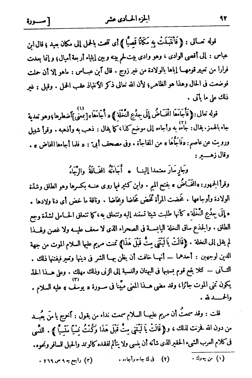 وَقَرَأَ الْجُمْهُورُ" الْمَخاضُ" بِفَتْحِ الْمِيمِ. وابْنُ كَثِيرٍ فِيمَا رُوِيَ عَنْهُ بِكَسْرِهَا وَهُوَ الطَّلْقُ وَشِدَّةُ الْوِلَادَةِ وَأَوْجَاعُهَا. مَخِضَتِ الْمَرْأَةُ تَمْخَضُ مَخَاضًا وَمِخَاضًا. وَنَاقَةٌ مَاخِضٌ أَيْ دَنَا وِلَادُهَا." إِلى جِذْعِ النَّخْلَةِ" كَأَنَّهَا طَلَبَتْ شَيْئًا تَسْتَنِدُ إِلَيْهِ وَتَتَعَلَّقُ بِهِ، كَمَا تَتَعَلَّقُ الْحَامِلُ لِشِدَّةِ وَجَعِ الطَّلْقِ. وَالْجِذْعُ سَاقُ النَّخْلَةِ الْيَابِسَةِ فِي الصَّحْرَاءِ الَّذِي لَا سَعَفَ عَلَيْهِ وَلَا غُصْنَ وَلِهَذَا لَمْ يَقُلْ إِلَى النَّخْلَةِ. (قالَتْ يَا لَيْتَنِي مِتُّ قَبْلَ هَذَا) تَمَنَّتْ مَرْيَمُ عَلَيْهَا السَّلَامُ الْمَوْتَ مِنْ جِهَةِ الدِّينِ لِوَجْهَيْنِ: أَحَدُهُمَا- أَنَّهَا خَافَتْ أَنْ يُظَنَّ بِهَا الشَّرُّ فِي دِينِهَا وَتُعَيَّرَ فَيَفْتِنُهَا ذَلِكَ. الثَّانِي- لِئَلَّا يَقَعَ قَوْمٌ بِسَبَبِهَا فِي الْبُهْتَانِ وَالنِّسْبَةِ إِلَى الزنى وَذَلِكَ مُهْلِكٌ. وَعَلَى هَذَا الْحَدِّ يَكُونُ تَمَنِّي الْمَوْتِ جَائِزًا، وَقَدْ مَضَى هَذَا الْمَعْنَى مُبَيَّنًا فِي سُورَةِ" يُوسُفَ" «٣» عَلَيْهِ السَّلَامُ. وَالْحَمْدُ لِلَّهِ. قُلْتُ: وَقَدْ سَمِعْتُ أَنَّ مَرْيَمَ عَلَيْهَا السَّلَامُ سَمِعَتْ نِدَاءَ مَنْ يَقُولُ: اخْرُجْ يَا مَنْ يُعْبَدُ مِنْ دُونِ اللَّهِ فَحَزِنَتْ لِذَلِكَ، وَ (قالَتْ يَا لَيْتَنِي مِتُّ قَبْلَ هَذَا وَكُنْتُ نَسْياً مَنْسِيًّا). النِّسْيُ فِي كَلَامِ الْعَرَبِ الشَّيْءُ الْحَقِيرُ الَّذِي شَأْنُهُ أَنْ يُنْسَى وَلَا يُتَأَلَّمُ لفقده كالوتد والحبل للمسافر ونحوه.