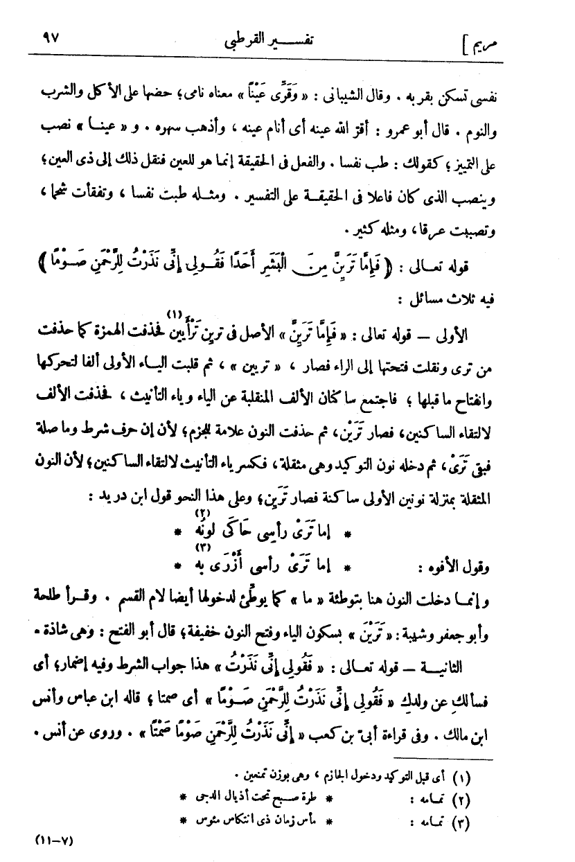 وَإِنَّمَا دَخَلَتِ النُّونُ هُنَا بِتَوْطِئَةِ" مَا" كَمَا يُوَطِّئُ لِدُخُولِهَا أَيْضًا لَامُ الْقَسَمِ. وَقَرَأَ طَلْحَةُ وَأَبُو جَعْفَرٍ وَشَيْبَةُ" تَرَيْنَ" بِسُكُونِ الْيَاءِ وَفَتْحِ النُّونِ خَفِيفَةً، قَالَ أَبُو الْفَتْحِ: وَهِيَ شَاذَّةٌ. الثَّانِيَةُ- قَوْلُهُ تَعَالَى:" فَقُولِي إِنِّي نَذَرْتُ" هَذَا جَوَابُ الشَّرْطِ وَفِيهِ إِضْمَارٌ، أَيْ فَسَأَلَكِ عَنْ وَلَدِكِ" فَقُولِي إِنِّي نَذَرْتُ لِلرَّحْمنِ صَوْماً" أَيْ صَمْتًا، قَالَهُ ابْنُ عباس وأنس ابن مَالِكٍ. وَفِي قِرَاءَةِ أُبَيِّ بْنِ كَعْبٍ" إِنِّي نَذَرْتُ لِلرَّحْمَنِ صَوْمًا صَمْتًا" وَرُوِيَ عَنْ أَنَسٍ.