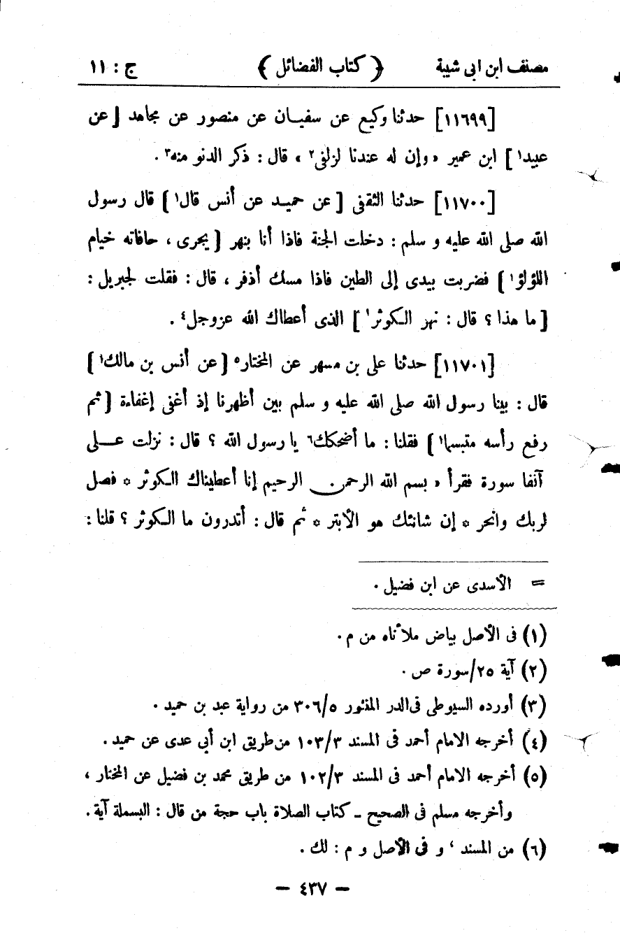 32312- حَدَّثَنَا عَلِيُّ بْنُ مُسْهِرٍ ، عَنِ الْمُخْتَارِ ، عَنْ أَنَسِ بْنِ مَالِكٍ ، قَالَ : بَيْنَا رَسُولُ اللهِ صلى الله عليه وسلم بَيْنَ أَظْهُرِنَا إذْ أَغْفَى إغْفَاءَةً ، ثُمَّ رَفَعَ رَأْسَهُ مُتَبَسِّمًا فَقُلْنَا : مَا لَكَ يَا رَسُولَ اللهِ ؟ قَالَ : نَزَلَتْ عَلَيَّ آنِفًا سُورَةٌ ، فَقَرَأَ بسم الله الرَّحْمَن الرحيم : {إنَّا أَعْطَيْنَاك الْكَوْثَرَ فَصَلِّ لِرَبِّكَ وَانْحَرْ إنَّ شَانِئَك هُوَ الأَبْتَرُ} ثُمَّ قَالَ : أَتَدْرُونَ مَا الْكَوْثَرُ ؟ قُلْنَا : اللَّهُ وَرَسُولُهُ أَعْلَمُ ، قَالَ : فَإِنَّهُ نَهْرٌ وَعَدَنِيهِ رَبِّي , عَلَيْهِ خَيْرٌ كَثِيرٌ, هُوَ حَوْضٌ تَرِدُ عَلَيْهِ يَوْمَ الْقِيَامَةِ أُمَّتِي , آنِيَتُهُ عَدَدُ النُّجُومِ , فَيُخْتَلَجُ الْعَبْدُ مِنْهُمْ فَأَقُولُ : رَبِّ إِنَّهُ مِنْ أَصْحَابِي , فَيَقُولُ : لاَ , إنَّك لاَ تَدْرِي مَا أَحْدَثَ بَعْدَك.