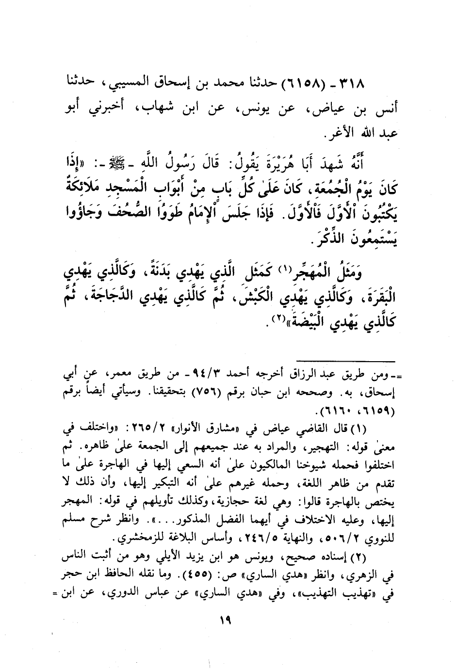 6158 - حَدَّثَنَا مُحَمَّدُ بْنُ إِسْحَاقَ الْمُسَيَّبِيُّ، حَدَّثَنَا أَنَسُ بْنُ عِيَاضٍ، عَنْ يُونُسَ، عَنِ ابْنِ شِهَابٍ، أَخْبَرَنِي أَبُو عَبْدِ اللَّهِ الْأَغَرُّ، أَنَّهُ شَهِدَ أَبَا هُرَيْرَةَ يَقُولُ: قَالَ رَسُولُ اللَّهِ صَلَّى اللهُ عَلَيْهِ وَسَلَّمَ: «§إِذَا كَانَ يَوْمُ الْجُمُعَةِ كَانَ عَلَى كُلِّ بَابٍ مِنْ أَبْوَابِ الْمَسْجِدِ مَلَائِكَةٌ يَكْتُبُونَ الْأَوَّلَ، فَالْأَوَّلَ فَإِذَا جَلَسَ الْإِمَامُ طَوَوُا الصُّحُفَ وَجَاءُوا يَسْتَمِعُونَ الذِّكْرَ، وَمَثَلُ الْمُهَجِّرِ كَمَثَلِ الَّذِي يُهْدِي بَدَنَةً وَكَالَّذِي يُهْدِي الْبَقَرَةَ وَكَالَّذِي يُهْدِي الْكَبْشَ ثُمَّ كَالَّذِي يُهْدِي الدَّجَاجَةَ، ثُمَّ كَالَّذِي يُهْدِي الْبَيْضَةَ» Kإسناده صحيح