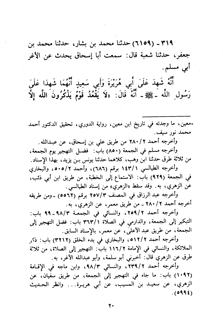 6159 - حَدَّثَنَا مُحَمَّدُ بْنُ بَشَّارٍ، حَدَّثَنَا مُحَمَّدُ بْنُ جَعْفَرٍ، حَدَّثَنَا شُعْبَةُ قَالَ: سَمِعْتُ أَبَا إِسْحَاقَ يُحَدِّثُ عَنِ الْأَغَرِّ أَبِي مُسْلِمٍ، أَنَّهُ شَهِدَ عَلَى أَبِي هُرَيْرَةَ، وَأَبِي سَعِيدٍ أَنَّهُمَا شَهِدَا عَلَى رَسُولِ اللَّهِ صَلَّى اللهُ عَلَيْهِ وَسَلَّمَ أَنَّهُ قَالَ: «§لَا يَقْعُدُ قَوْمٌ يَذْكُرُونَ اللَّهَ إِلَّا حَفَّتْهُمُ الْمَلَائِكَةُ، وَغَشِيَتْهُمُ الرَّحْمَةُ، وَتَنَزَّلَتْ عَلَيْهِمِ السَّكِينَةُ، وَذَكَّرَهُمُ اللَّهُ فِيمَنْ عِنْدَهُ» Kإسناده صحيح