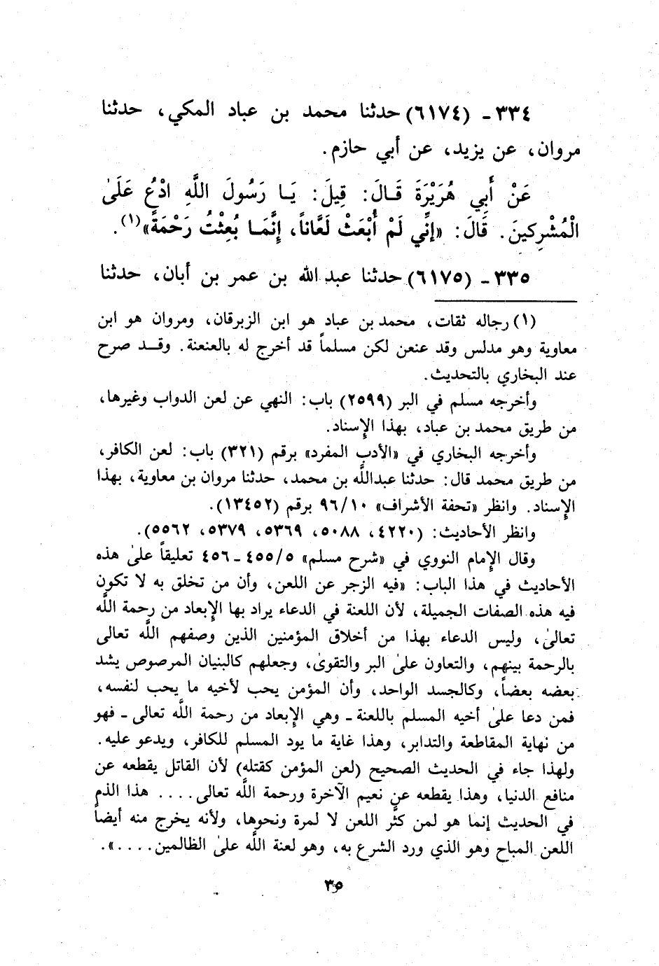 6174 - حَدَّثَنَا مُحَمَّدُ بْنُ عَبَّادٍ الْمَكِّيُّ، حَدَّثَنَا مَرْوَانُ، عَنْ يَزِيدَ، عَنْ أَبِي حَازِمٍ، عَنْ أَبِي هُرَيْرَةَ قَالَ: قِيلَ: يَا رَسُولَ اللَّهِ ادْعُ عَلَى الْمُشْرِكِينَ، قَالَ: «§إِنِّي لَمْ أُبْعَثْ لَعَّانًا، إِنَّمَا بُعِثْتُ رَحْمَةً» Kرجاله ثقات